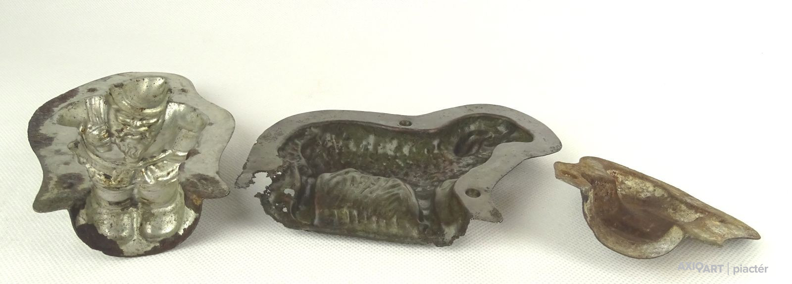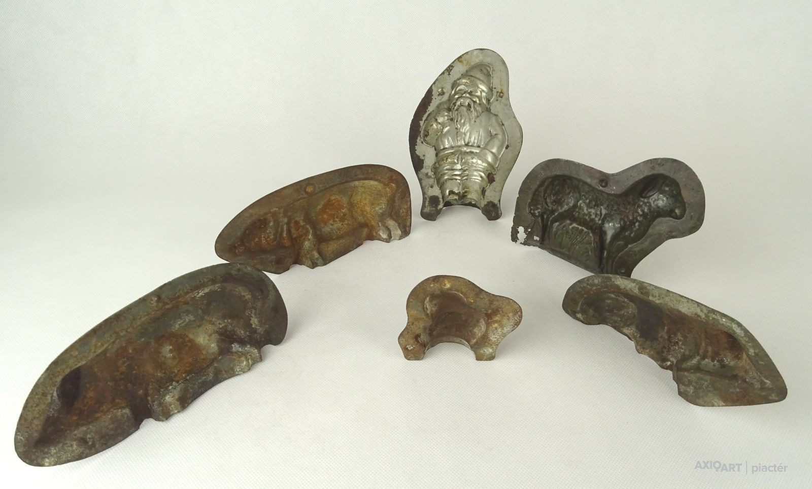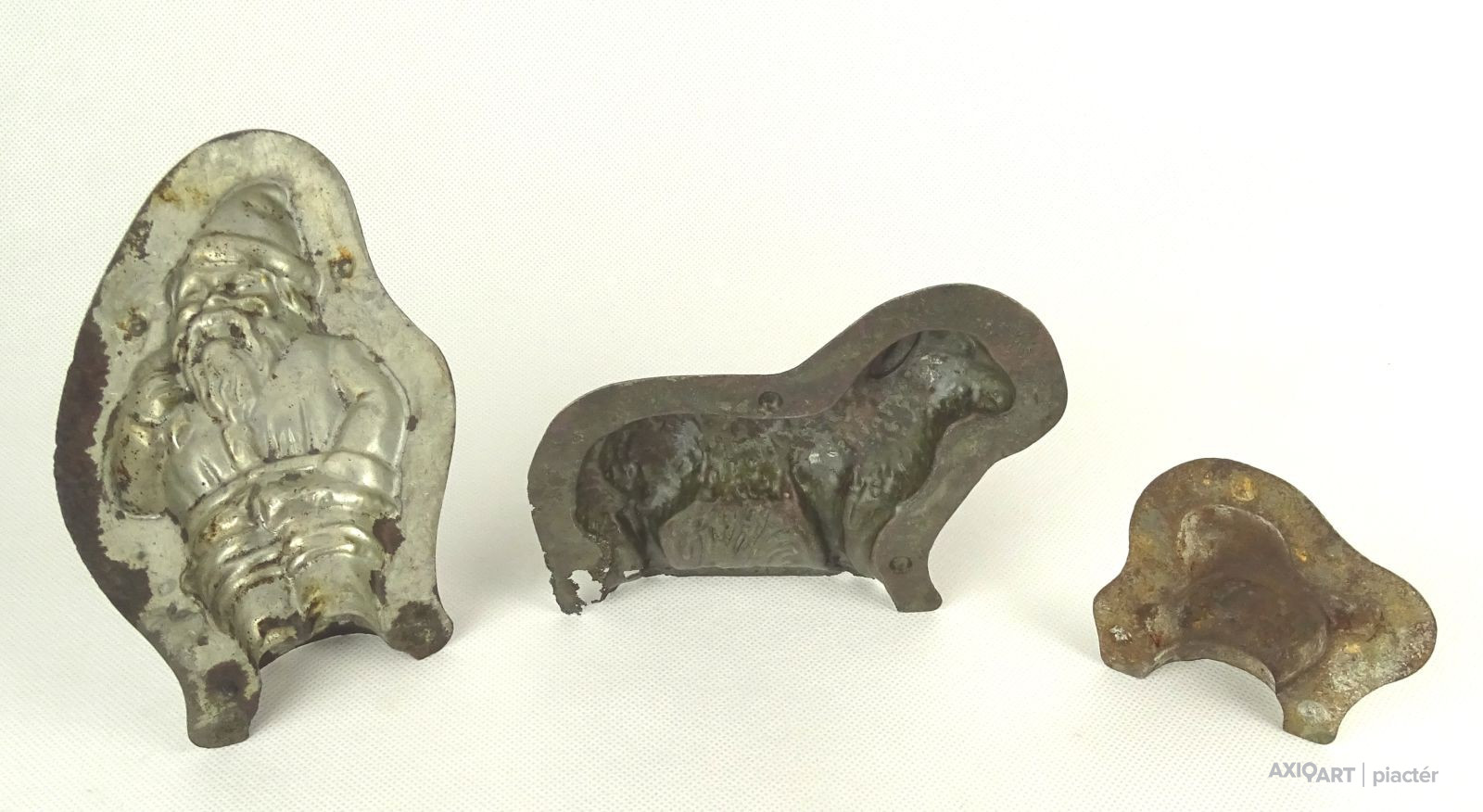 [1G107/X040] Antik, vegyes, csoki öntő forma, cukrászati eszköz. Méretek: - 3 db újévi malac 16.5 x 8 x 2 cm, 15.8 x 8 x 2 cm, 15 x 8 x 2 cm - 1 bárány 13 x 10.5 x 1 cm - 1 kacsa 7.5 x 7.5 x 1 cm - 1 Mikulás 9 x 15 x 2 cm Súly: 0.282 kg