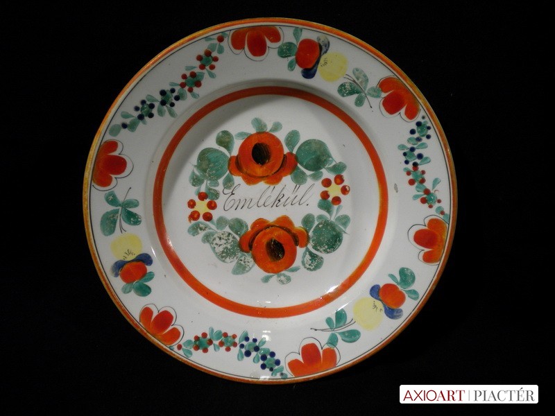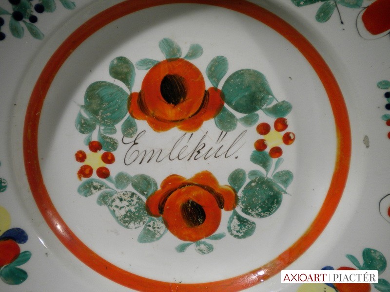[R416/UZ-N] Antik jelzett porcelán fali tányér, feliratos: EMLÉKÜL Gazdagon díszített, kézi festésű fali dísz tányér. Alján mélynyomású márkajelzés, lásd fotó. Felületén egy apró máz lepattanás látható, enyhén karcos, nem jelentős. Szélesség: 22 cm