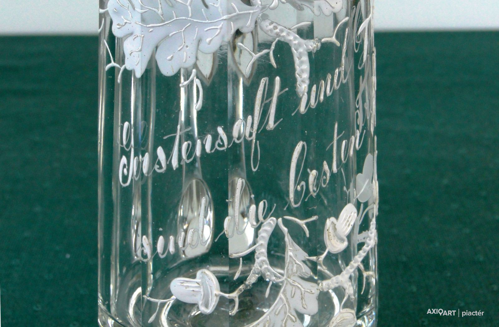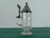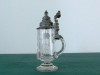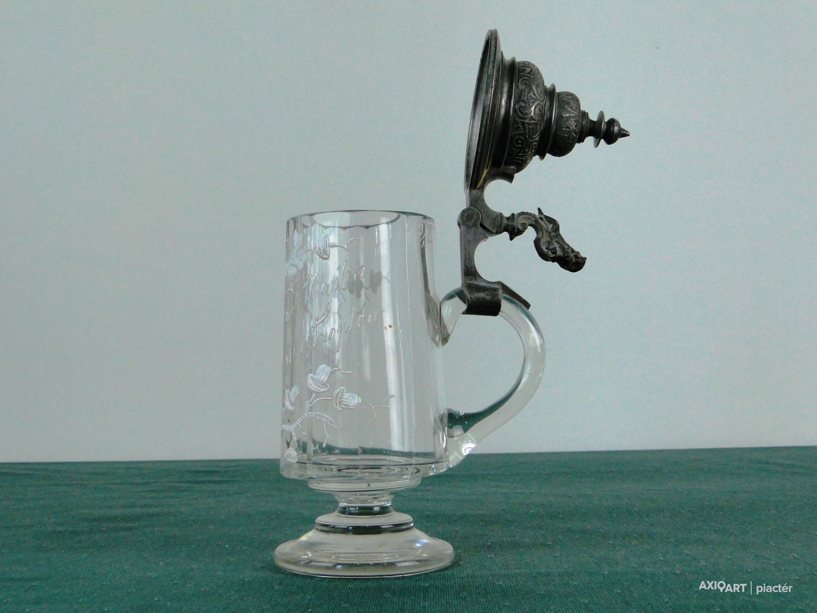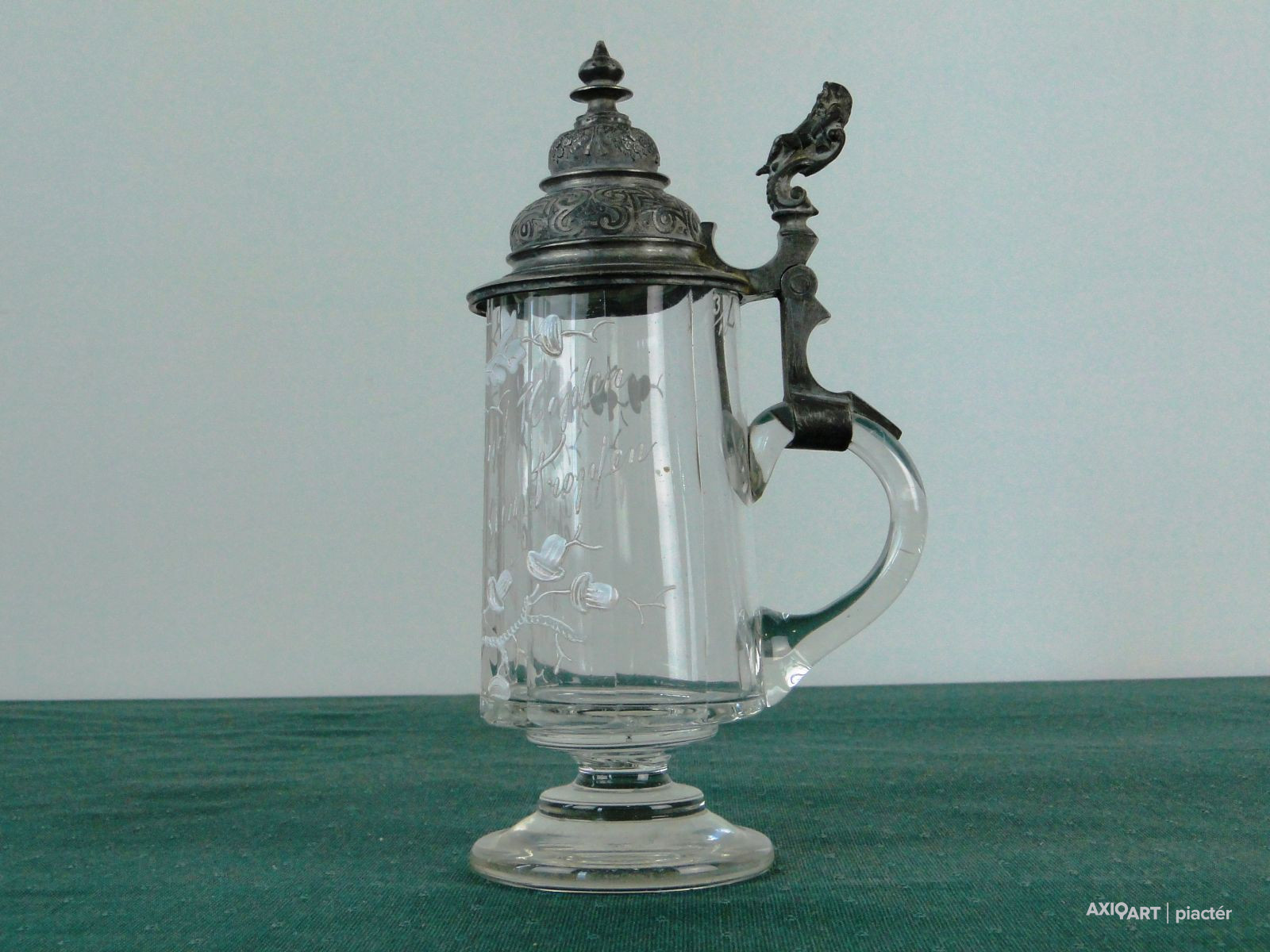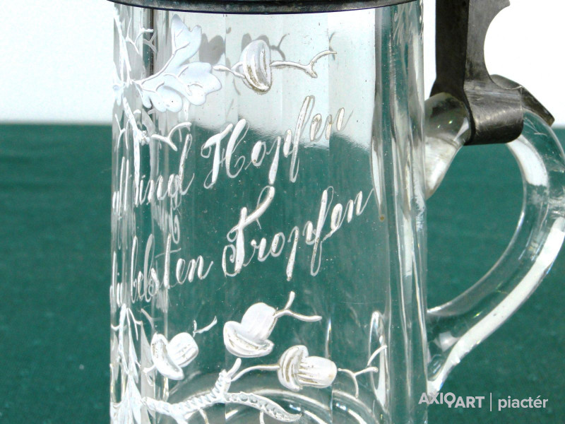 [0G115/UZ-K] Hibátlan állapotú, talpas üveg ónfedeles korsó az 1800-as évek végéről. Oldalán német nyelvű felirat fehérrel: GESTENSAFT UND HOPFEN SIND DIE BESTEN TROPFEN Peremén hitelesítési jelzés, felirat: 3/10 L Magasság: 22 cm Szélesség: 7.5 cm Súly: 0.711 kg   Méret: 14 cm magas, az ón füllel együtt 17,5 cm magas, átmérője 8,5 cm (alul).