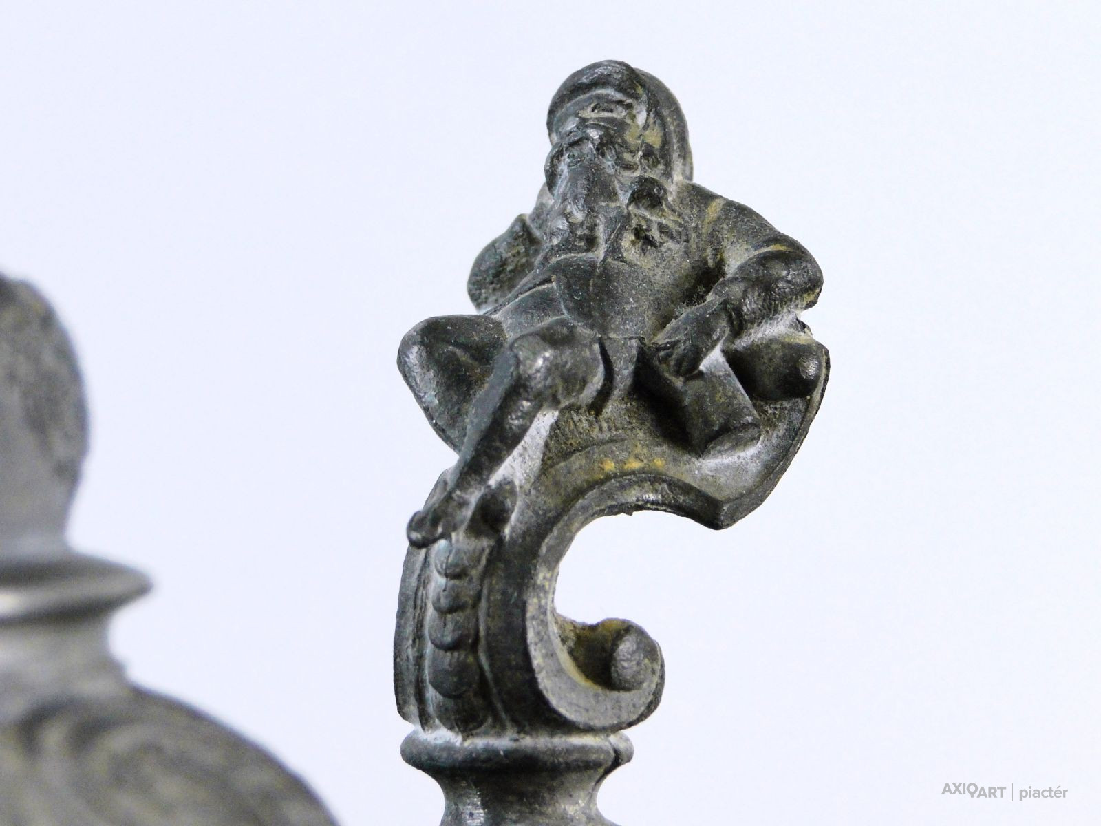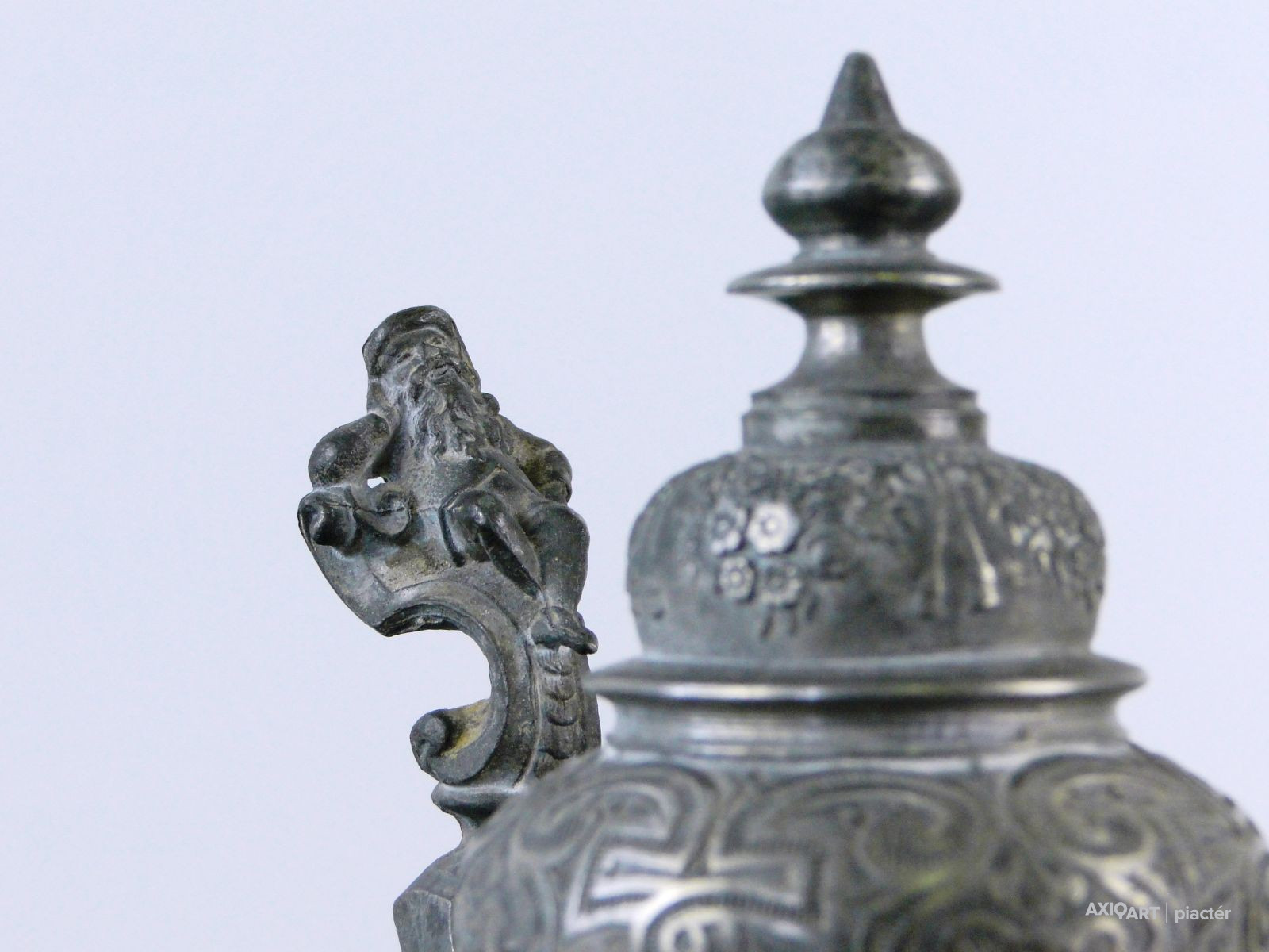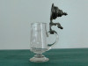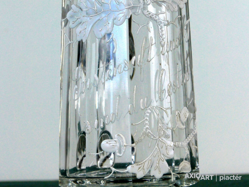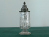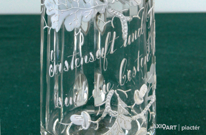 [0G115/UZ-K] Hibátlan állapotú, talpas üveg ónfedeles korsó az 1800-as évek végéről. Oldalán német nyelvű felirat fehérrel: GESTENSAFT UND HOPFEN SIND DIE BESTEN TROPFEN Peremén hitelesítési jelzés, felirat: 3/10 L Magasság: 22 cm Szélesség: 7.5 cm Súly: 0.711 kg   Méret: 14 cm magas, az ón füllel együtt 17,5 cm magas, átmérője 8,5 cm (alul).