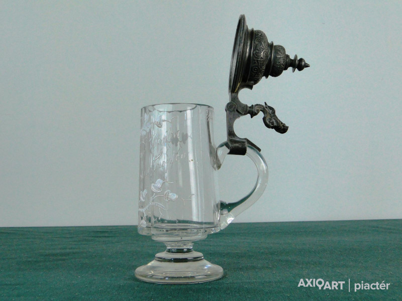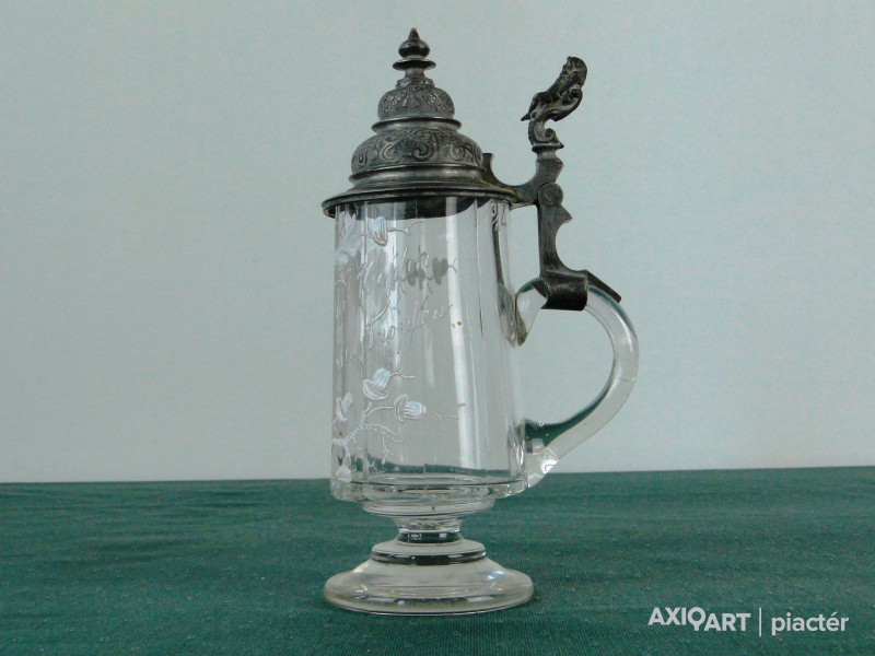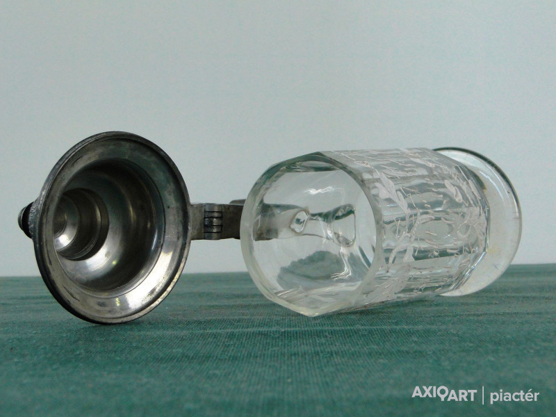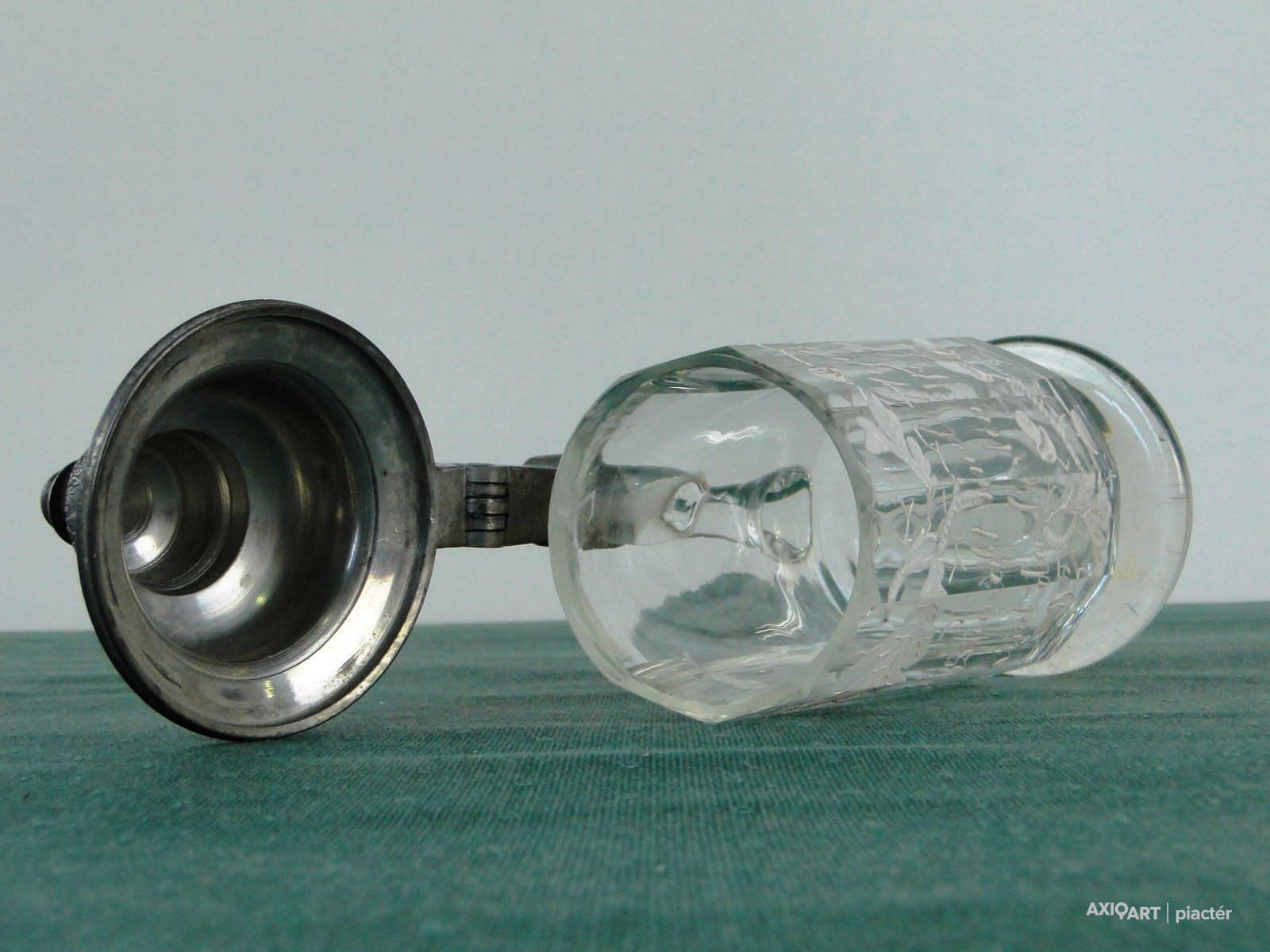 Hibátlan állapotú, talpas üveg ónfedeles korsó az 1800-as évek végéről.