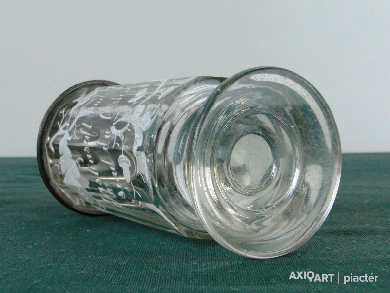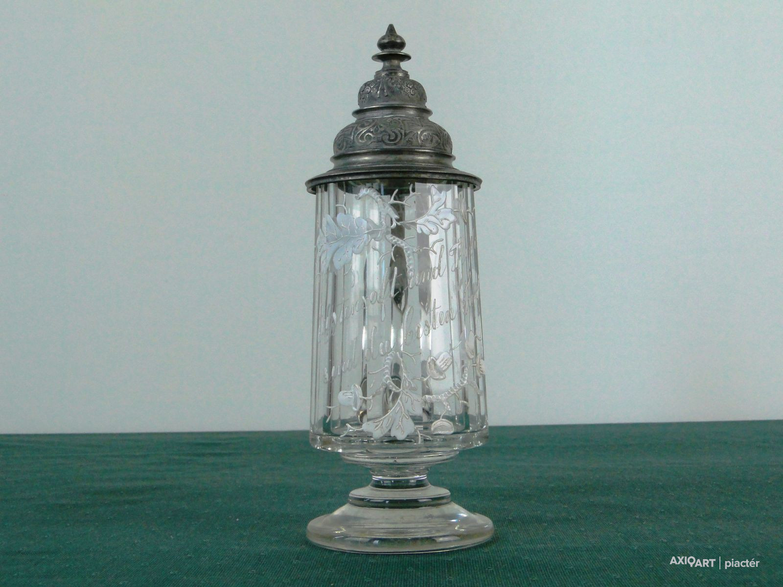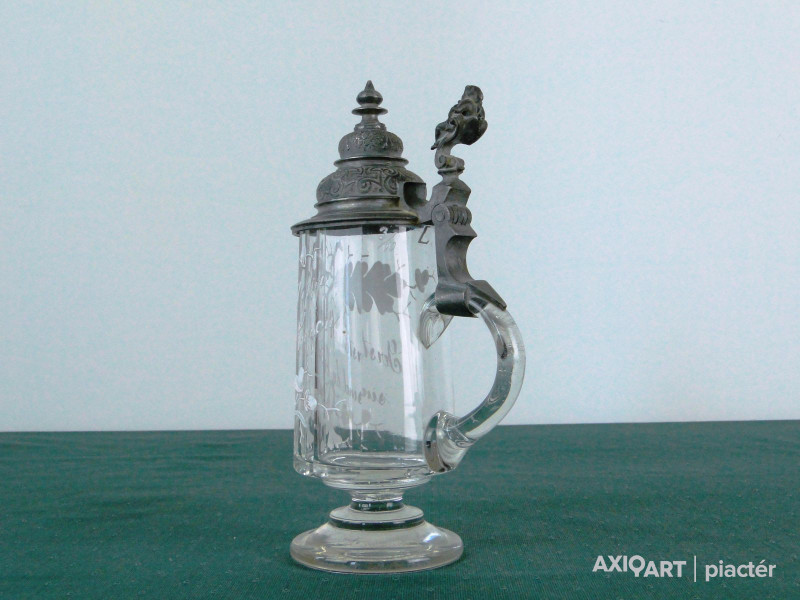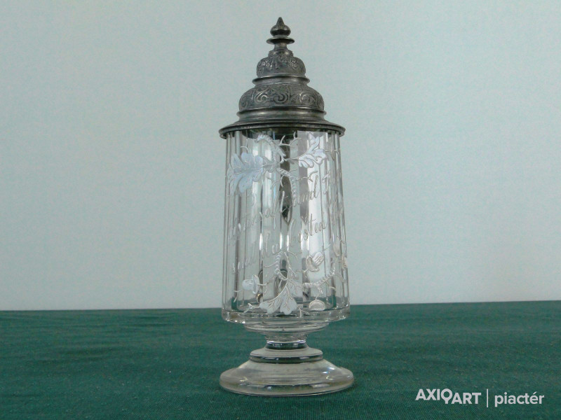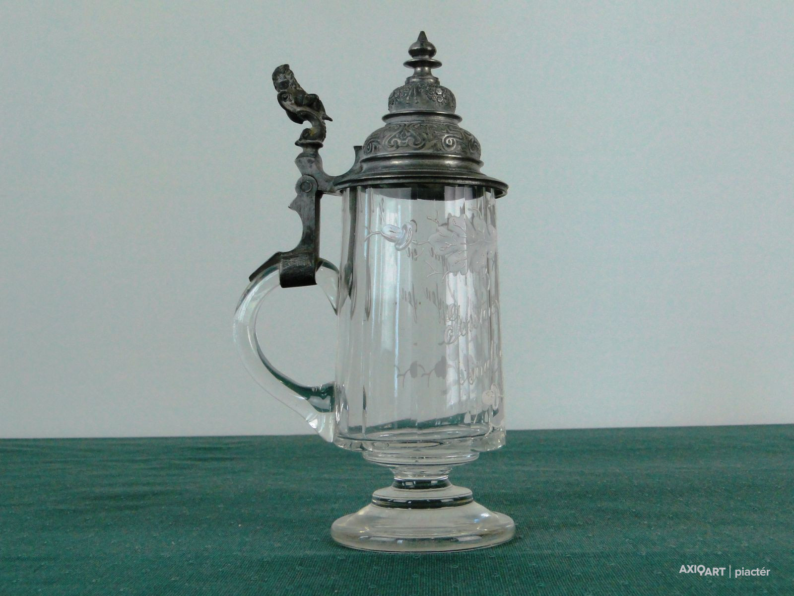 Hibátlan állapotú, talpas üveg ónfedeles korsó az 1800-as évek végéről.
