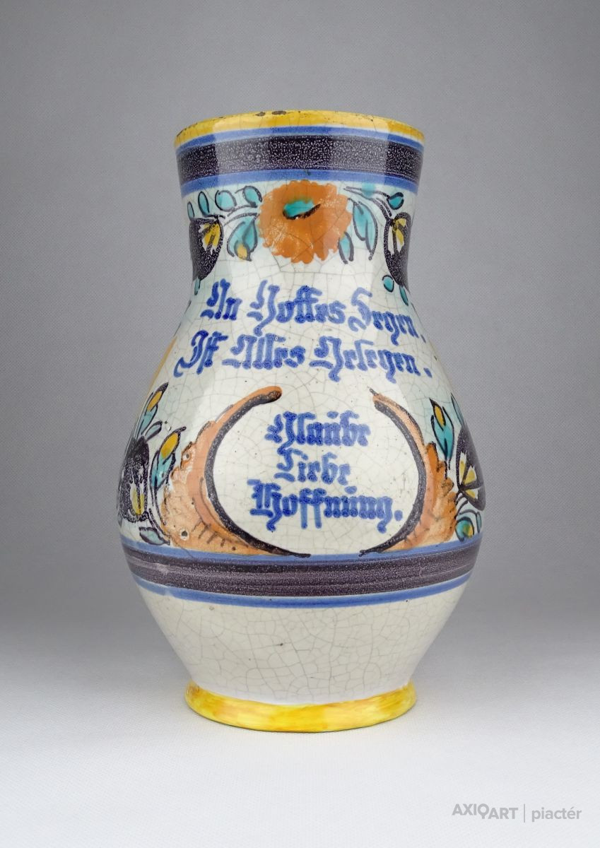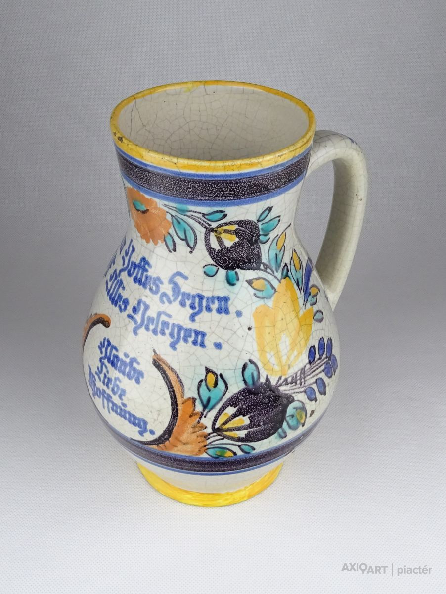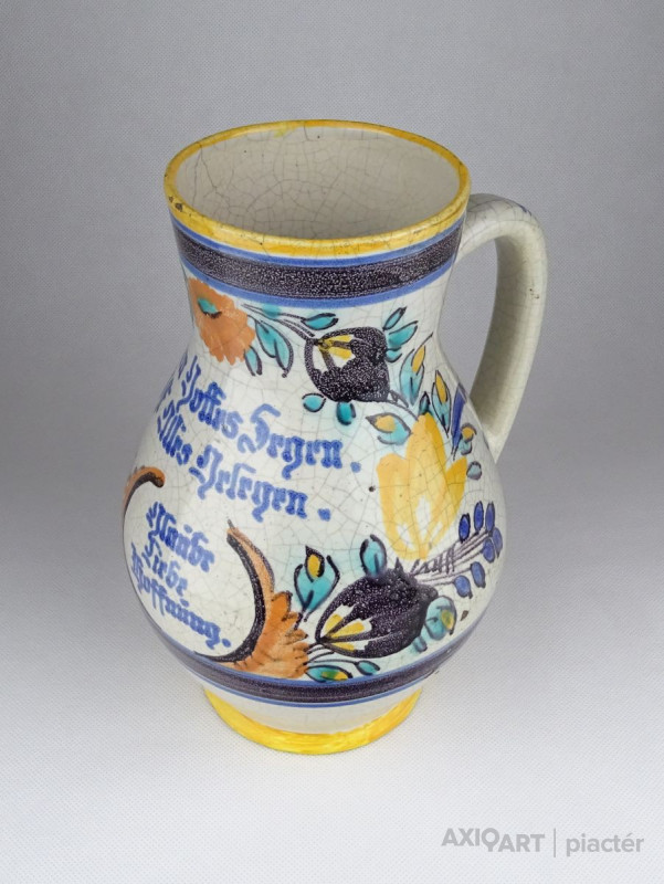 [0W458/UZ-N] Antik, szép állapotú, nagyméretű kancsó, bokály. Oldalán nehezen olvasható gótbetűs felirat: IN HOFFES SEGEN AUF ... HELEGEN (?) ...HOFFNUNG Magasság: 22 cm Szélesség: 13.5 cm Súly: 0.76 kg