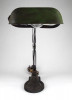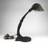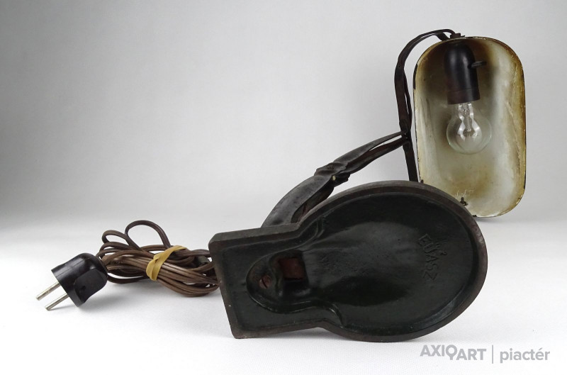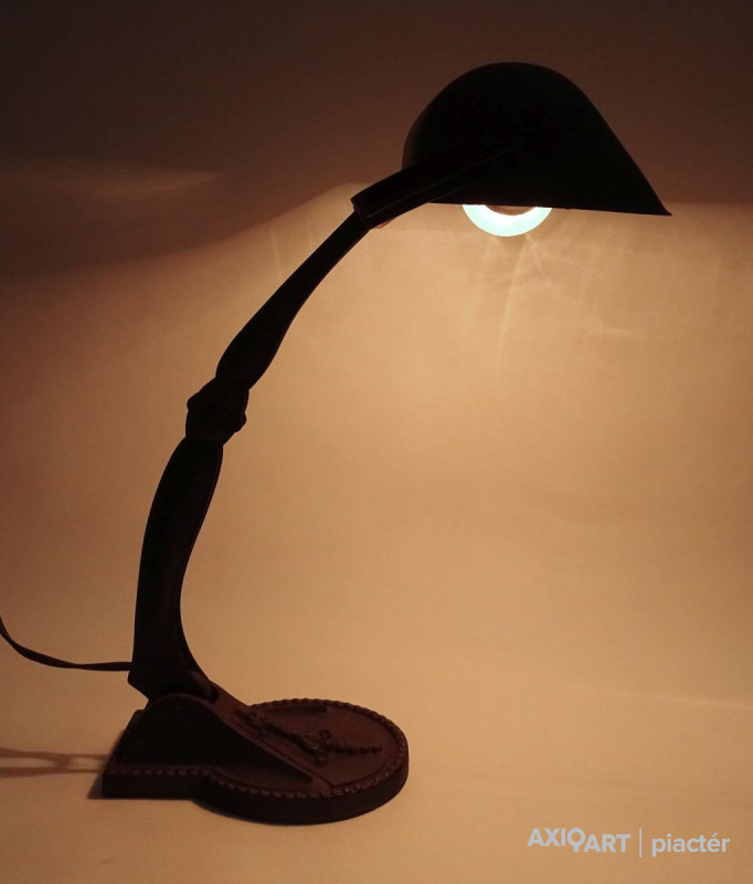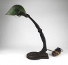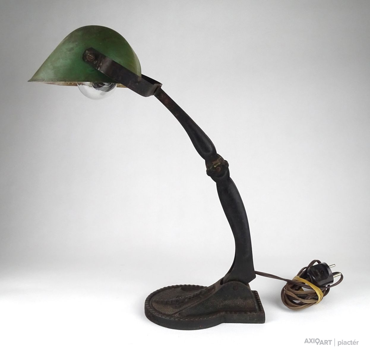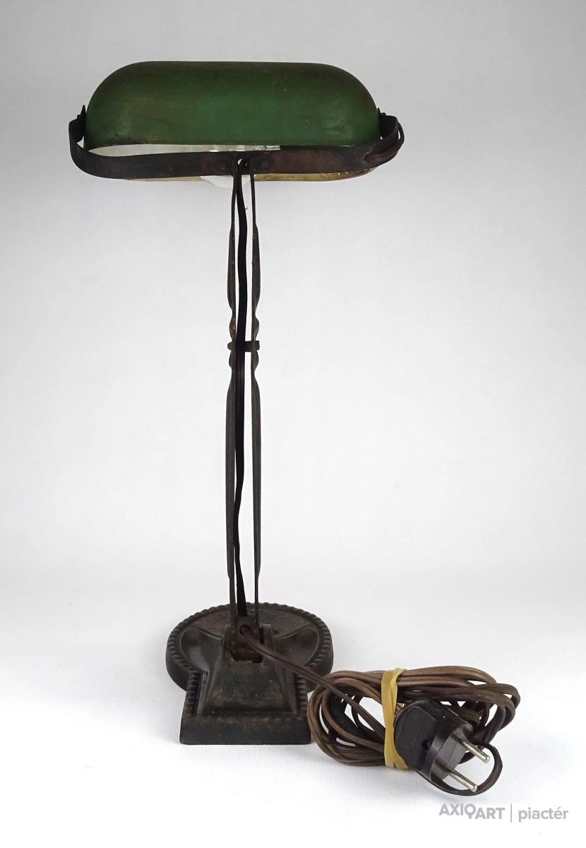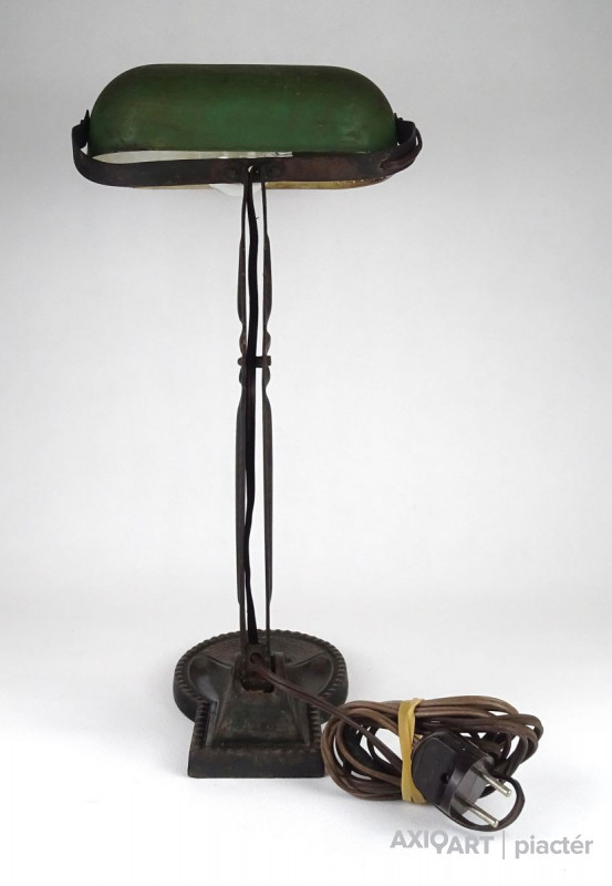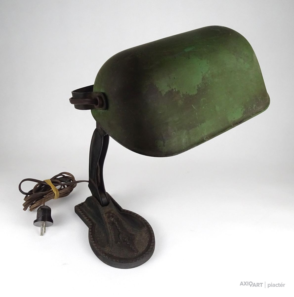 Nagyon régi működő állapotban lévő szecessziós díszítésű öntöttvas fém talpas méregzöld színű fém burás banklámpa, íróasztali lámpa. A lámpa burája zománcozott. A lámpa át vezetékelése ajánlott.