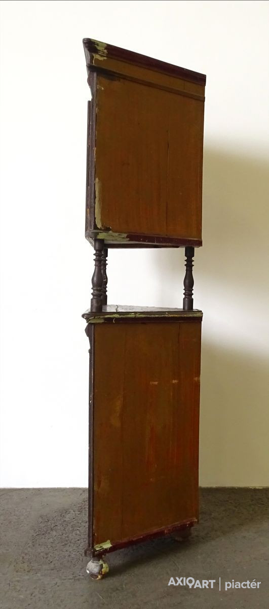 Antik sarokszekrény, fenyőbútor. Sarok vitrin, téka. Elemeire szedhető. Barna színű, többszörösen festett, felújítandó fenyőbútor.