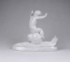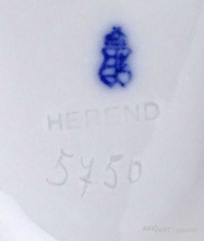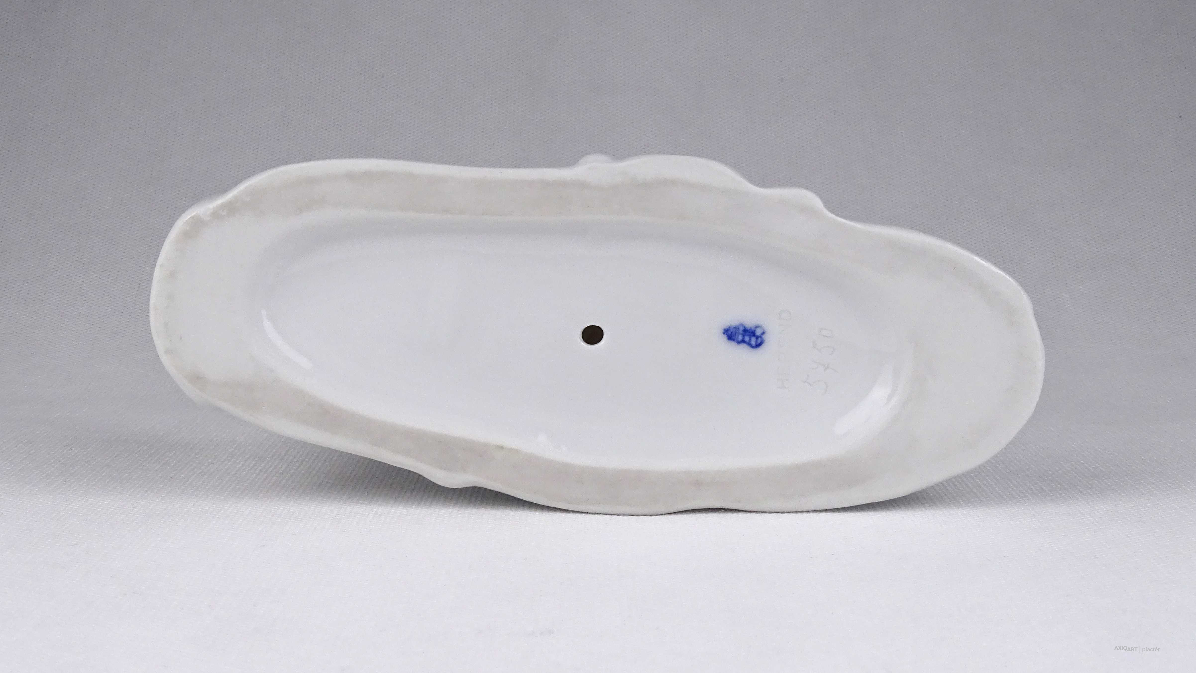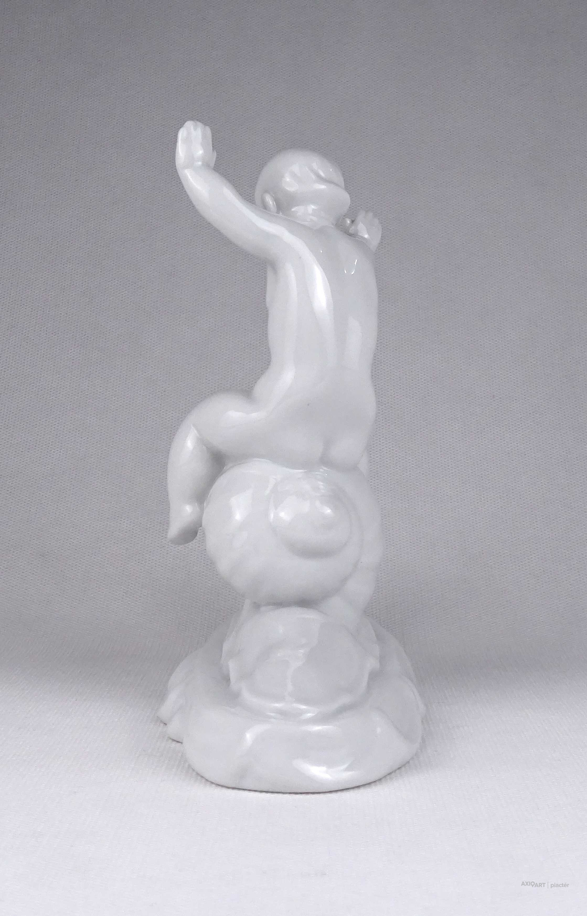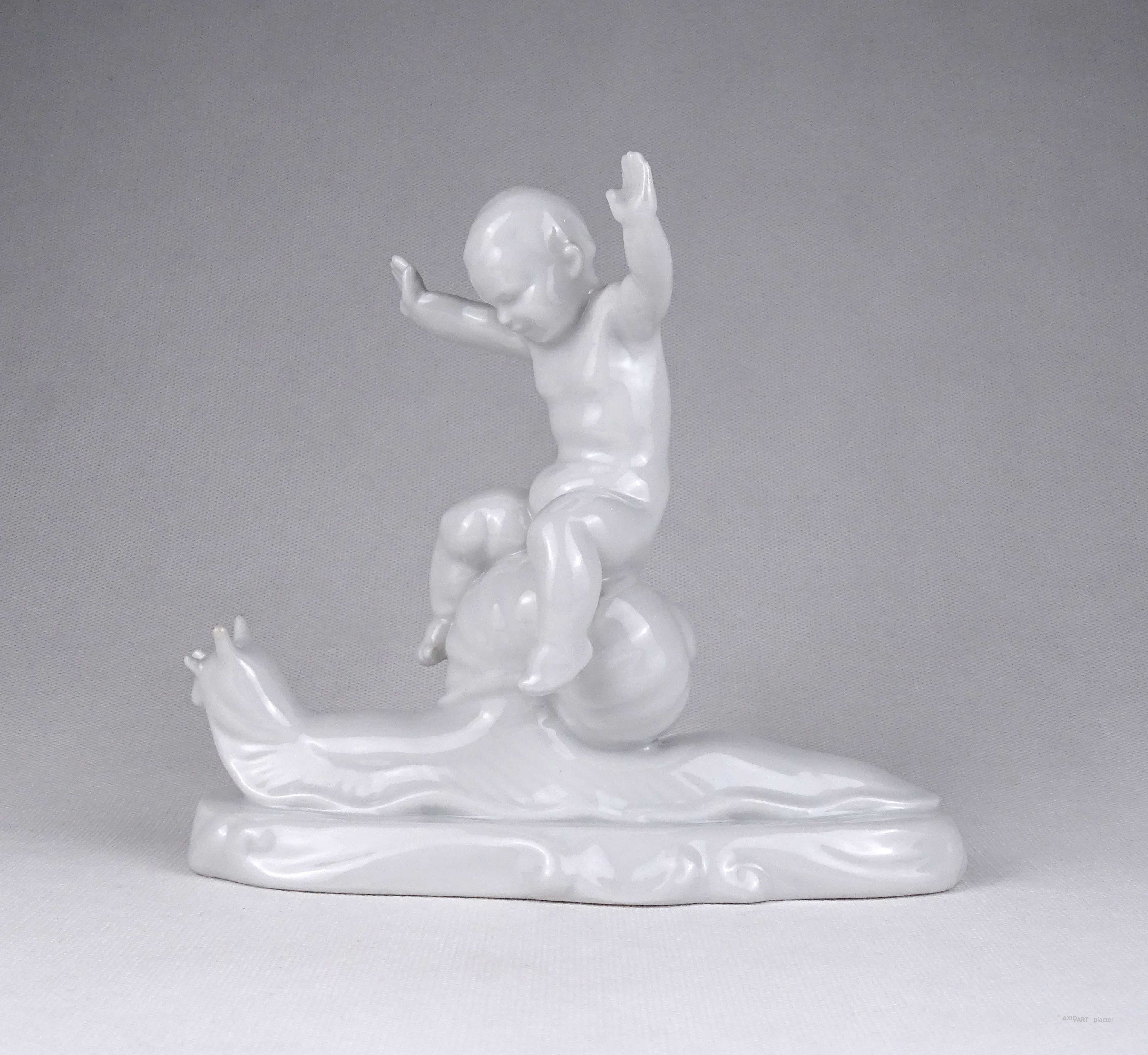[1U296/Z047] Antik, festetlen, nagyméretű Herendi porcelán csigán lovagló kisfiú, puttó figura. Alján kék koronás háború előtti óherendi márkajelzés. Mélynyomással: HEREND Formaszám: 5750 Magasság: 16.5 cm Szélesség: 7 cm Hosszúság: 18.3 cm Súly: 0.415 kg