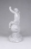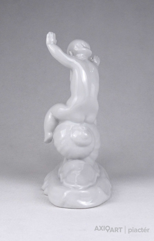 Antik, festetlen, nagyméretű Herendi porcelán csigán lovagló kisfiú, puttó figura.