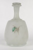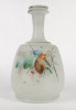 [1O218/Z053] Antik, 1800 vége körüli szép állapotú, maratott homok színű, színezett talpas fúvott üveg palack, dugós üveg, ital kínáló. Oldalát kézifestés díszíti. Eredeti fúvott üveg dugója is meg van. Talpán a fúvás, szakítás nyoma szépen látszik. Magasság: 19.5 cm Szélesség: 11.5 cm Súly: 0.485 kg
