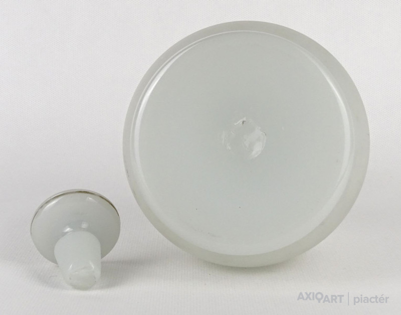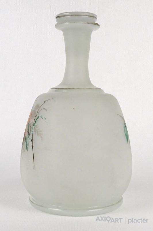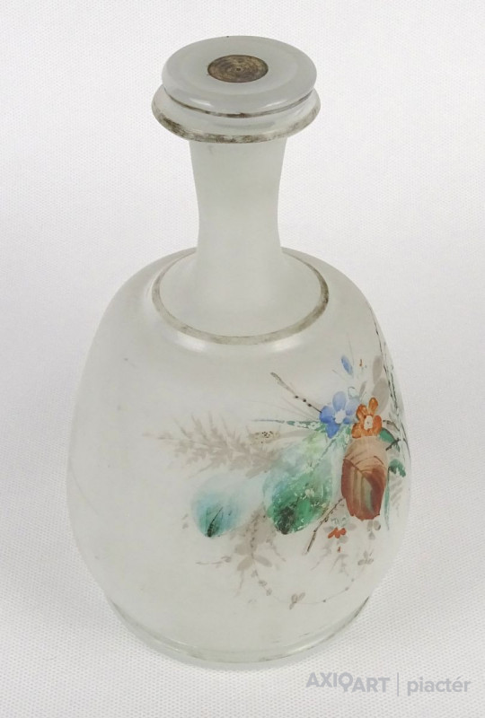 Antik, 1800 vége körüli szép állapotú, maratott homok színű, színezett talpas fúvott üveg palack, dugós üveg, ital kínáló. Oldalát kézifestés díszíti. Eredeti fúvott üveg dugója is meg van. Talpán a fúvás, szakítás nyoma szépen látszik.