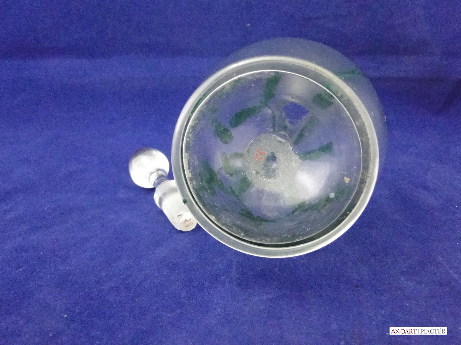 [8116/UZ-K] Gyönyörű hibátlan állapotú fújt, szakított üveg, oldalán zöld virág, levél díszítéssel. Szájánál szép fodros díszítésű. Talpán a szakított résznél, piros kézzel írt sorszám: 82 Magasság: 24 cm Súly: 0.205 kg