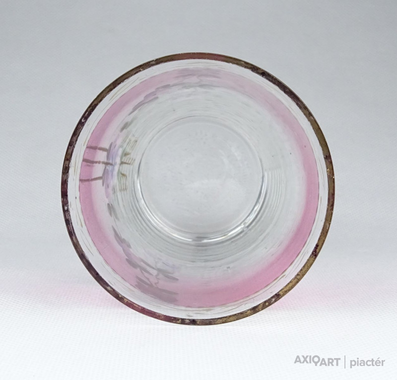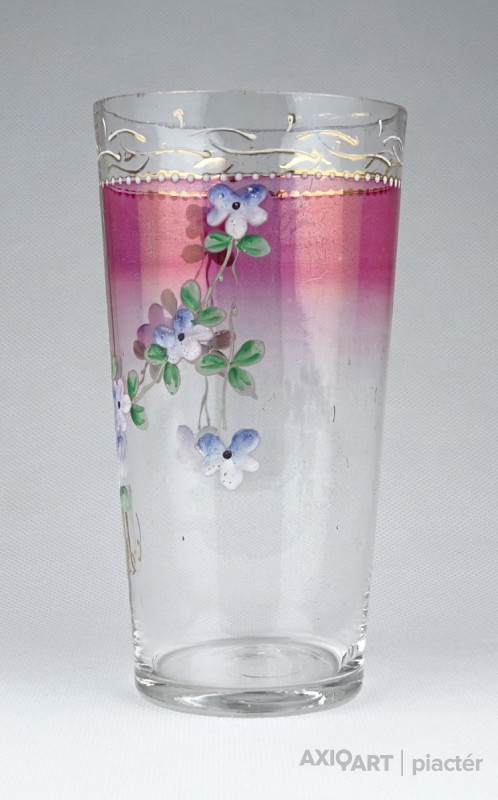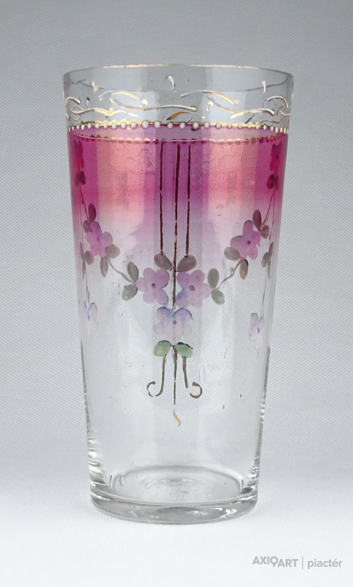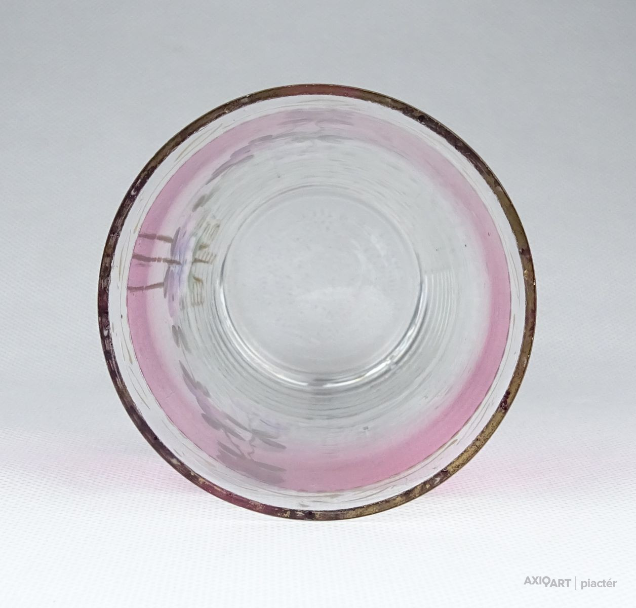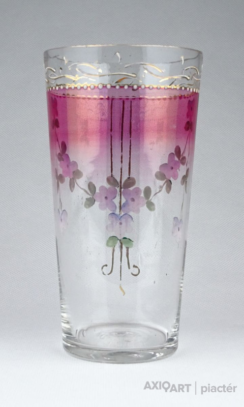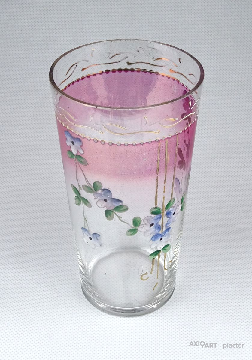 Hibátlan állapotú, rózsaszínre festett, fújt üveg pohár a XIX-XX. század fordulójáról. Oldalán, kézzel festett virág díszítés.