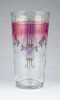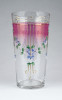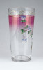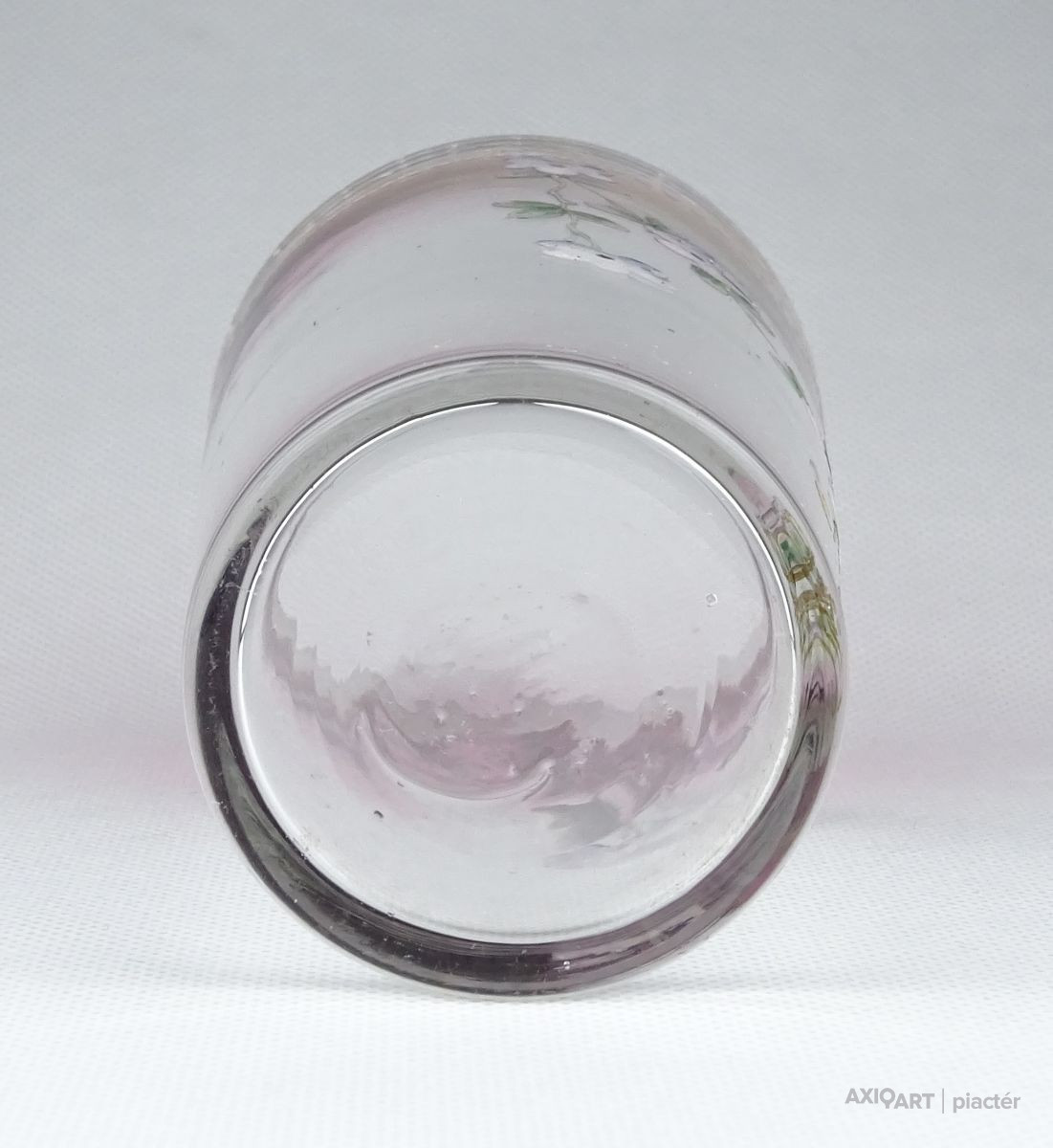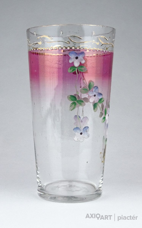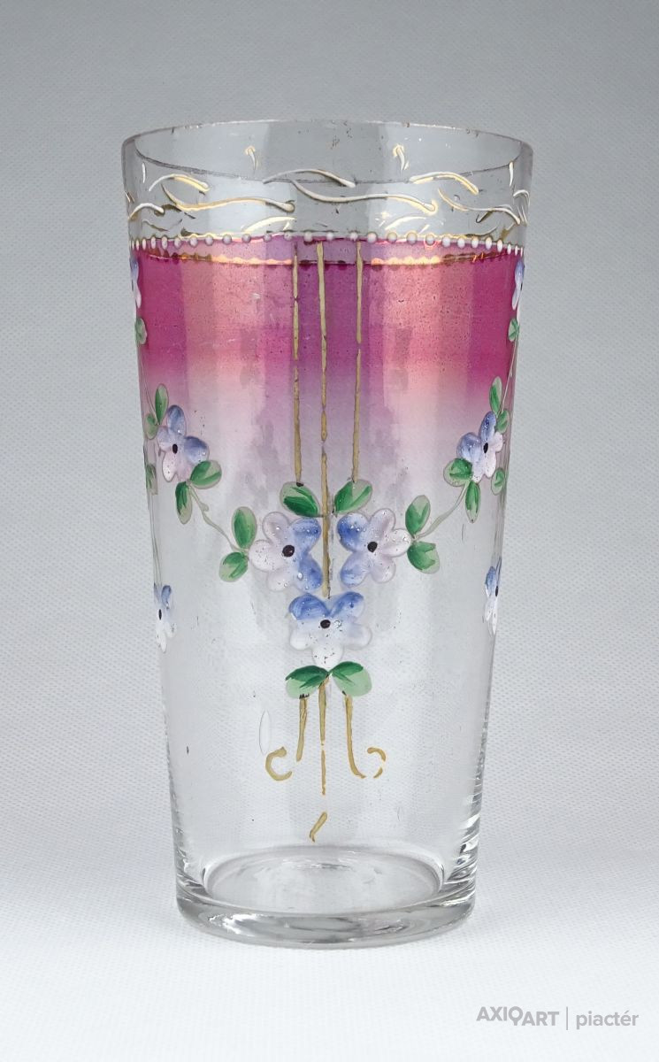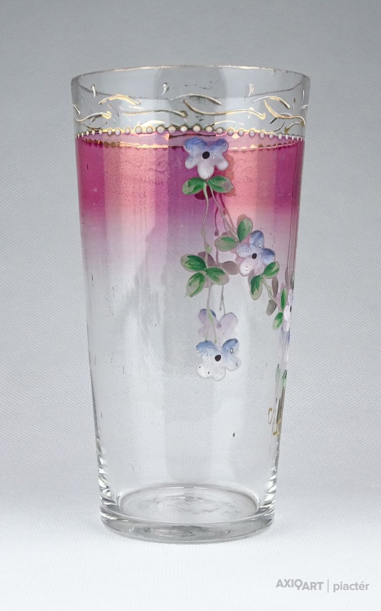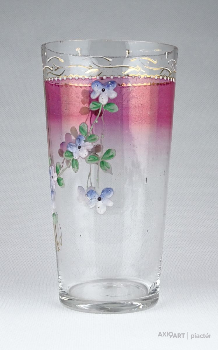 Hibátlan állapotú, rózsaszínre festett, fújt üveg pohár a XIX-XX. század fordulójáról. Oldalán, kézzel festett virág díszítés.