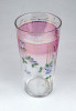 [0Z959/UZ-K] Hibátlan állapotú, rózsaszínre festett, fújt üveg pohár a XIX-XX. század fordulójáról. Oldalán, kézzel festett virág díszítés. Magasság: 13.3 cm Szélesség: 7 cm Súly: 0.115 kg