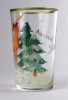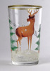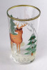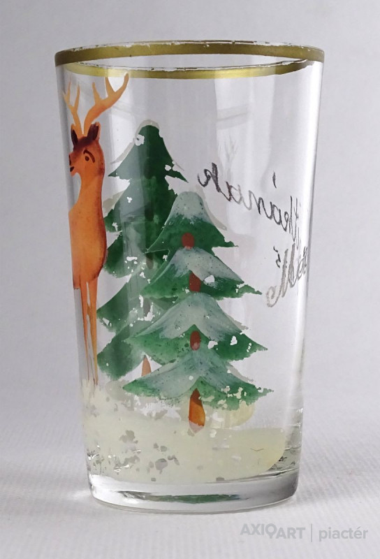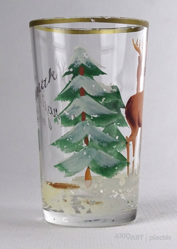 Antik, hibátlan állapotú, fújt üveg pohár, emlékpohár. Oldalán kézzel festett téli tájkép, szarvassal, fenyőfával.