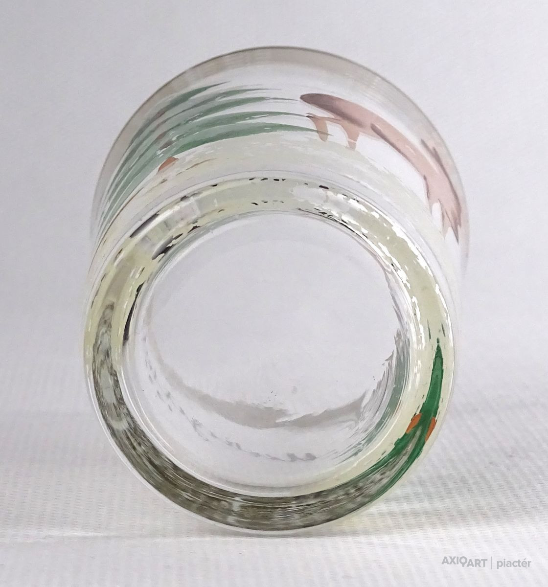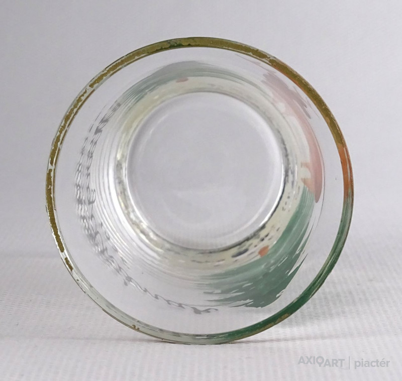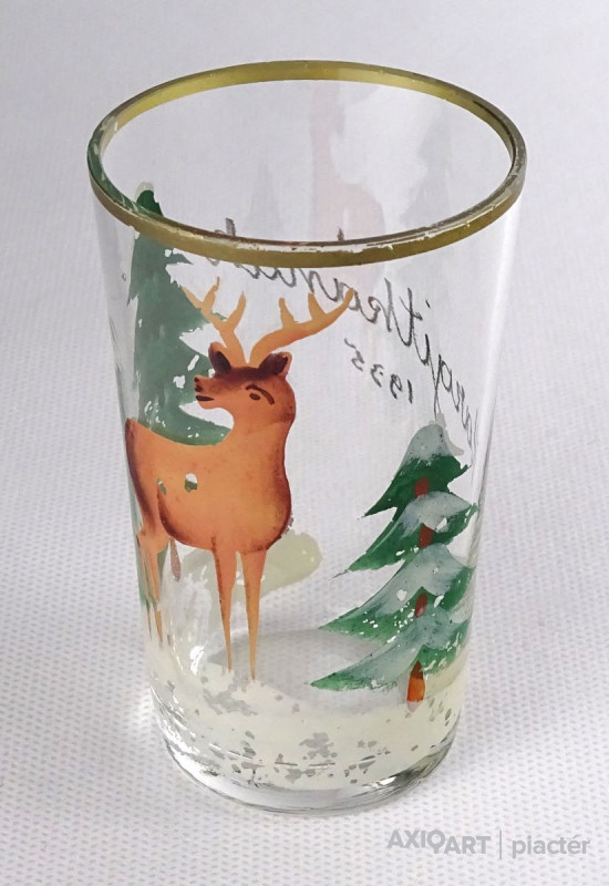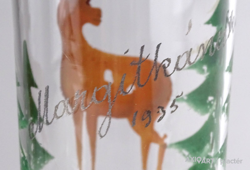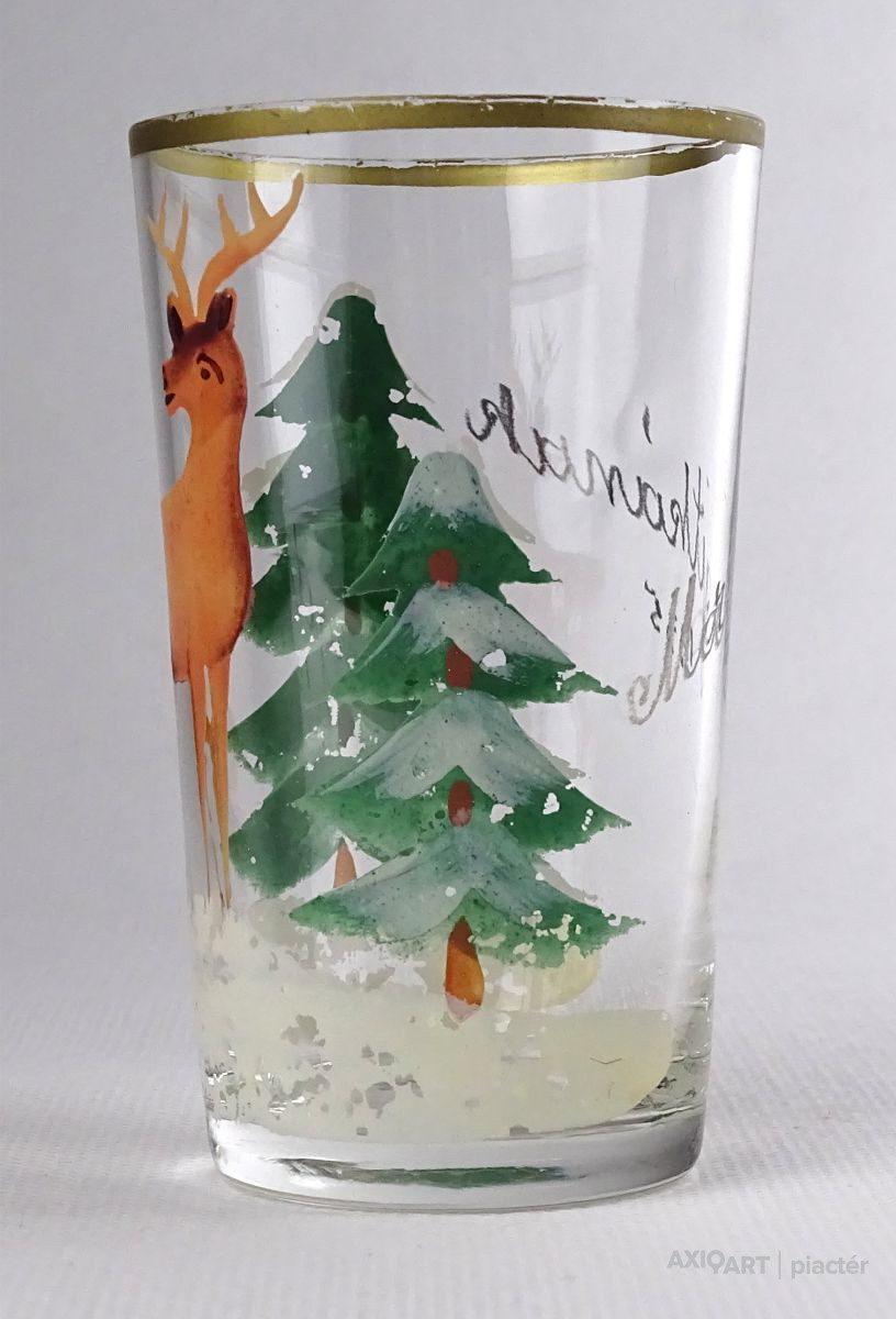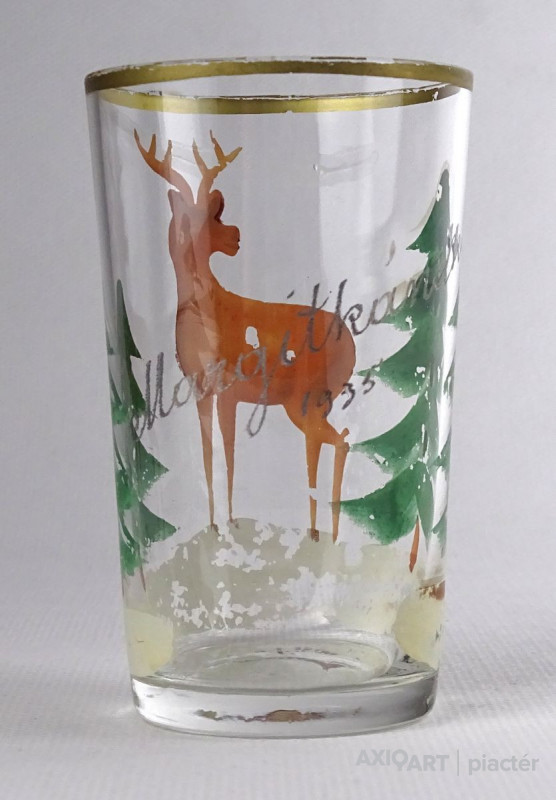 [1R425/X200] Antik, hibátlan állapotú, fújt üveg pohár, emlékpohár. Oldalán kézzel festett téli tájkép, szarvassal, fenyőfával. Felirat: MARGITKÁNAK 1935 Magasság: 8.7 cm Szélesség: 5.3 cm Súly: 0.07 kg
