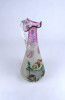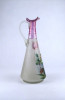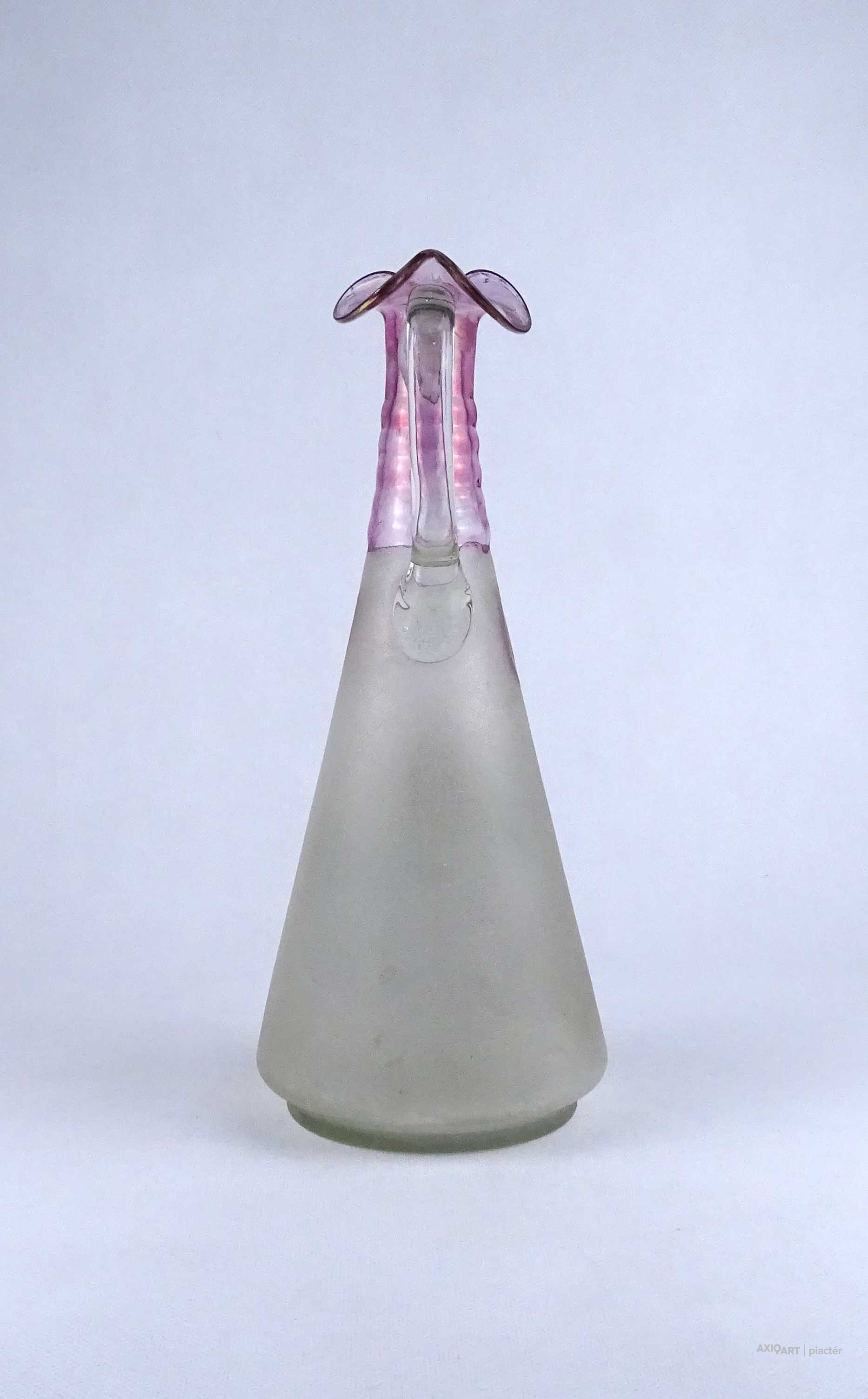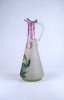 [1Z788/Z059] Antik, hibátlan állapotú, kézifestéssel díszített, lilára színezett nyakú fújtüveg kancsó, karaffa hullámos szélű szájal. Oldalán egy tóparti ház látképe és tulipán motívumok láthatók. Alján a fújás és szakítás nyoma igényes csiszolással lett eltüntetve. Magasság: 30.8 cm Szélesség: 12.7 cm Hosszúság: 13 cm Súly: 0.595 kg