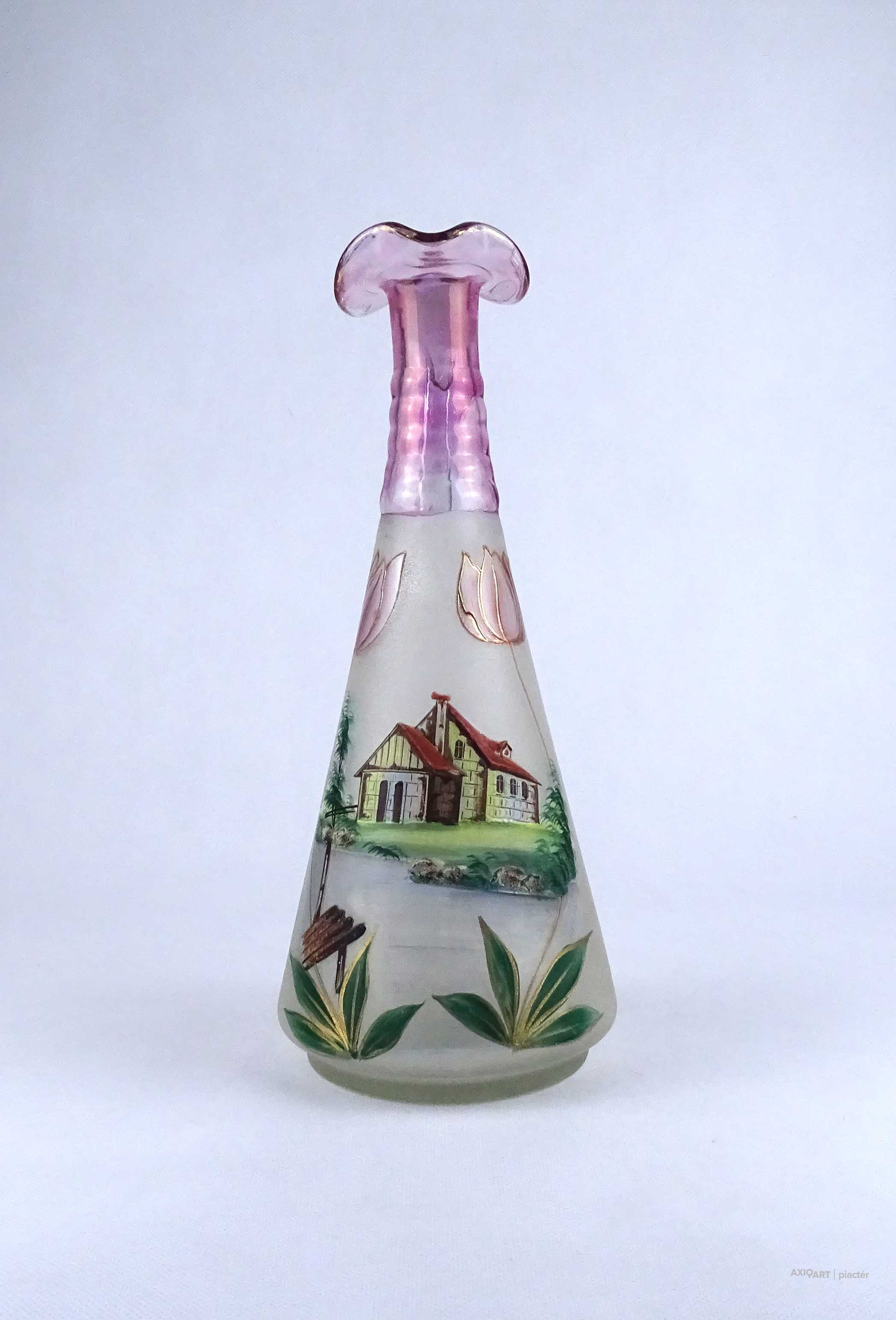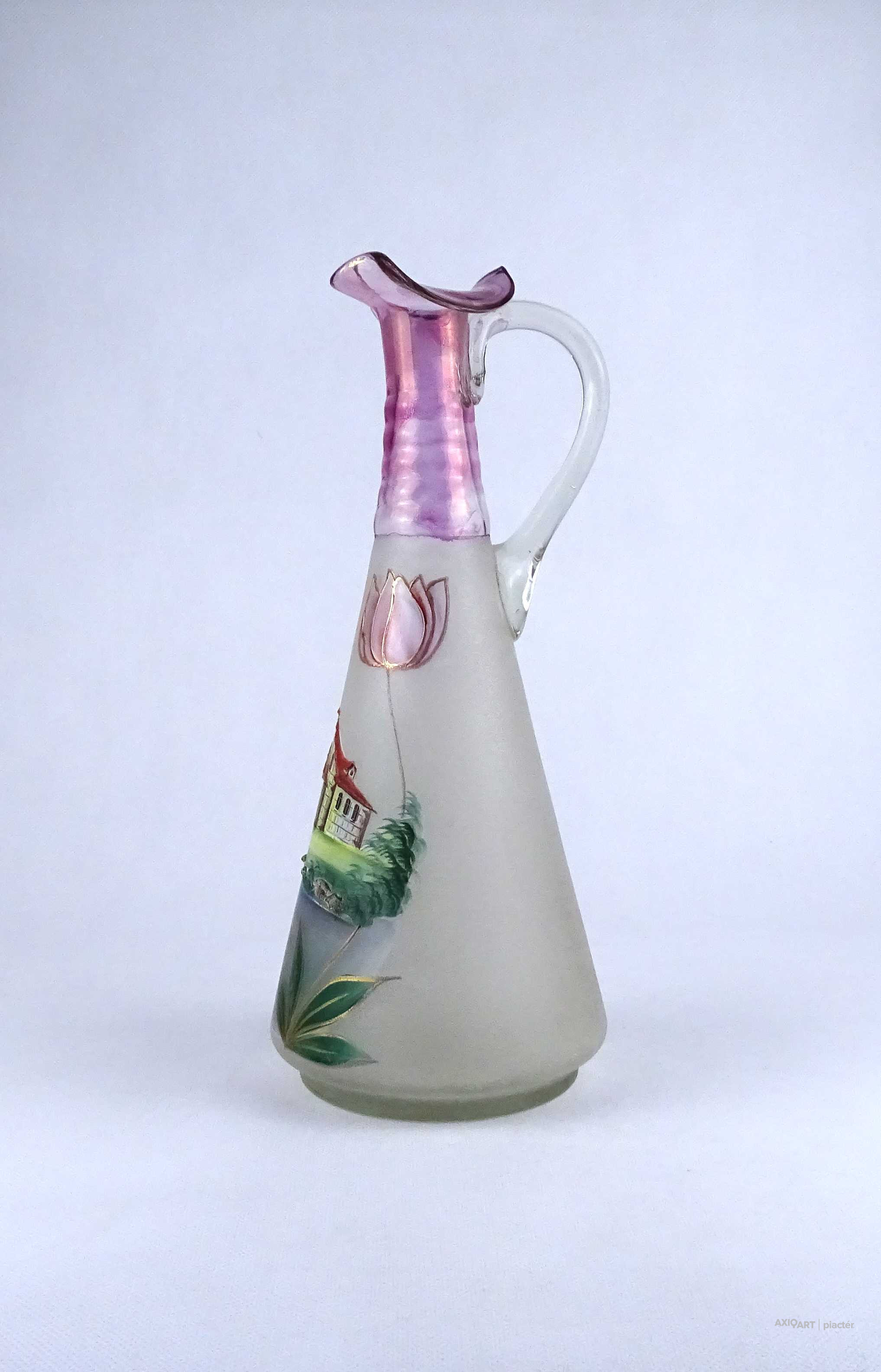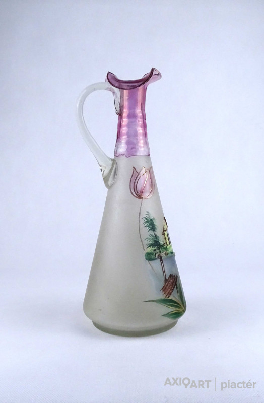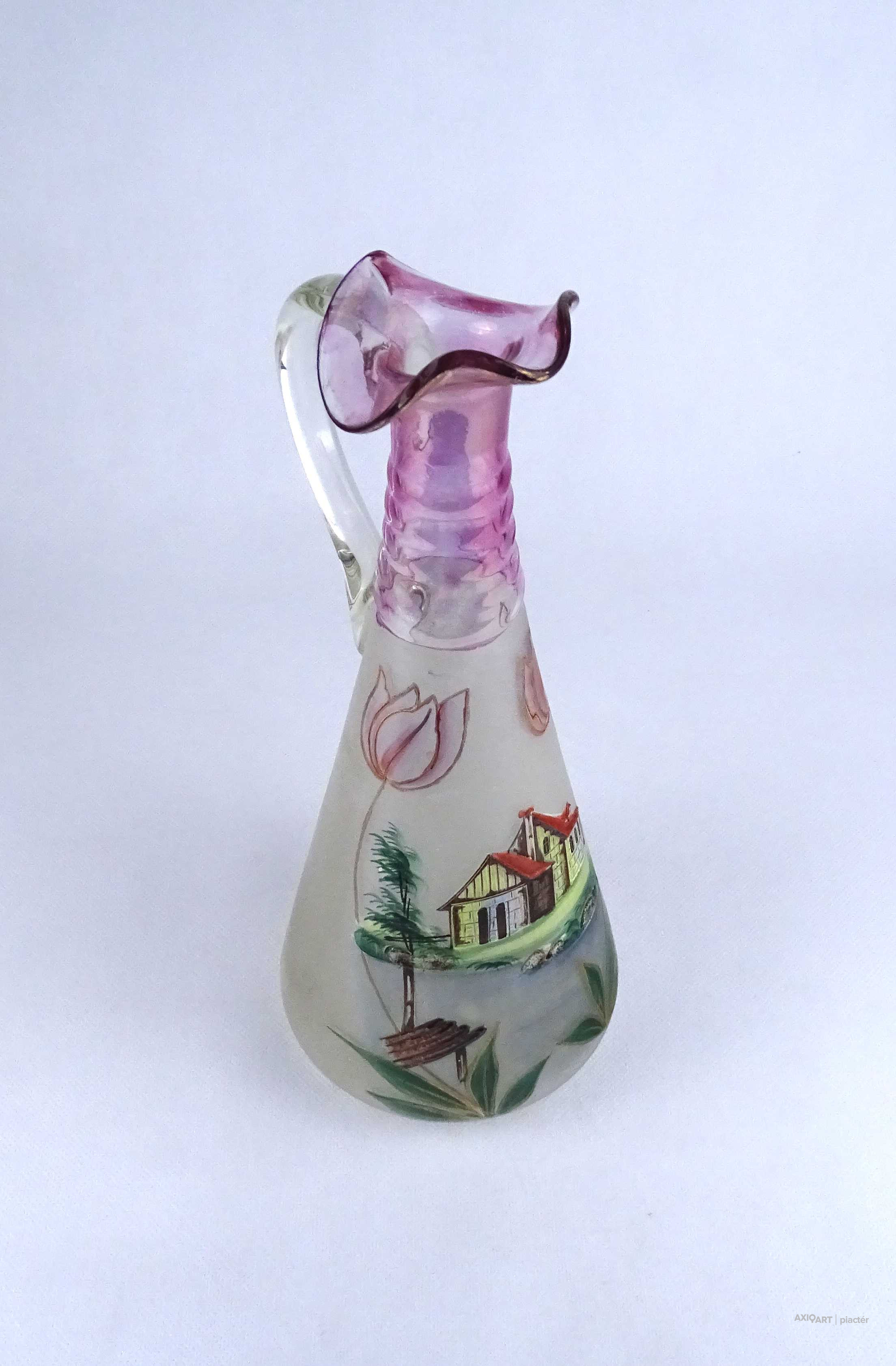 Antik, hibátlan állapotú, kézifestéssel díszített, lilára színezett nyakú fújtüveg kancsó, karaffa hullámos szélű szájal. Oldalán egy tóparti ház látképe és tulipán motívumok láthatók. Alján a fújás és szakítás nyoma igényes csiszolással lett eltüntetve.