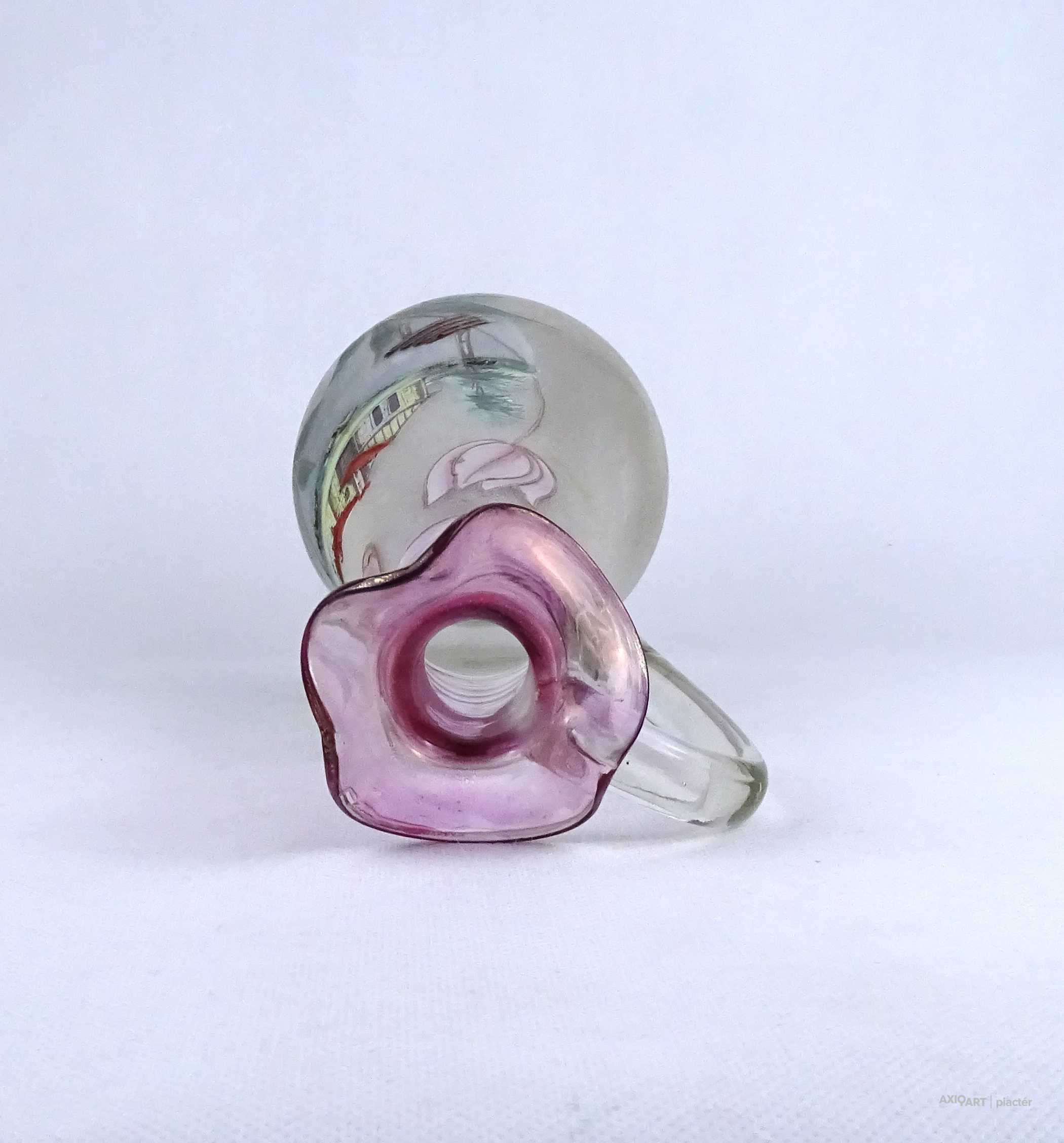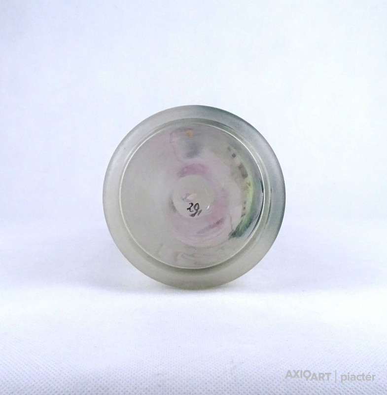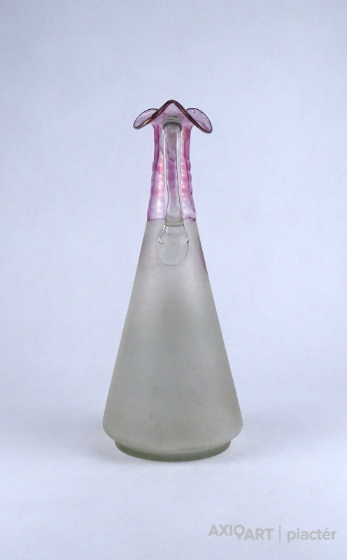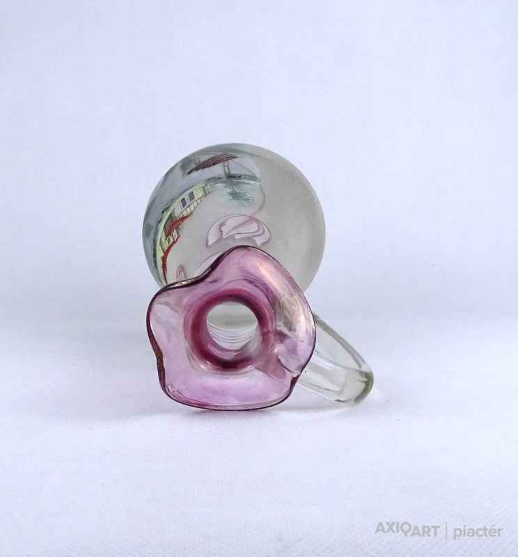Antik, hibátlan állapotú, kézifestéssel díszített, lilára színezett nyakú fújtüveg kancsó, karaffa hullámos szélű szájal. Oldalán egy tóparti ház látképe és tulipán motívumok láthatók. Alján a fújás és szakítás nyoma igényes csiszolással lett eltüntetve.