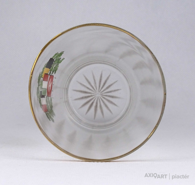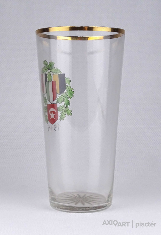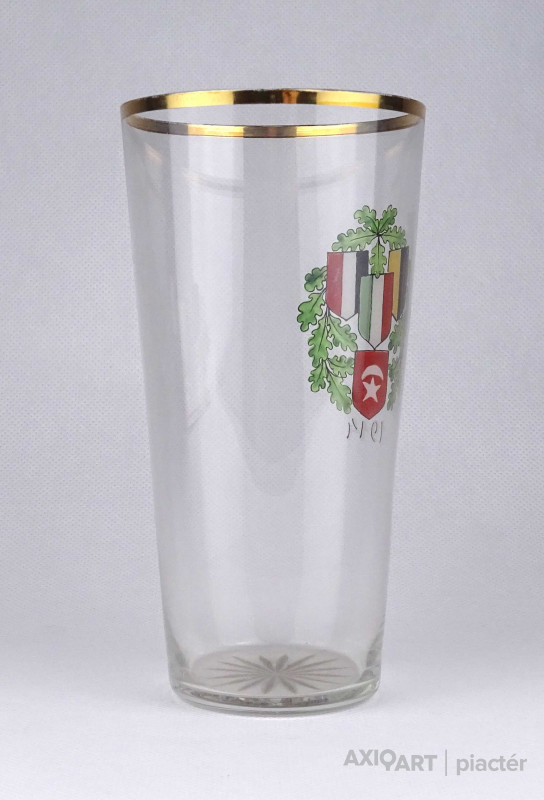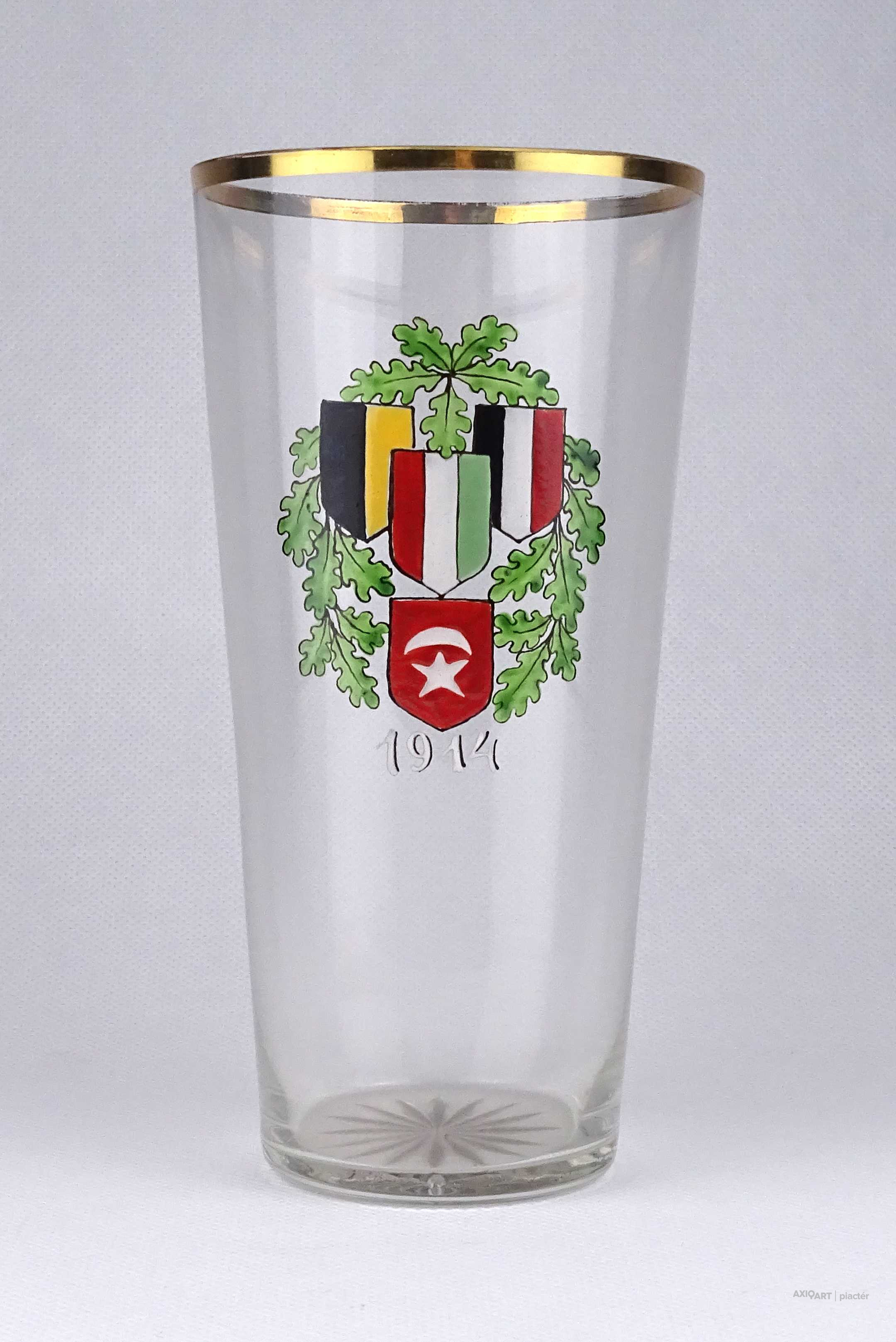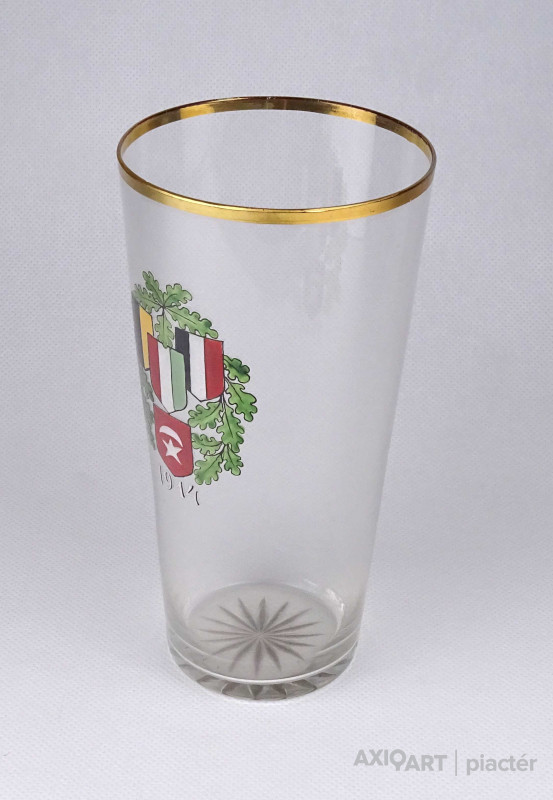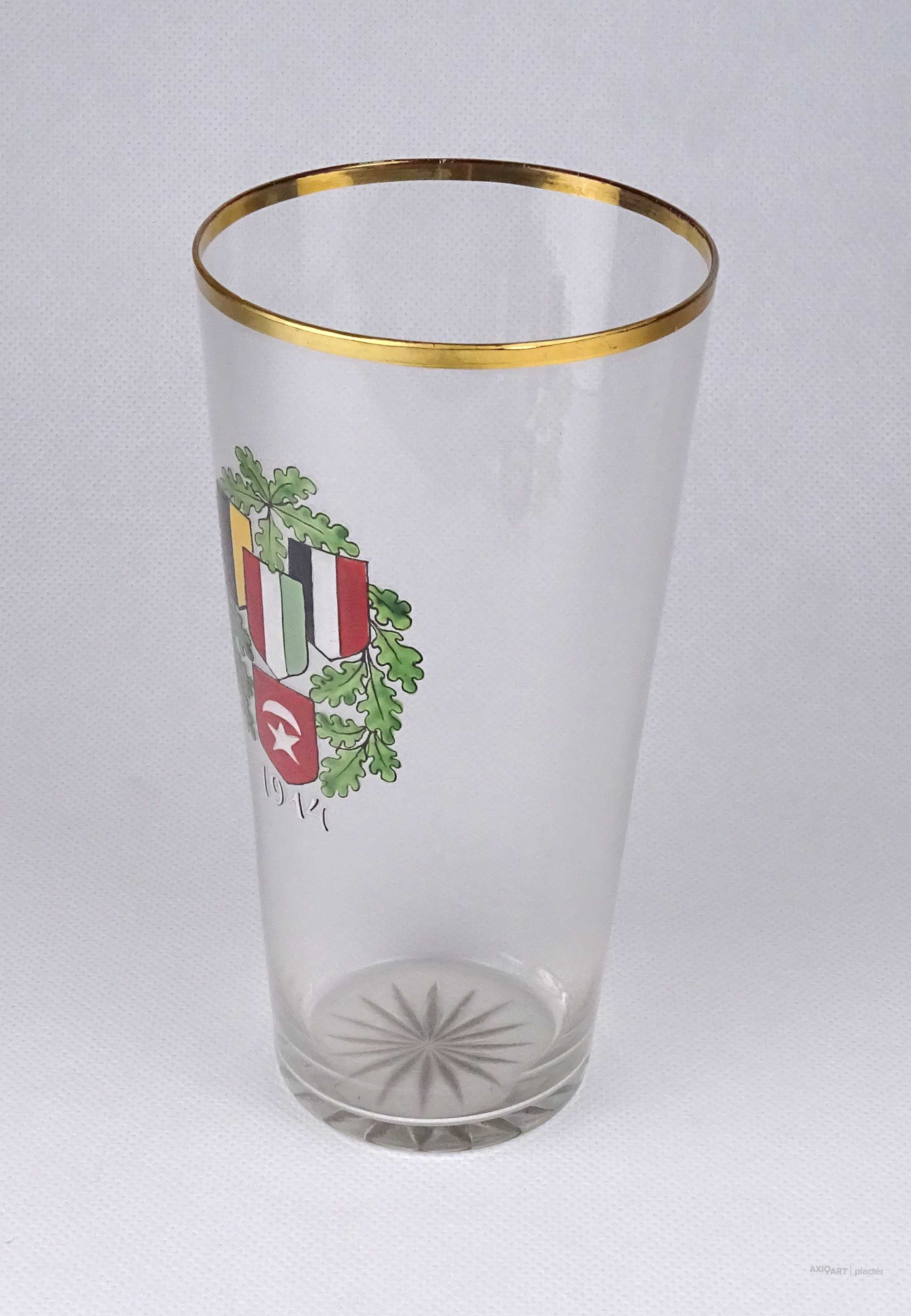 Antik, hibátlan állapotú, kézi festéssel díszített, vékony falú, fújt üveg, I. világháborús emlékpohár az 1900-as évek elejéről. A poháron a Központi hatalmak lobogói és az 1914-es dátum látható.