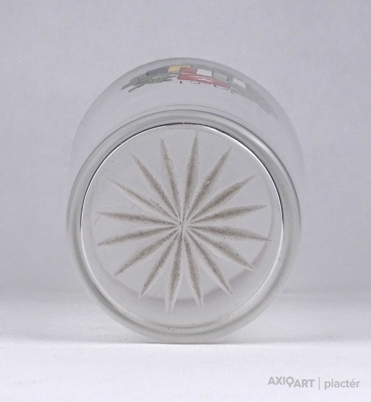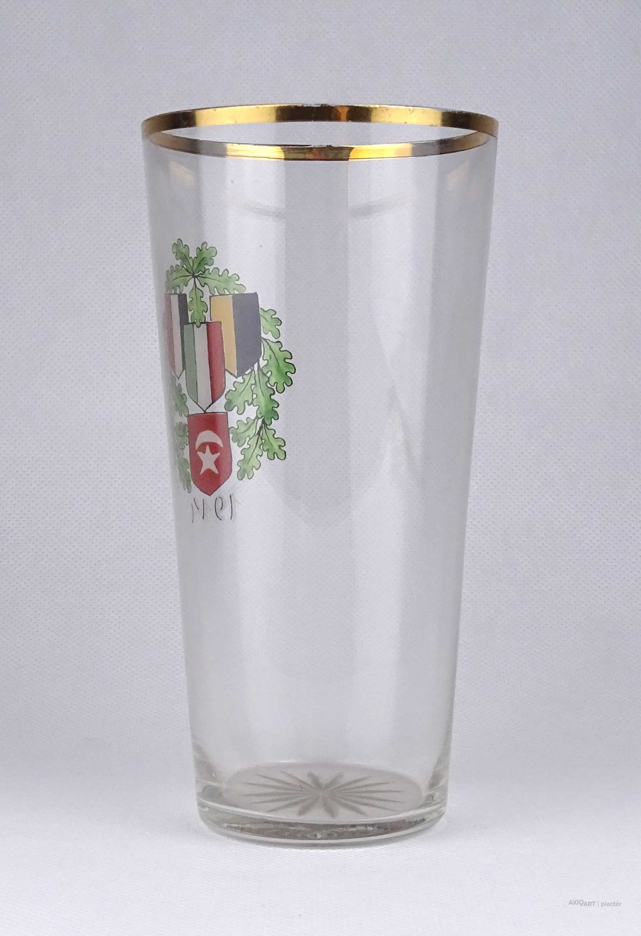 [1X377/X326] Antik, hibátlan állapotú, kézi festéssel díszített, vékony falú, fújt üveg, I. világháborús emlékpohár az 1900-as évek elejéről. A poháron a Központi hatalmak lobogói és az 1914-es dátum látható. Magasság: 16.7 cm Szélesség: 8.4 cm Súly: 0.14 kg