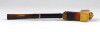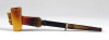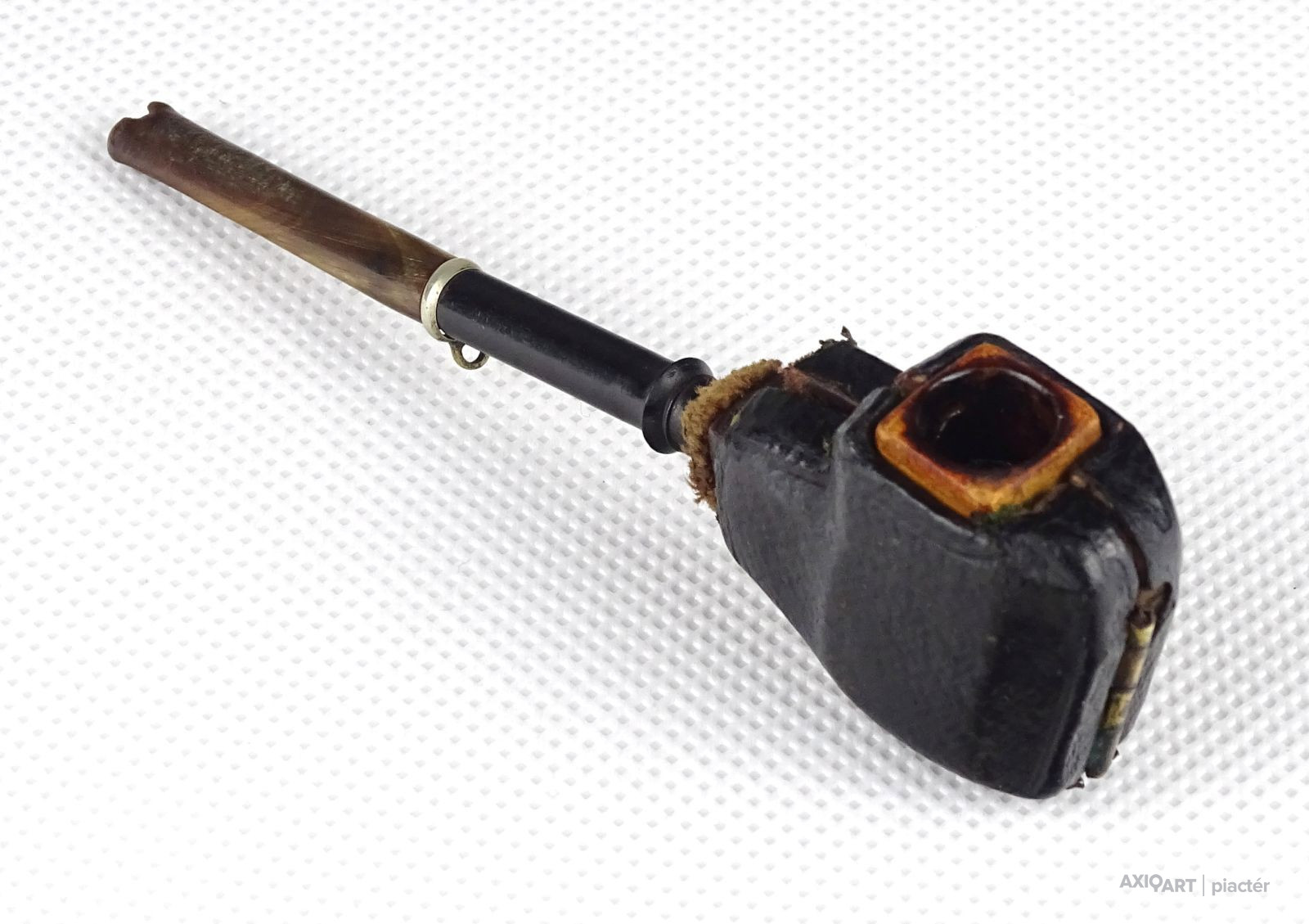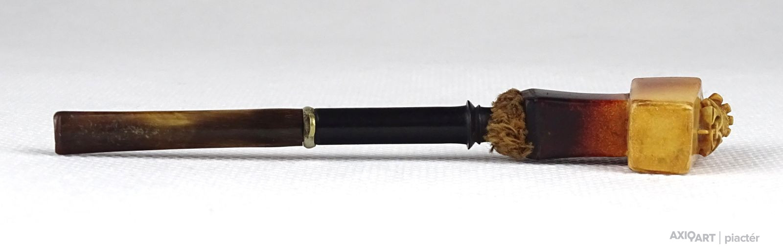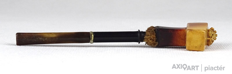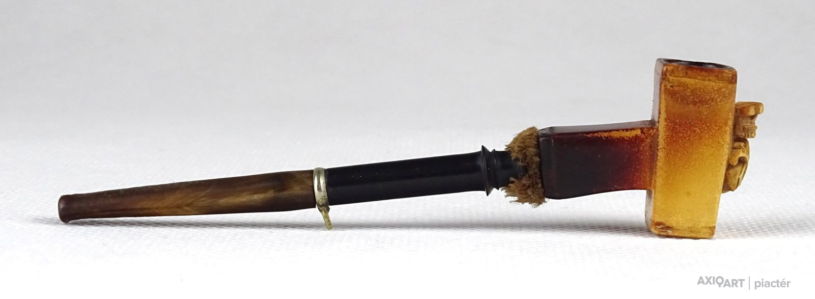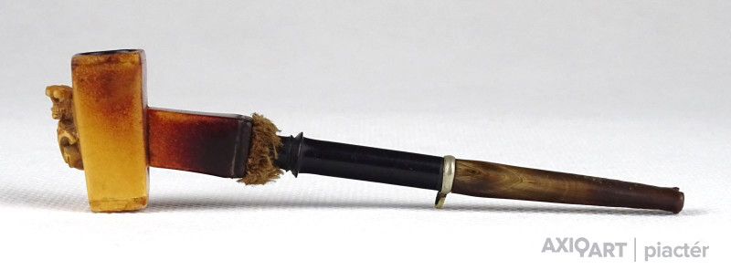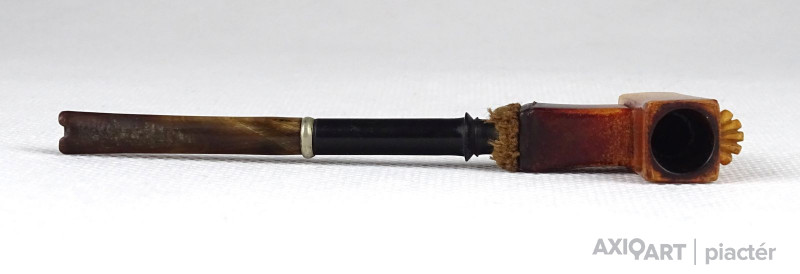 Antik, szép állapotú, kis méretű tajtékpipa eredeti bőr tokjában. Méretéből adódóan valószínűleg ópiumpipaként használták. Elejét gyönyörű faragott korona alatti iniciálés monogram díszíti. A pipa szára szaruból készült.