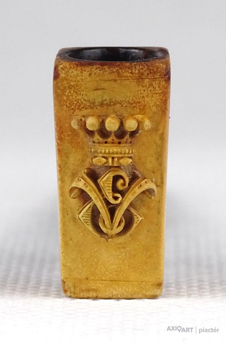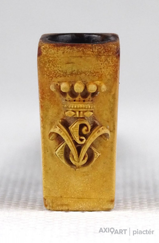 [1I122/X024/10] Antik, szép állapotú, kis méretű tajtékpipa eredeti bőr tokjában. Méretéből adódóan valószínűleg ópiumpipaként használták. Elejét gyönyörű faragott korona alatti iniciálés monogram díszíti. A pipa szára szaruból készült. Monogram: EV vagy VE Magasság: 2.5 cm Szélesség: 1.2 cm Hosszúság: 10.5 cm Súly: 0.005 kg   A pipa mérete a kupaktól a faragás aljáig 13 cm, az aljától a szárig 11,5 cm, a szár hossza 50 cm