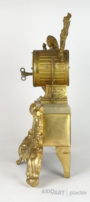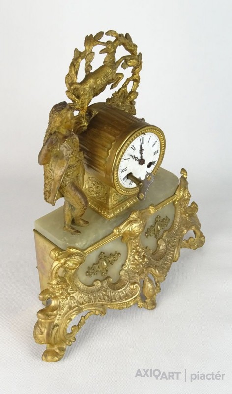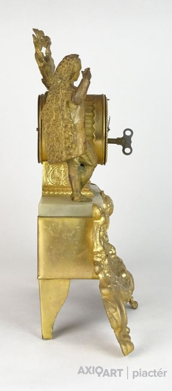 Működő állapotban lévő, ingás, 8 napos járású, csengettyűs, kétkulcsos feles ütős kandalló óra. Anyaga alabástrom és aranyozott spiáter. Rajta francia alak és kecske díszítés. (Javított.)