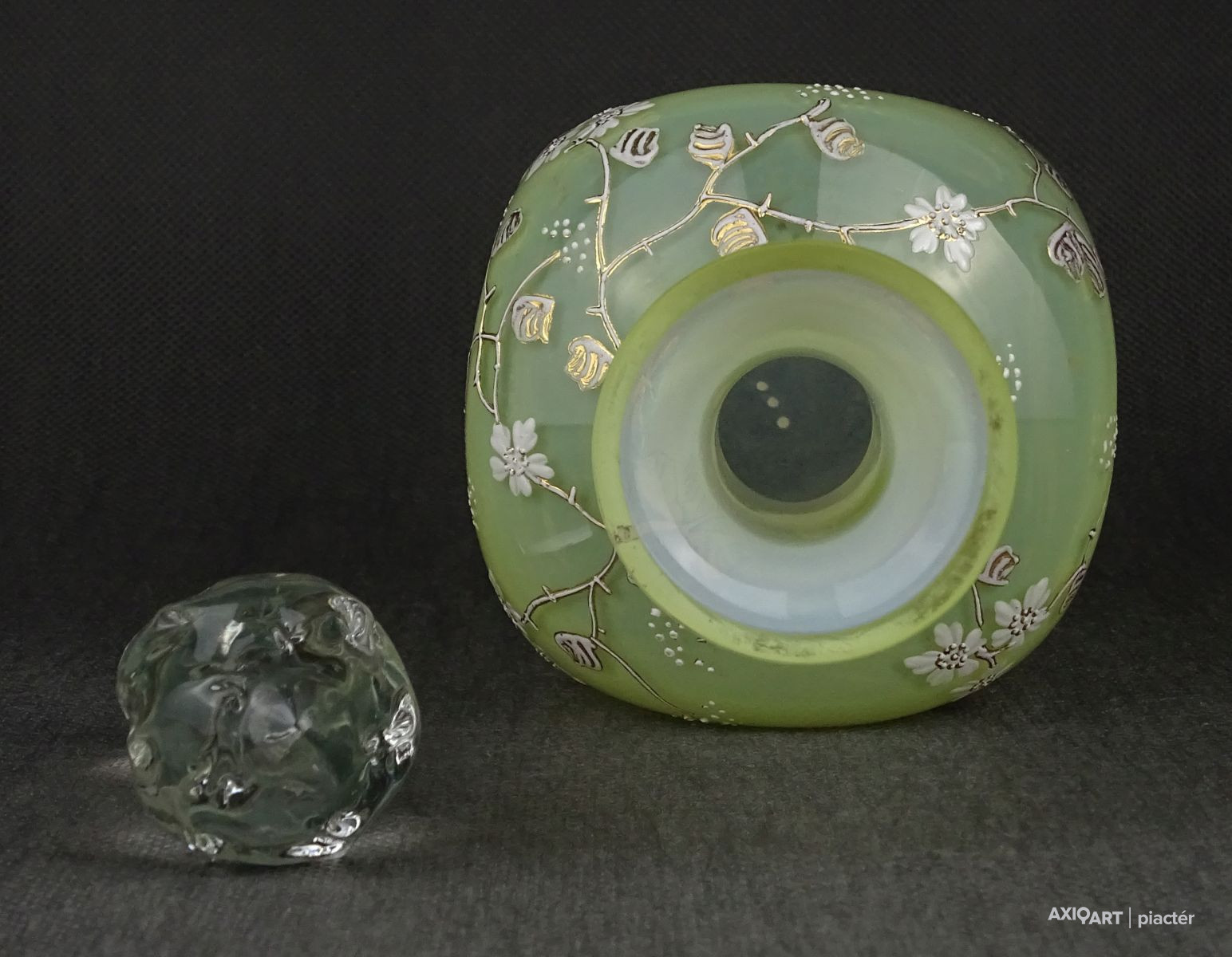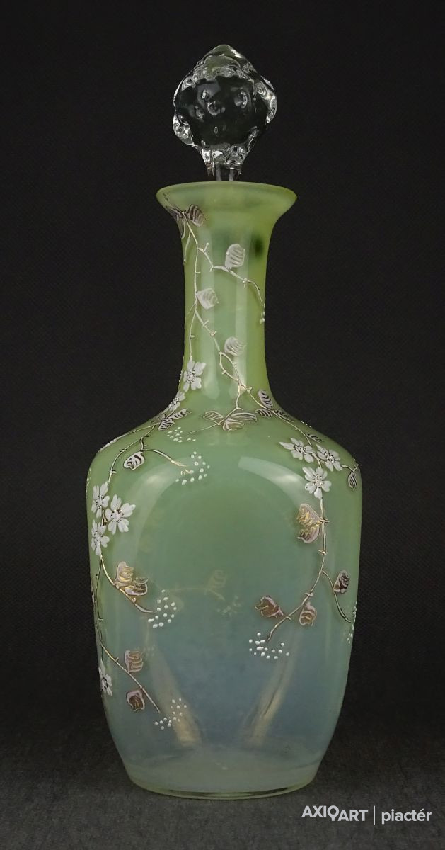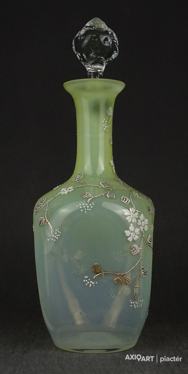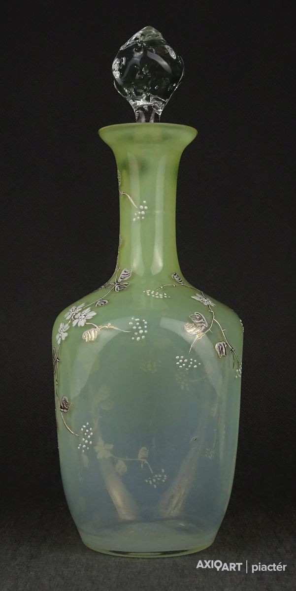 Hibátlan állapotú, sárga színű gyönyörű dugós üveg, pálinka kínáló üveg. Felülete kézifestéssel, aranyozással díszített. Alján a szakítás nyoma szépen látható.