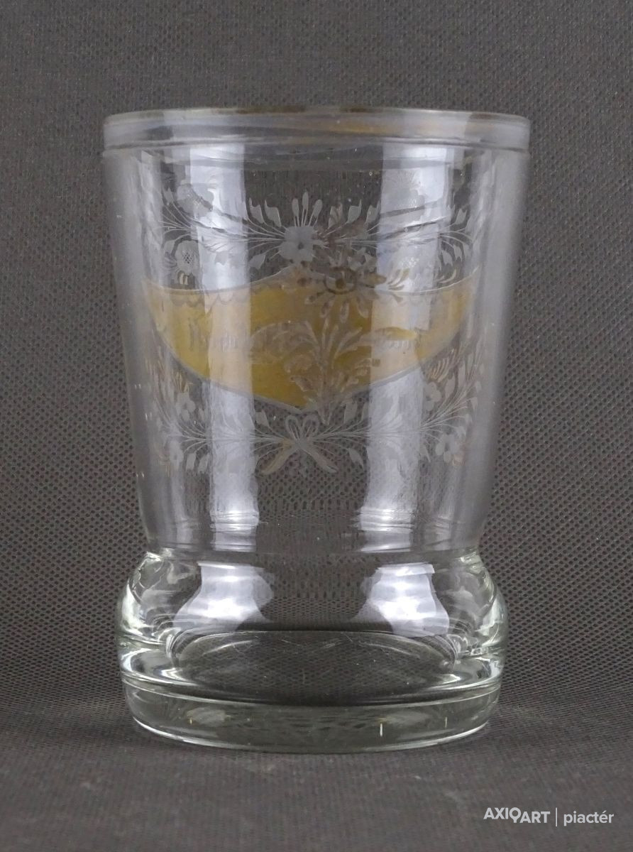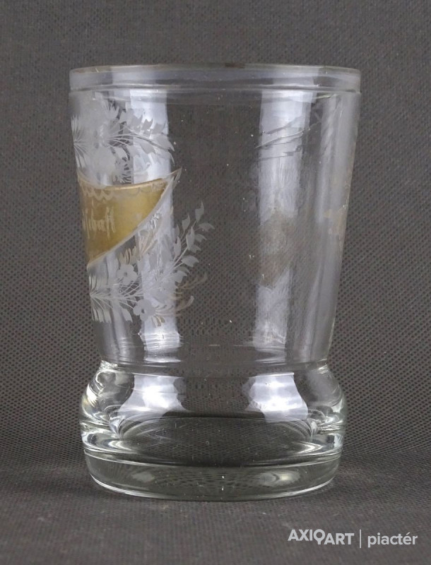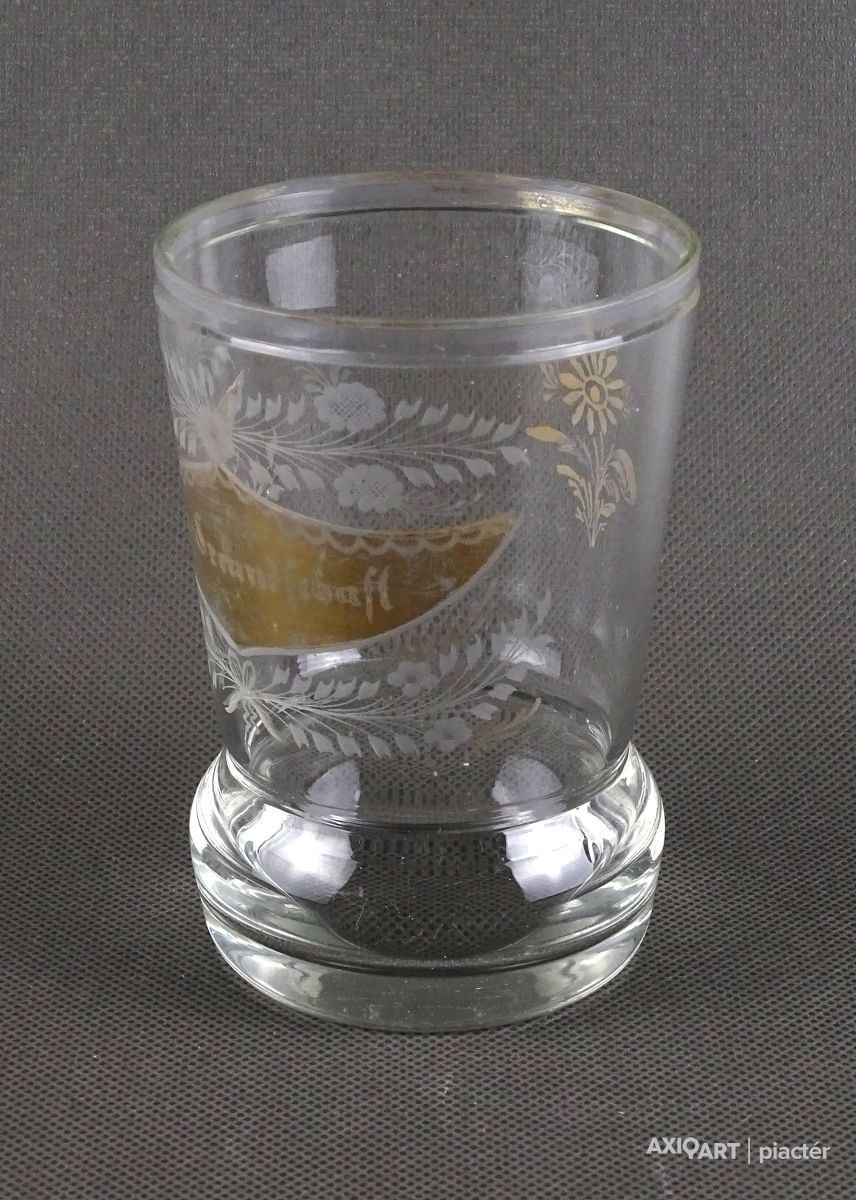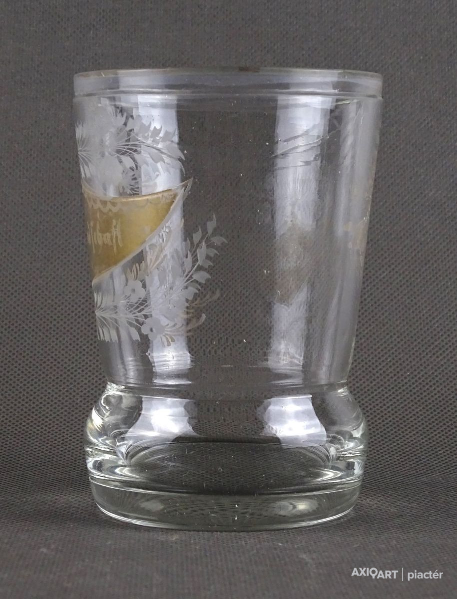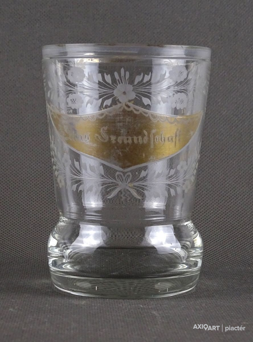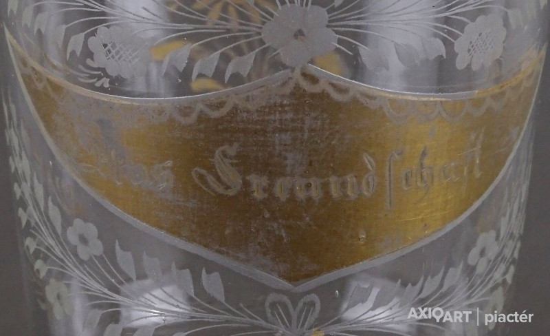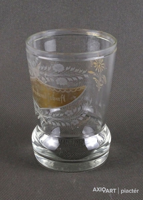Hibátlan állapotú, antik Biedermeier fújt üvegpohár a XIX. századból. Oldalán finoman csiszolt művészi ornamentika látható. Aranyozott mezőben HAS FREUNDSCHAFT (legyen barátság) felirat ovlasható. Gyűjtői darab.
