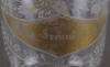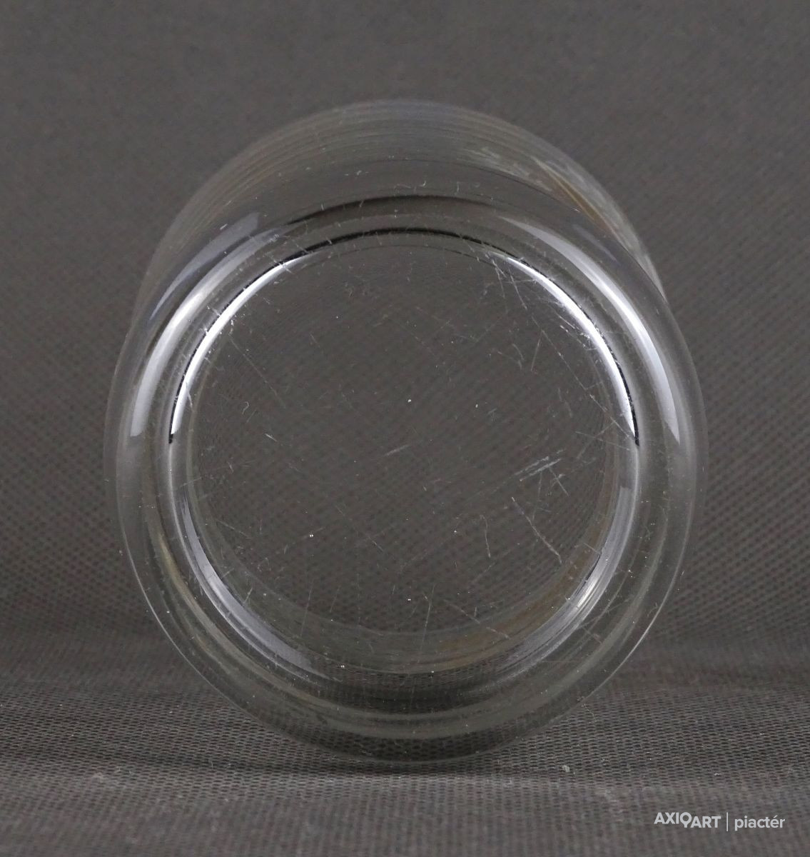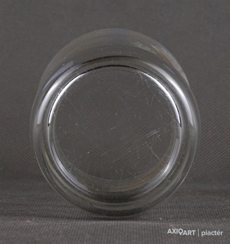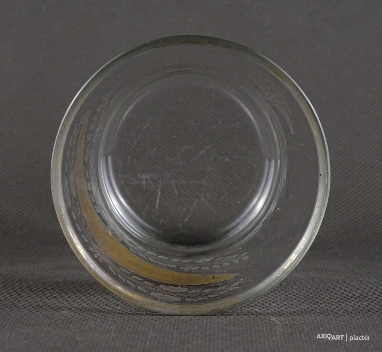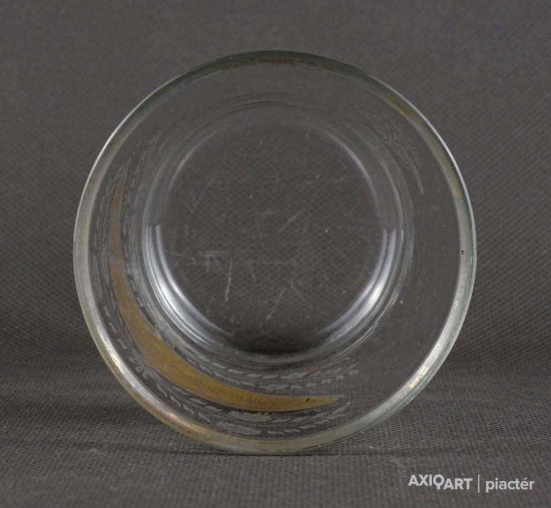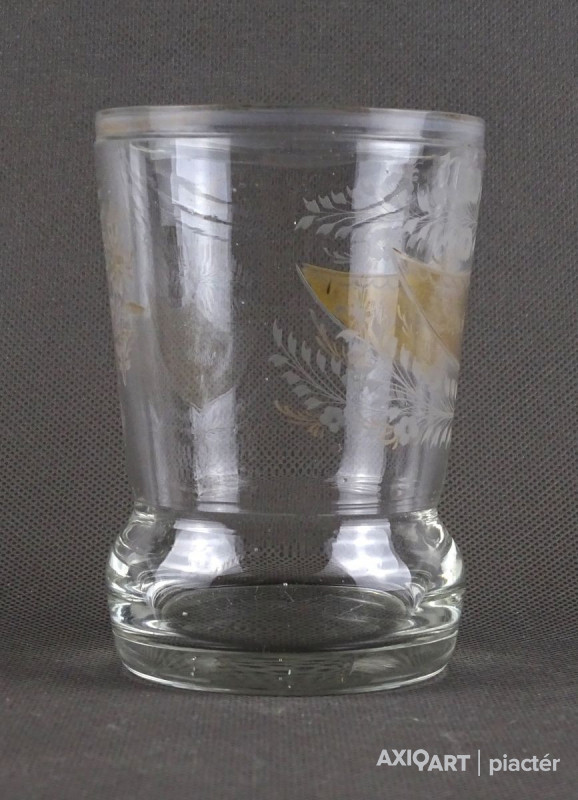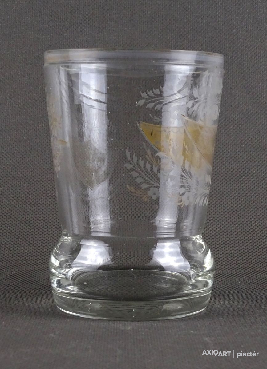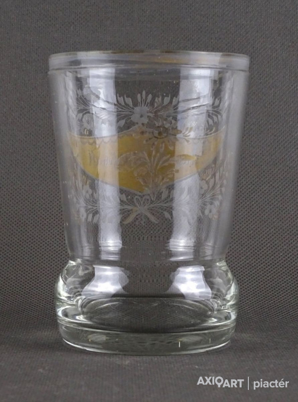 Hibátlan állapotú, antik Biedermeier fújt üvegpohár a XIX. századból. Oldalán finoman csiszolt művészi ornamentika látható. Aranyozott mezőben HAS FREUNDSCHAFT (legyen barátság) felirat ovlasható. Gyűjtői darab.