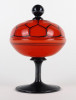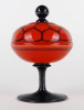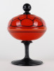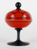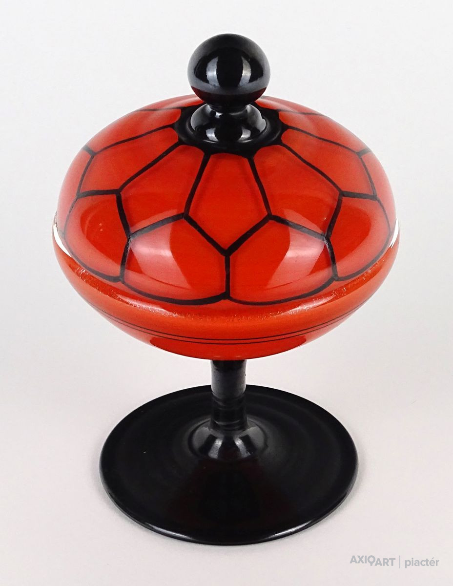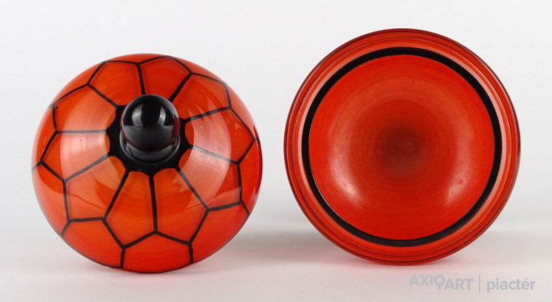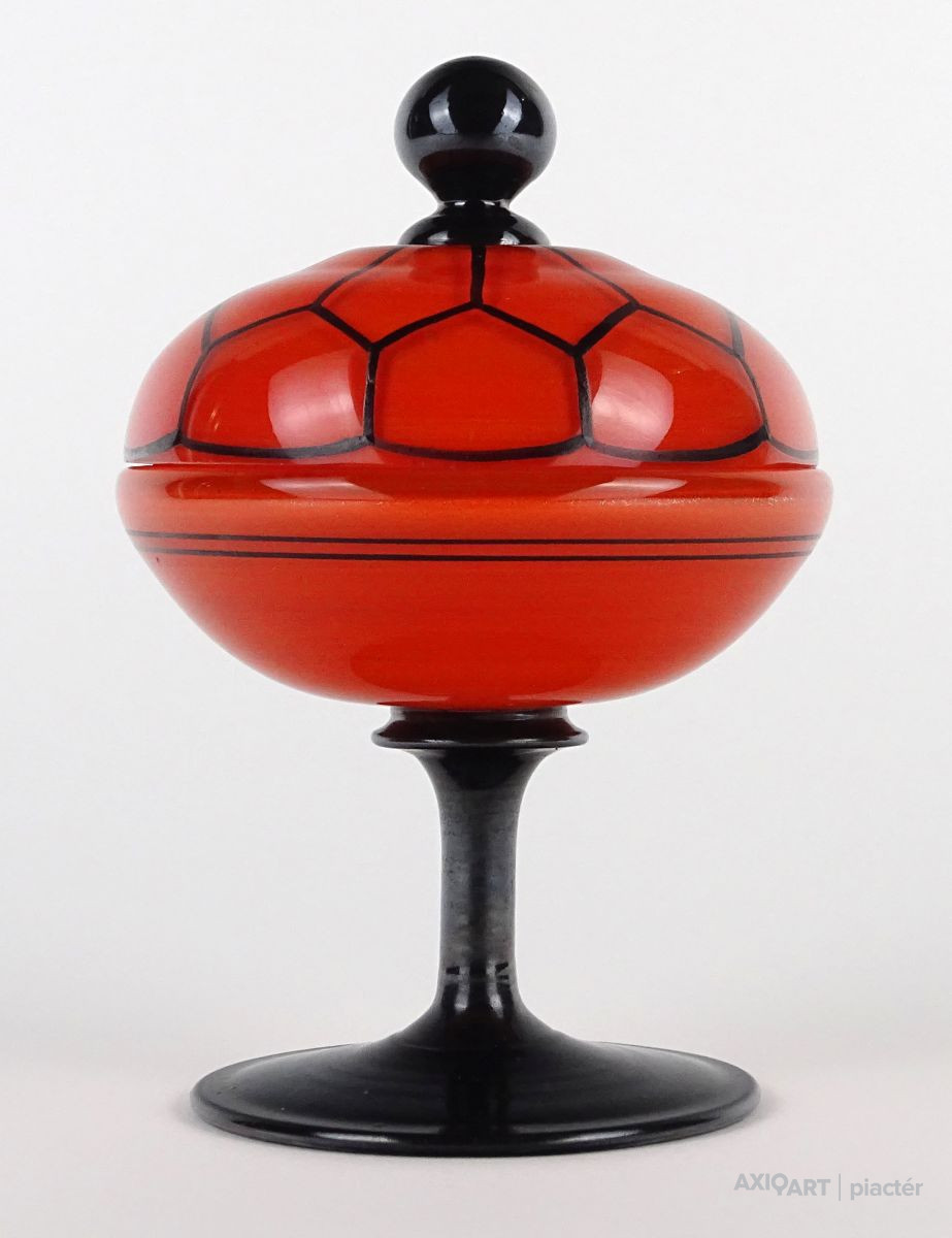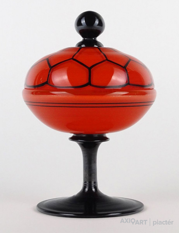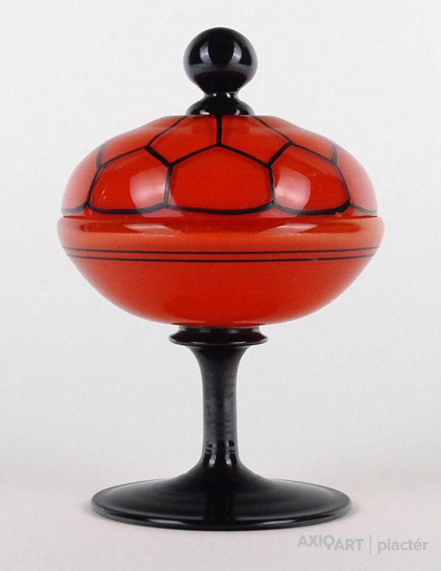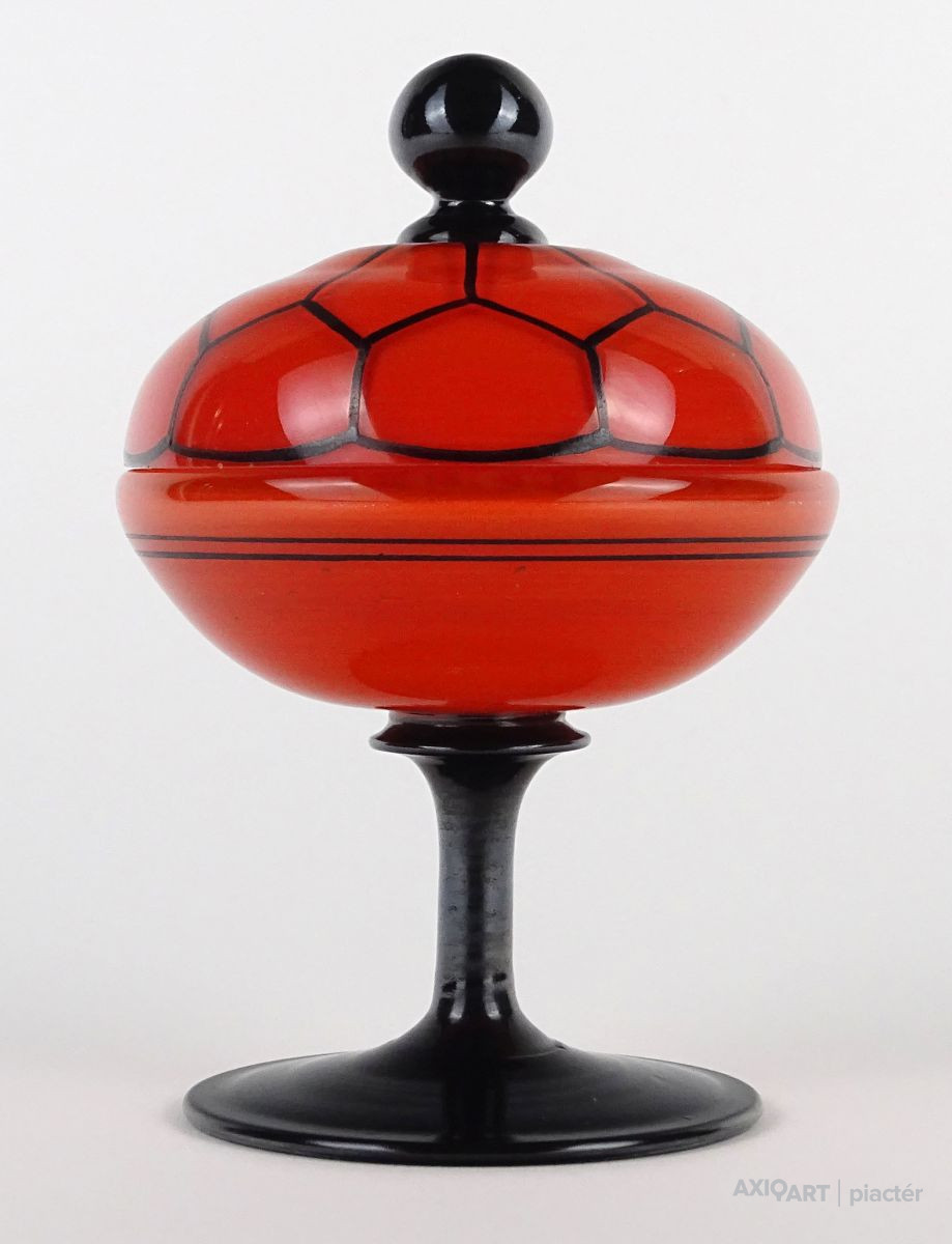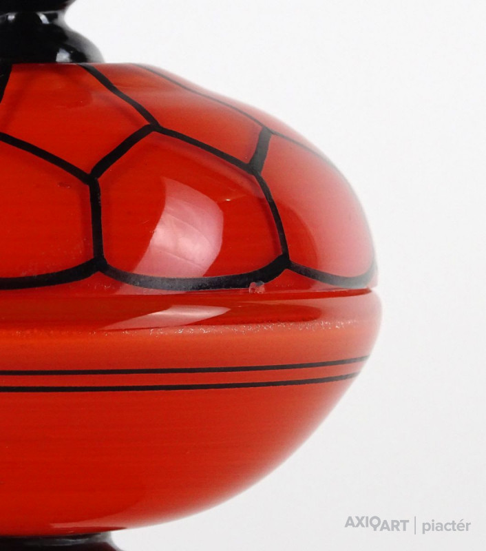 Antik fújt Wilhelm Kralik - Loetz talpas tango üveg narancs-fekete bonbonier 13 cm