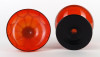 Szép állapotú fúvott üveg bonbonier. Fekete és narancssárga színben, kézi festéssel díszítve. A fedél peremén aprócska lepattanás található, lásd fotó.
