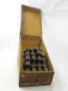 Nagyon régi fa tároló dobozban található különböző méretű számozott réz hüvelyek fúrószárak részére. Minden hüvely oldalán beütött jelzés fúrószárak méreteinek.