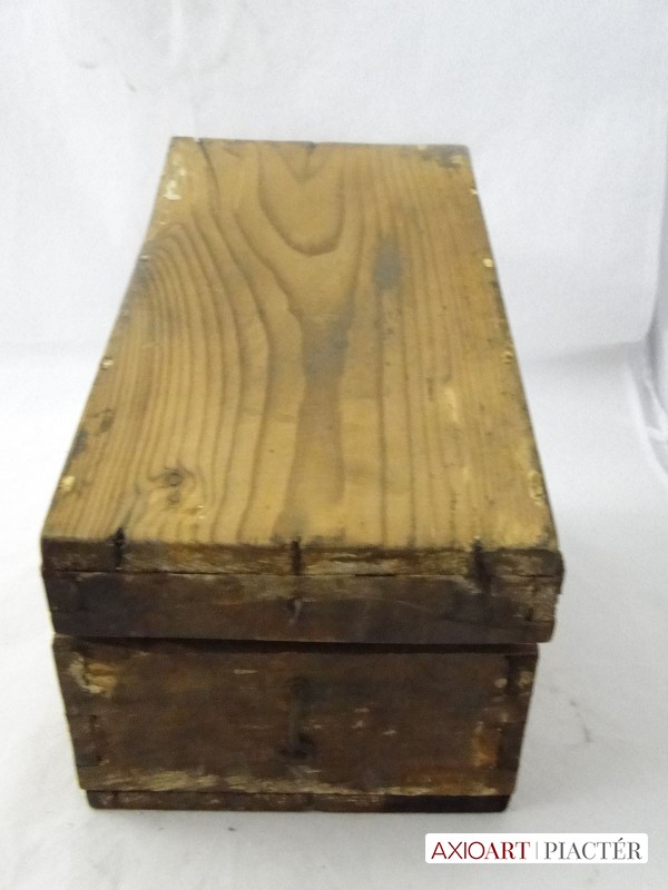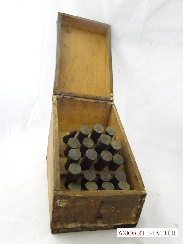 [8836/X109] Nagyon régi fa tároló dobozban található különböző méretű számozott réz hüvelyek fúrószárak részére. Minden hüvely oldalán beütött jelzés fúrószárak méreteinek. A dobozban összesen 19 darab hüvely található, üresek. A tárolóban ezen kívül még egy nagy méretű 1,5 x 19,5 cm méretű régi fúrószár található. Magasság: 24.5 cm Szélesség: 17 cm Hosszúság: 25.5 cm Súly: 3.525 kg