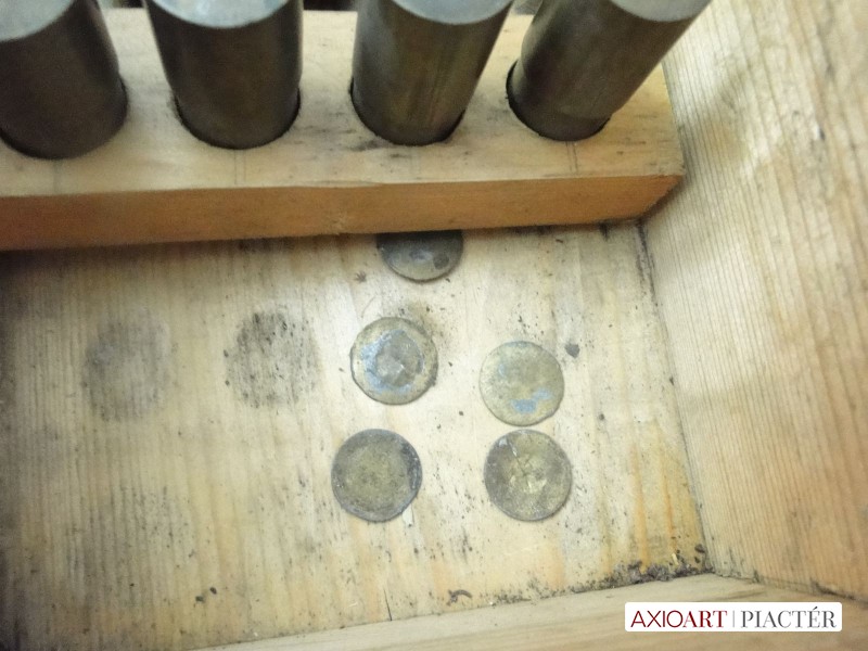 A dobozban összesen 19 darab hüvely található, üresek. A tárolóban ezen kívül még egy nagy méretű 1,5 x 19,5 cm méretű régi fúrószár található.
