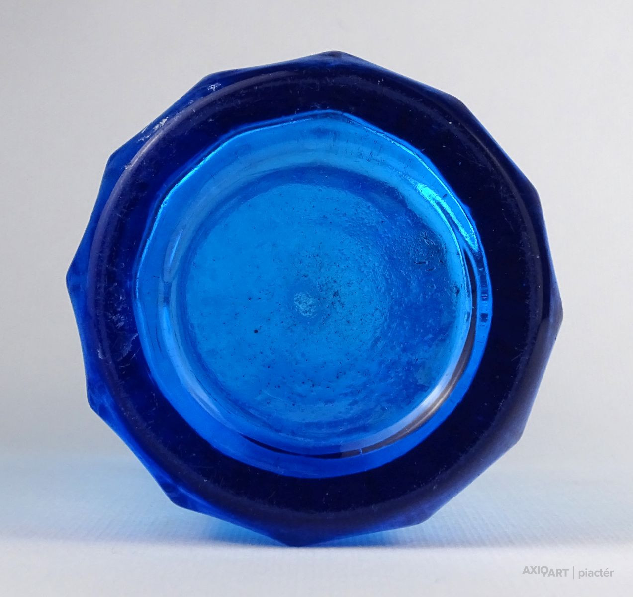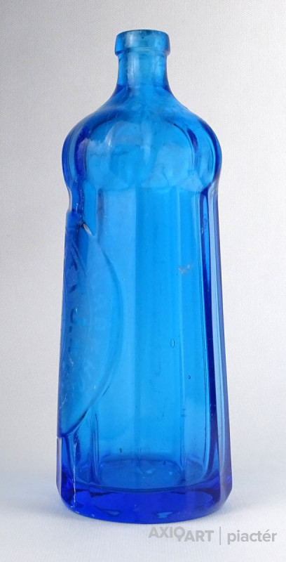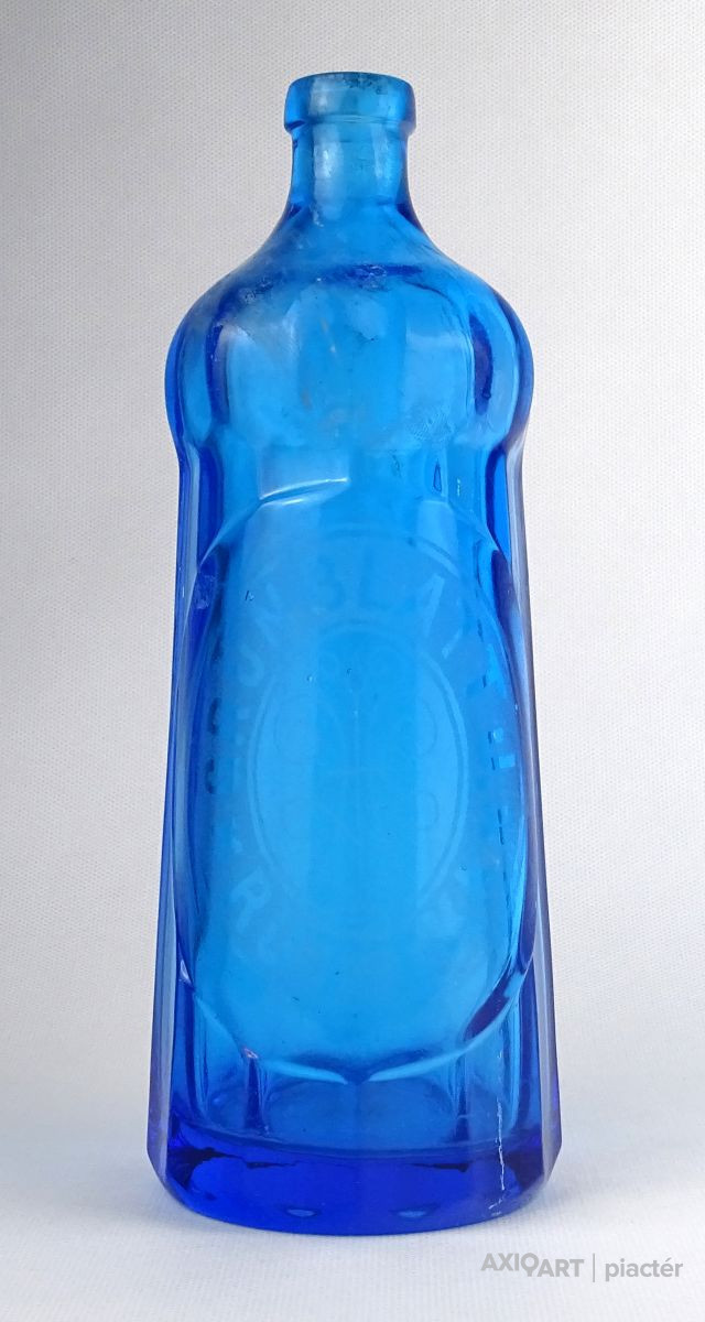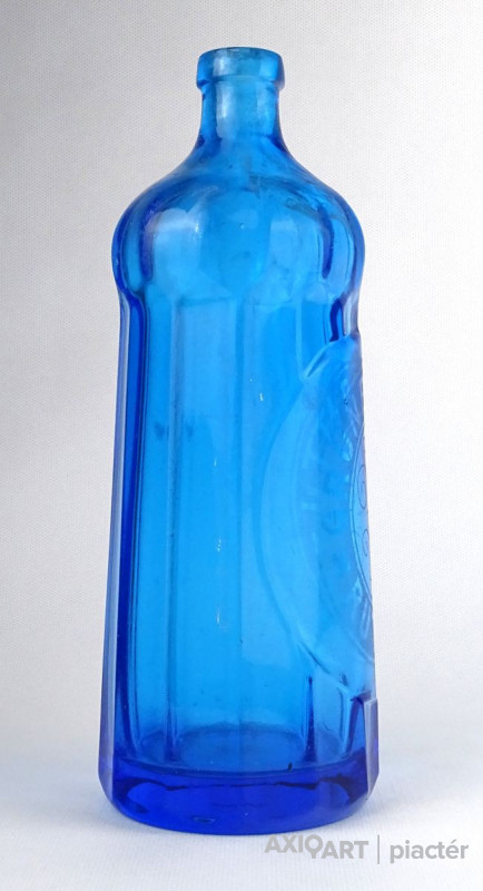 Antik, szép állapotú, nem törött, nem repedt, gyűjteménybe való szódásüveg, homokfúvott felirattal. Gyönyörű élénk kék színű test, fényben enyhén irizáló.