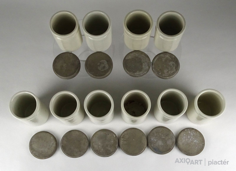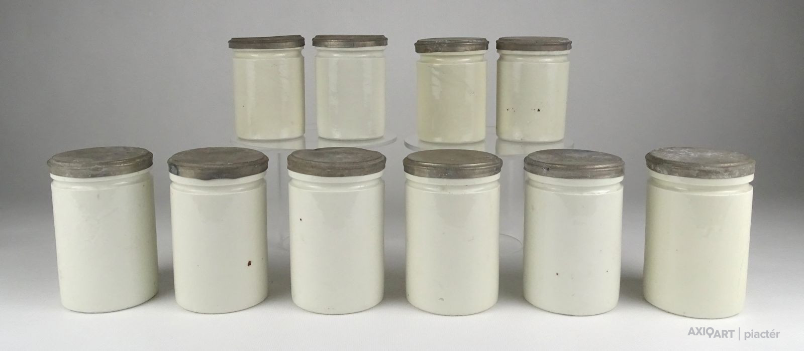 Régi hibátlan állapotú, porcelán gyógyszertári tároló edény, patika tégely készlet, tíz darab kétféle méretből: