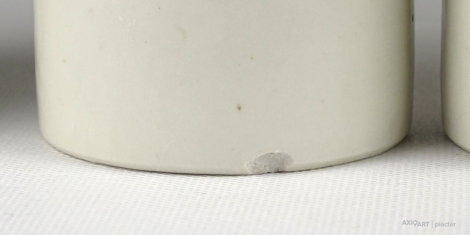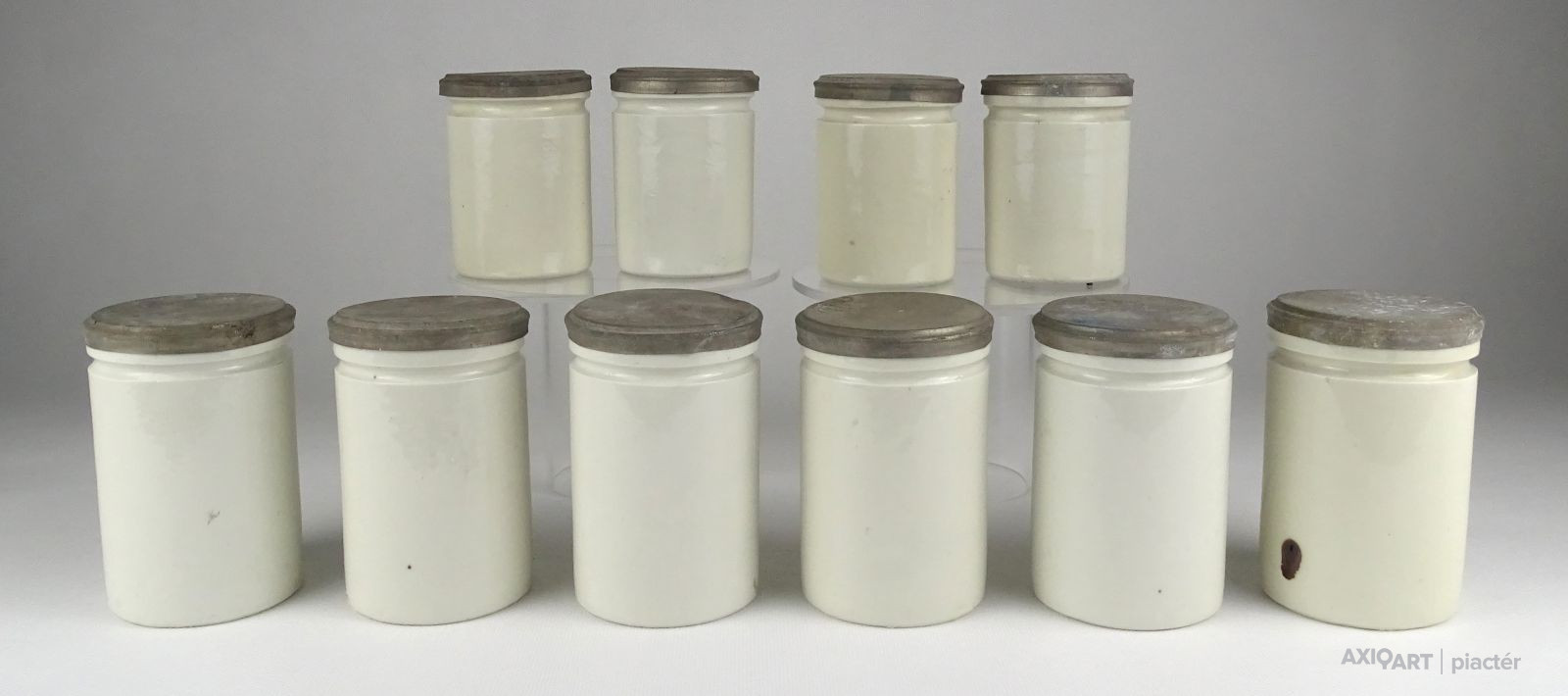 [1L186/X312] Régi hibátlan állapotú, porcelán gyógyszertári tároló edény, patika tégely készlet, tíz darab kétféle méretből: - 6 darab 11 x 7 cm-es (250ml) - 4 darab 9 x 6.5 cm-es (150ml) Súly: 2.695 kg   Magassága 19 cm, átmérője 7 cm. Súlya 437 g. A Barcsay dinasztia  Szeged városképi jelentőségű polgára dr. Barcsay István. Nemesi tartás, valamint kifogástalan modor jellemzi, nagy valószínűséggel dinasztikus alapokon. A család gyökérzete Barcsay Ákosig, Erdély egykori fejedelméig (1658–1660) is elér, így aztán nem meglepő, hogy a felmenők sorában többek között földbirtokosok, ispánok, magas rangú katonatisztek találhatóak. „A Barcsay család, pontosabban a Nagy-Barcsai família Erdély legrégibb családjai közül való, azonban Magyarországon, Bihar megyében is rendelkeztek földbirtokokkal. Erdélyben Hunyad megyében van a família ősfészke, jelesül Nagybarcsán, ahonnan a családnév is származik. A pestyéni és szálfai birtokrészeket első foglalási joggal bírták. Bírtuk. Címere a családnak egy nyíllal átlőtt kar, mely markában görbe kardot tart. E címer és a nemesi hagyomány ellenére a családnak soha nem volt armálisa, azaz a címert leíró oklevele” – mondja István bevezetésként. A család első ismert őse okmányilag igazolhatóan a XIII. század közepén élt Iwanche (más formában: Ivancheo, Joancha). Ezt követően a család származása jól levezethető. A Nagy-Barcsai Barcsay családnak (melyből a fejedelem származott) egyik ága 1702-ben a Bihar megyei Margitán és a vele szomszédos Klárafalván szerzett részbirtokot. Ebből az ágból született 1811-ben Barcsay István (1811–1892) ’48-as honvéd hadnagy, aki Debrecenben szolgált ügyészként, majd ugyanott városi tanácsnokként. Felesége Ivány Eszter (1820–1864) volt. Házasságukból öt gyermek származott, közöttük Károly, aki gyógyszerész lett, s ezzel dinasztiát alapított a dinasztián belül. Barcsay Károly Barcsay Károly senior (1841, Debrecen – 1913, Debrecen) iskoláit szülővárosában végezte. 1863-ban a Pesti Magyar Királyi Tudományegyetemen gyógyszerészeti diplomát szerzett. Megvette az 1792-ban alapított nyíregyházi Arany Sas reáljogú gyógyszertárat, melynek 1875-ig volt tulajdonosa. 1875. március 27-én 28 000 forintért megvásárolta a Götz örökösöktől az 1812-ben alapított szegedi, Isteni Gondviselésről elnevezett reáljogú gyógyszertárat. Hamarosan a virilista polgárok listáján a harmadik helyre küzdötte fel magát. Az 1879-es árvíz alkalmával már az első napokban tagja volt annak a bizottságnak, mely a szükséges teendőkről intézkedett. Nevéhez fűződik a Szegedi Kerületi Betegsegélyező Pénztár felállítása, melynek elnökévé választották. Tagja volt a Nimród Vadásztársaságnak is. Szatymazon és annak környékén 55 holdon telepített szőlőt, ahol 280 fajta szőlőt termesztett. Itt kell megjegyeznünk, hogy Szeged város határa 1950-ig elnyúlt a mai Bács-Kiskun megye határvonaláig, s itt a filoxéravész (1875–1895) után kiterjedt szőlőbirtokok voltak. A Tiszától Átokházáig nyúló kelet-nyugati, valamint a Szatymaztól Horgosig terjedő észak-déli kiterjedésben 20 000 hektár szőlőt műveltek. A fajtanemesítés, illetve az oltványozás is gyakorlattá alakult. E magas szintű agrokultúrában vezérszerepet töltött be Barcsay Károly, aki nemes gyümölcsfáival sok díjat és elismerést szerzett. 1895 és 1905 között a Szatymazi Gazdakör elnöki tisztét töltötte be. Első felesége Pfannschmiedt Gizella (1846–1900) volt, akitől hét gyermeke született, köztük Károly, a későbbi gyógyszerész. Felesége halála után visszavonult, szegény sorsú családok számára alapítványt hozott létre, vagyonát szétosztotta, gyógyszertárát fia örökölte. Palicsra költözött és feleségül vette Markovszki Emmát (1874–1966), tőle két gyermek született. Debrecenben a Páterfia Református Temetőben helyezték örök nyugalomra. Barcsay Károly junior (1875, Szeged – 1955, Szeged) iskoláit szülővárosában végezte, majd a Budapesti Királyi Magyar Tudományegyetemen gyógyszerészhallgatóként folytatta tanulmányait. Gyakornoki idejét a neves budapesti Török gyógyszertárban töltötte. Gyógyszerészi diplomát 1900-ban nyert. Befejezve katonai szolgálatát tartalékos hadnagyként szerelt le. 1904-ben feleségül vette Hutter Juliannát (1880–1962). Károly nevű gyermeke korán elhunyt, István fia 1924-ben született. Élénk társadalmi tevékenységet fejtett ki. Törvényhatósági bizottsági tag volt. „Fontos megjegyeznem, hogy a Szegedi Református Egyházban presbiteri tisztséget töltött be, és tagja volt a Kálvinista Körnek. Elnökének választotta a Szegedi Polgári Dalárda, örökös díszelnökévé a Szegedi Visszhang Dalkör” – emeli ki az utód. Barcsay Károly sokat tett Szeged sportéletének fejlesztéséért. Első elnöke volt a Szegedi Úszó Egyesületnek (SZUE – erről nevezték el a híd újszegedi lábánál lévő uszodát, a szegediek legendás találkozóhelyét, a vízilabda és az úszósport fellegvárát). A Szegedi Tornaegyesületnek és a Szegedi Evezős Klubnak elnöke, a Tisza Szegedi Evezős Egyletnek pedig pártoló tagja volt. A Magyarországi Gyógyszerész Egyesület Szeged-vidéki Kerületének vezetőségi tagjává választották.  A régi patika a Tisza Lajos körúton Forrás: https://nqv.hu/portre/a-barcsay-dinasztia/