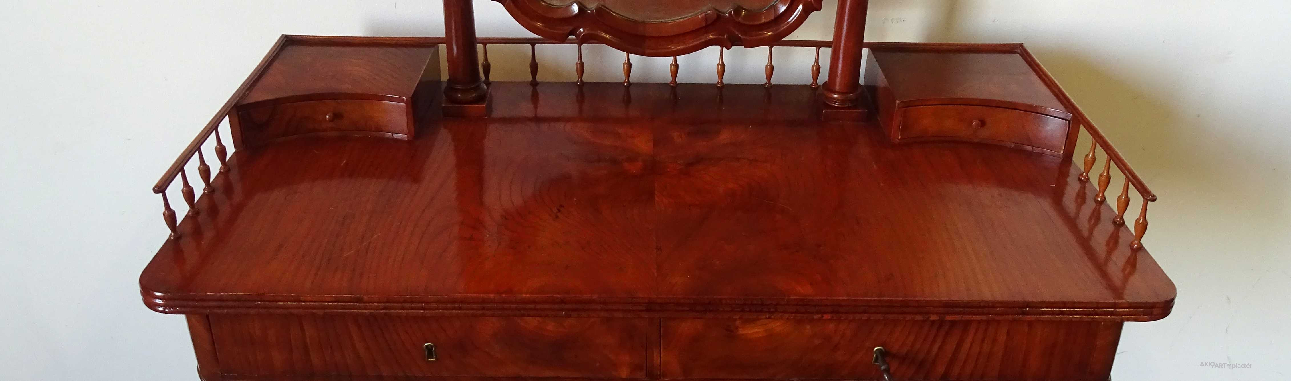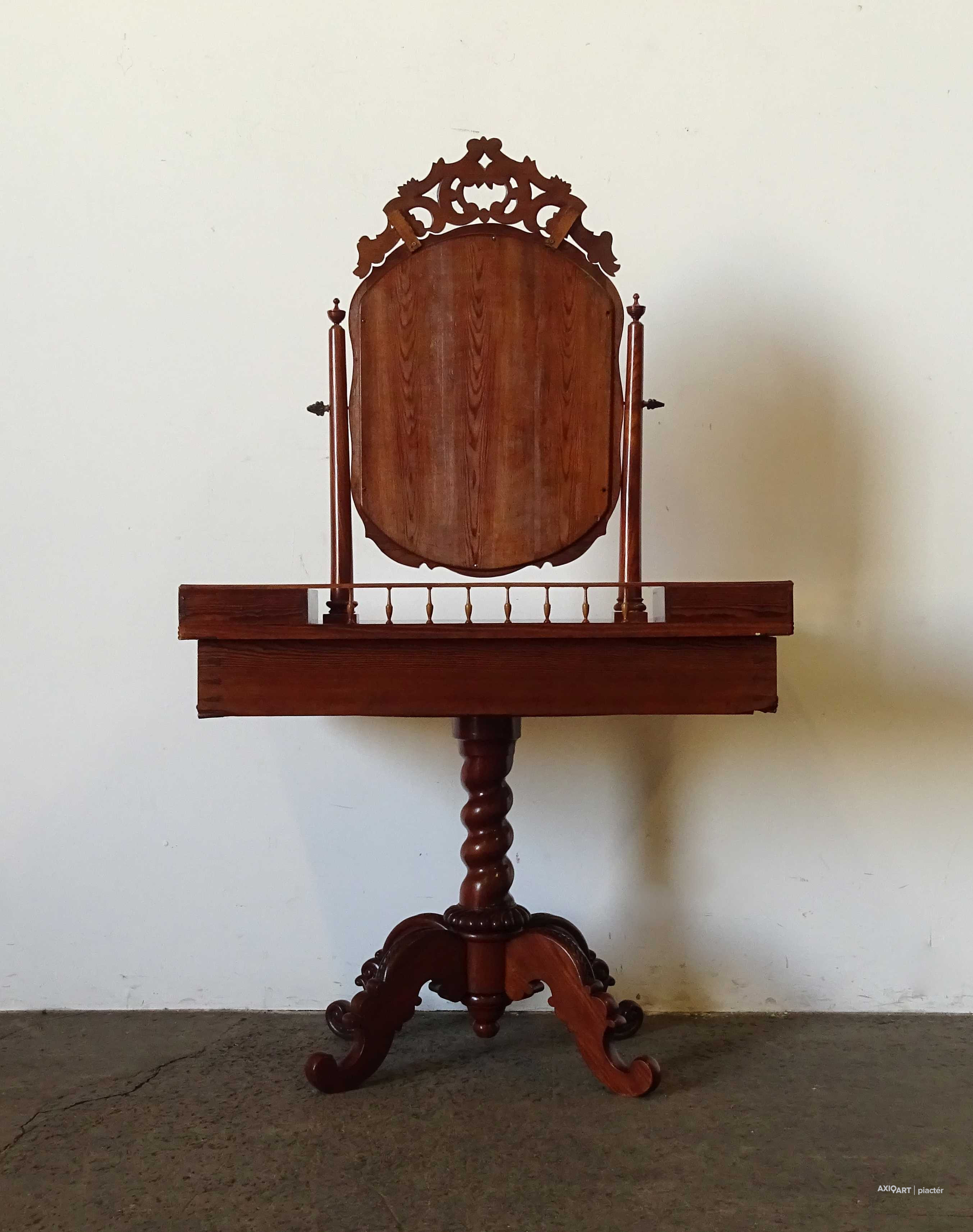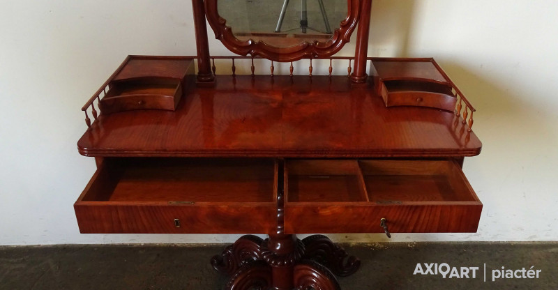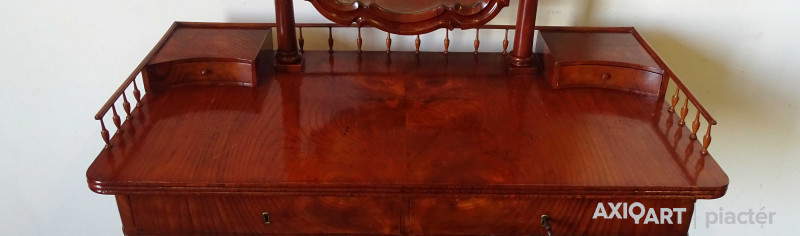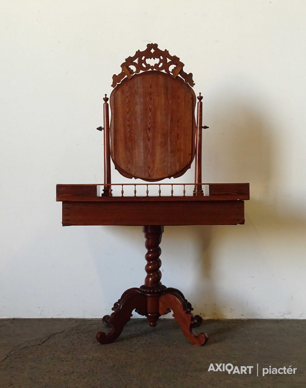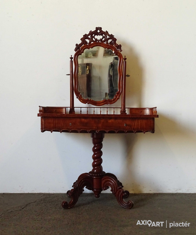 Antik, szép állapotú, neobarokk tükrös fésülködő asztal. Két nagy és két kis fiókkal. Az asztallapon finom, esztergált oszlopos korlát fut körbe, a tükör tetejét és a lábait is gazdag faragás díszíti. Kulcsa megvan. Néhány kisebb furnér hiba található rajta.