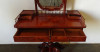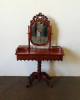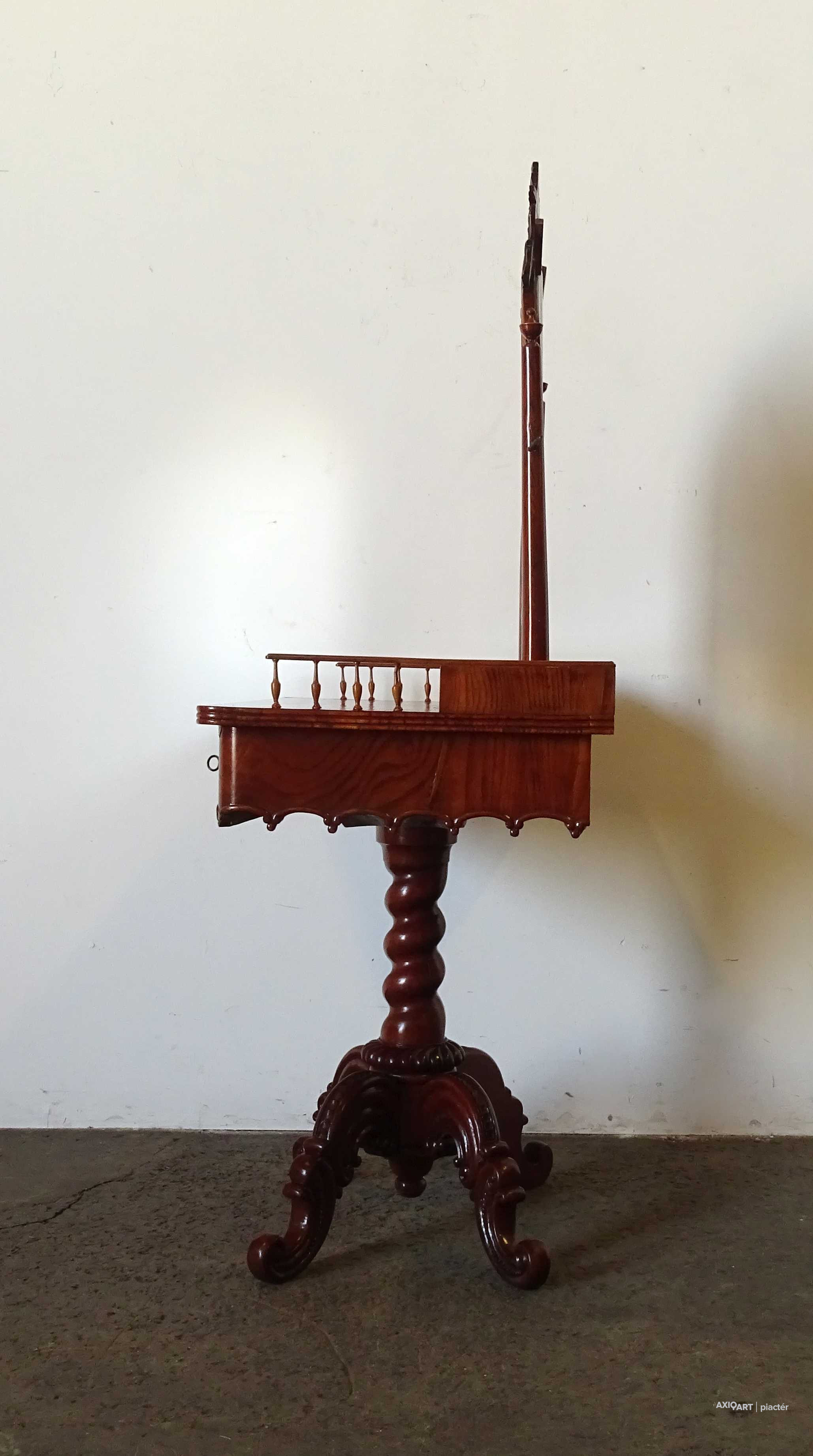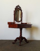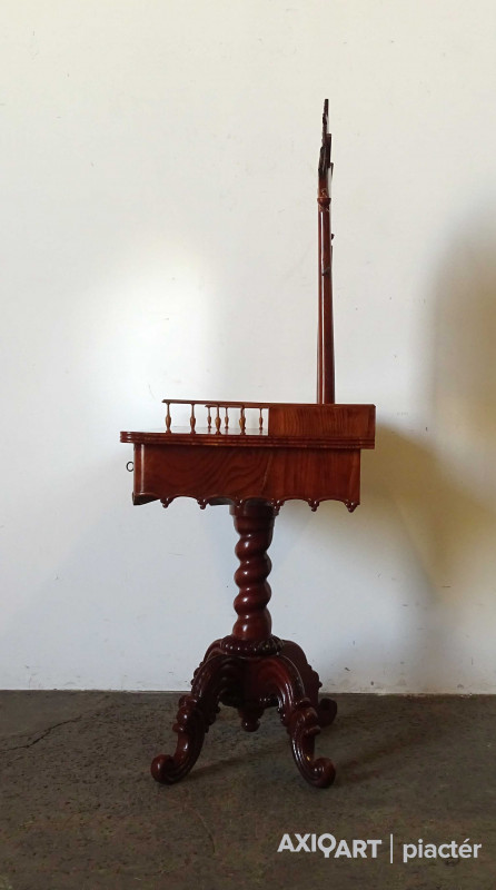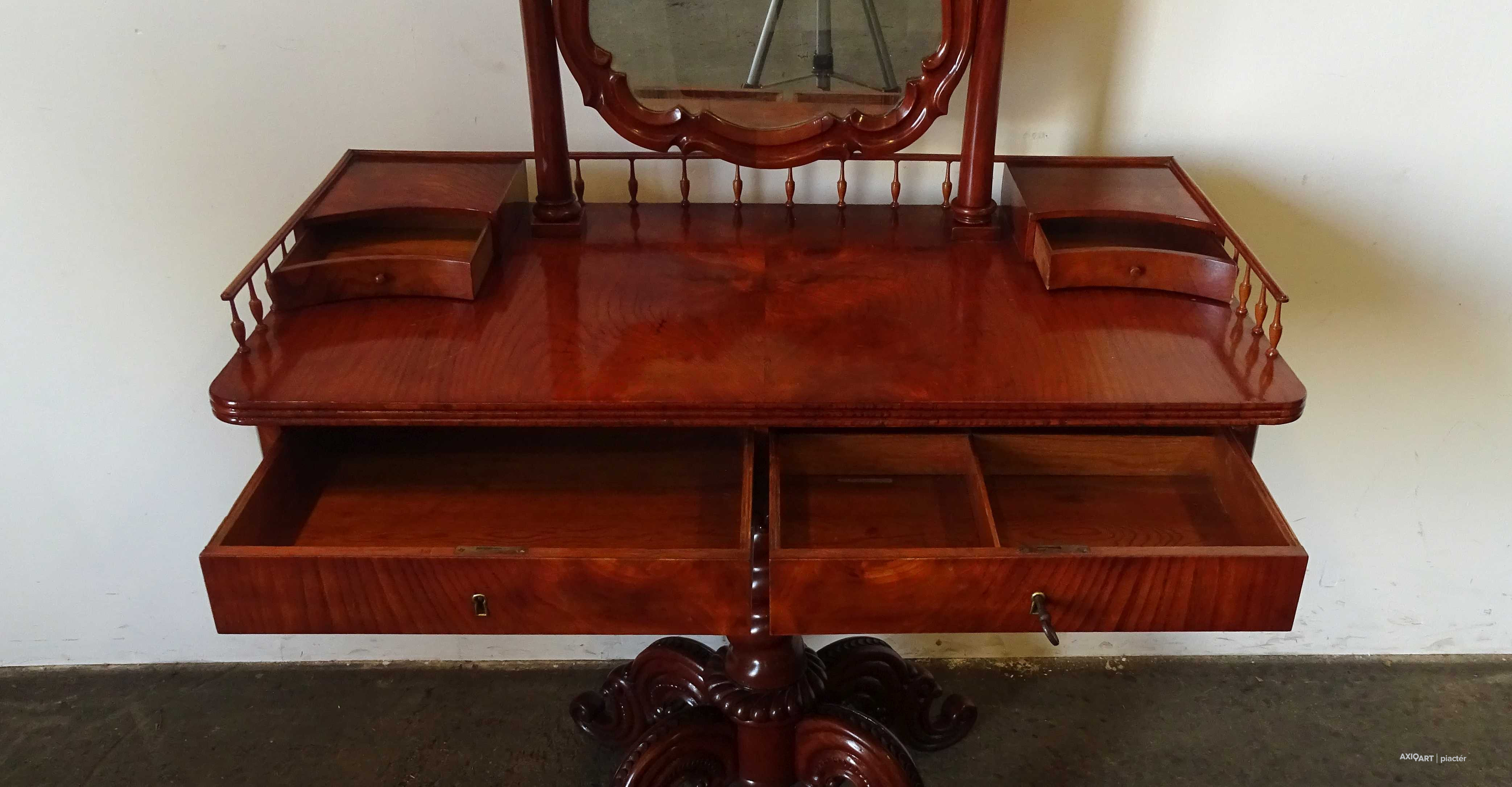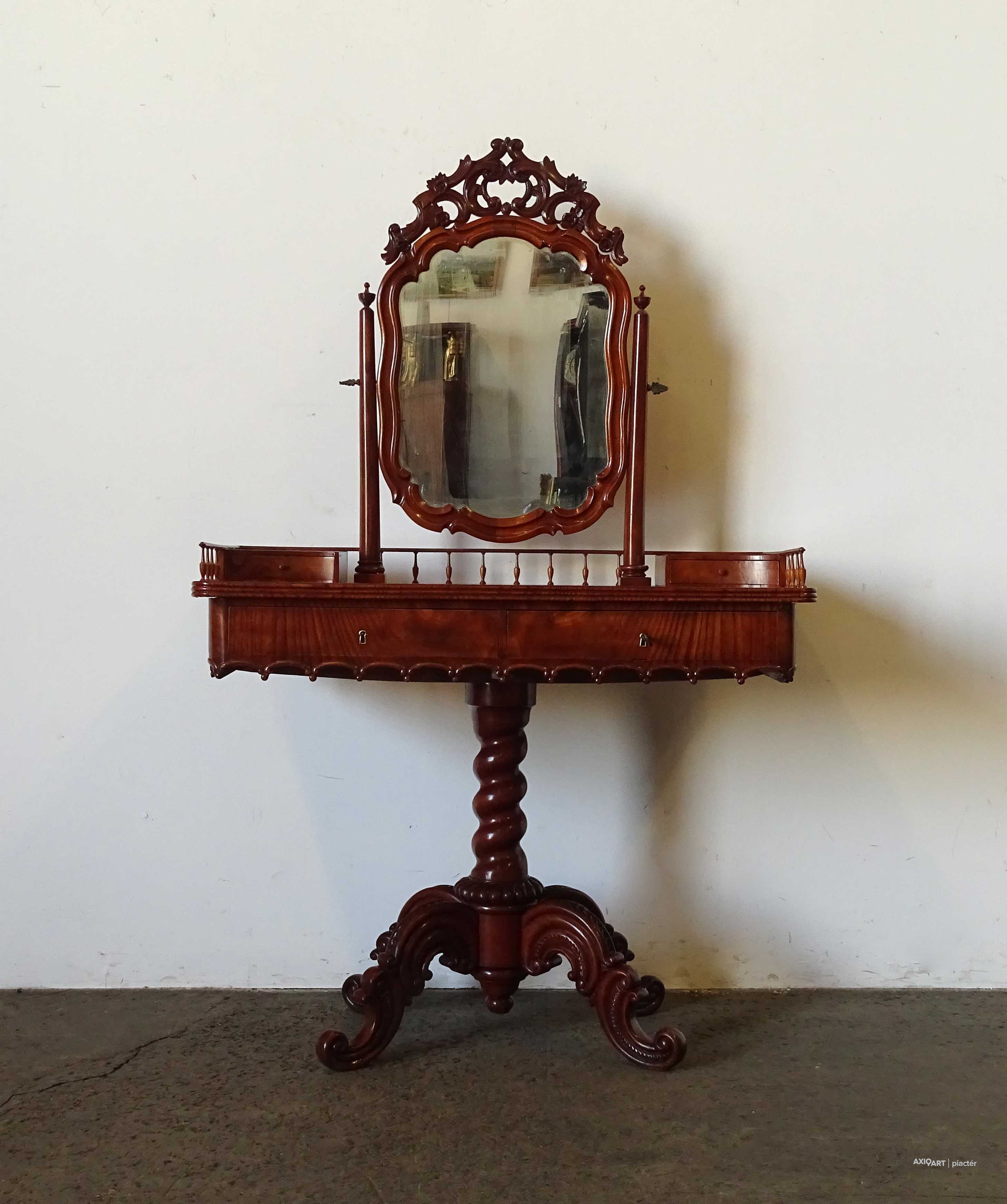 Antik, szép állapotú, neobarokk tükrös fésülködő asztal. Két nagy és két kis fiókkal. Az asztallapon finom, esztergált oszlopos korlát fut körbe, a tükör tetejét és a lábait is gazdag faragás díszíti. Kulcsa megvan. Néhány kisebb furnér hiba található rajta.