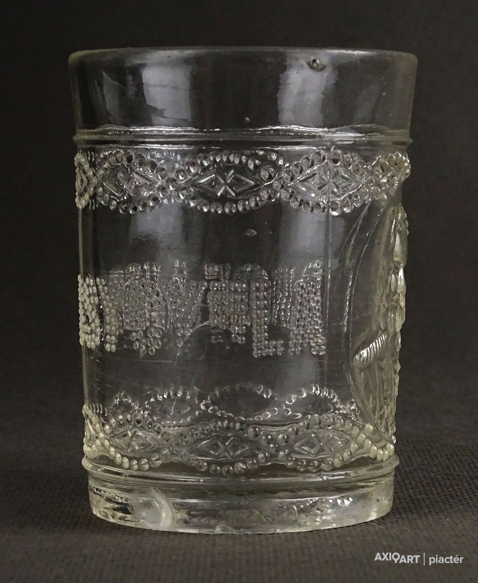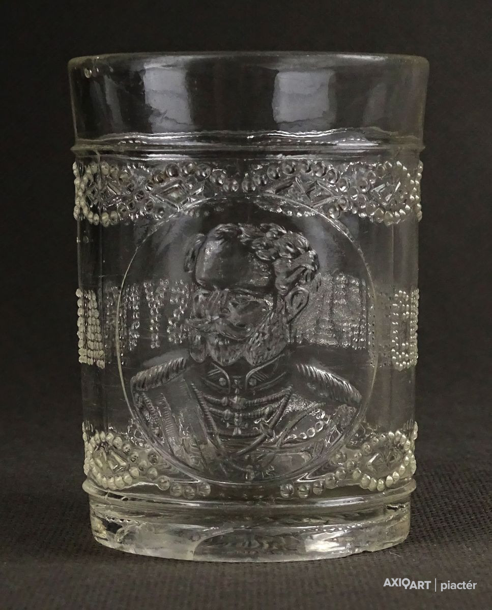 [1R733/Z028] Antik, szép állapotú áttetsző üveg pohár. Talp peremén lepattanások találhatók, lásd fotó. Oldalán portré és felirat: GRÓF ANDRÁSSY GYULA Magasság: 7.7 cm Szélesség: 5.8 cm Súly: 0.175 kg