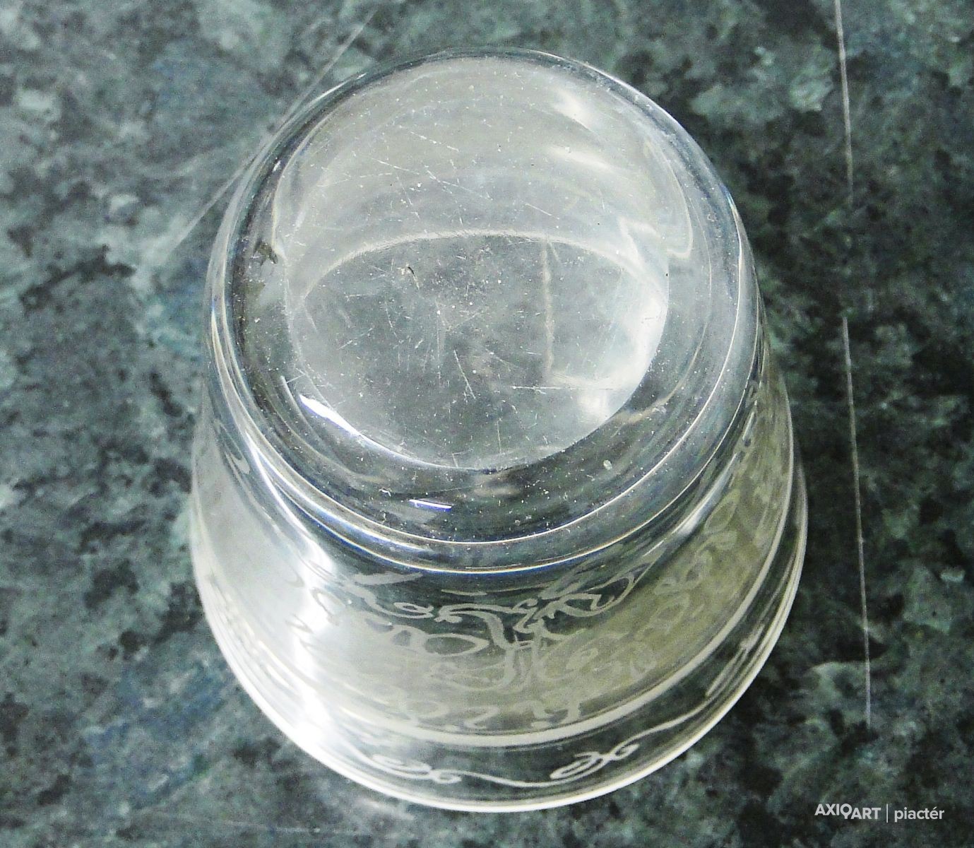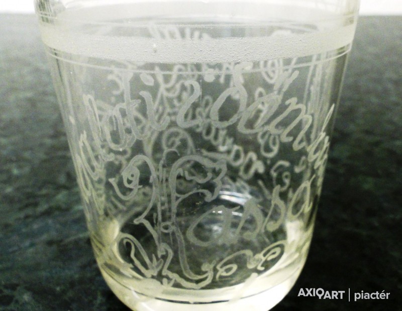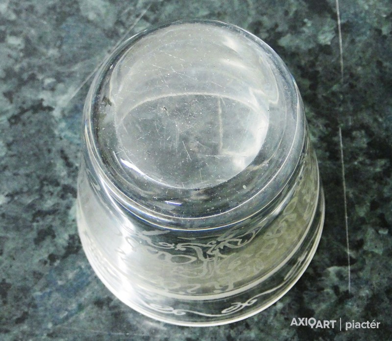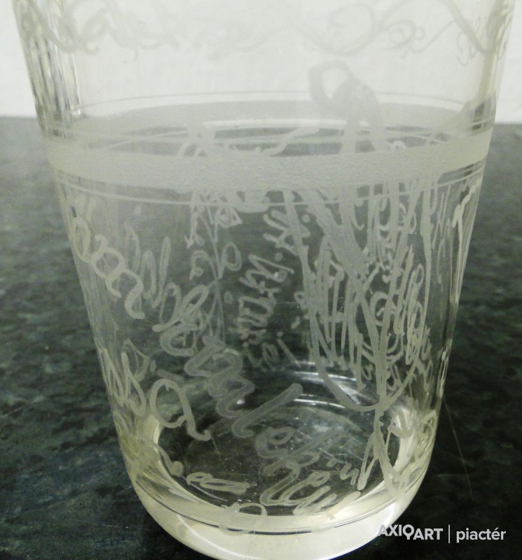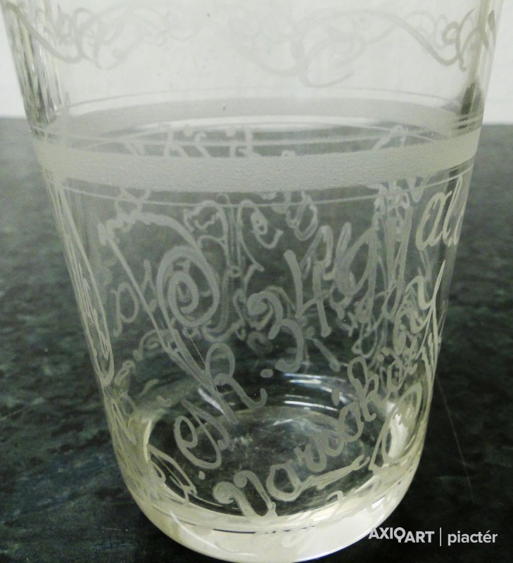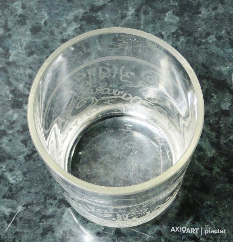 [0L451/VTR-14] Szép állapotú, feliratos katonai, hadi emlékpohár. Oldalán feliratok: SZOLGÁLATI IDŐM EMLÉKÉÜL KASSA 1910 CS ÉS K. 34. GYAL. EZR. 14. SZÁZ. Magasság: 10 cm Szélesség: 7.2 cm Súly: 0.166 kg