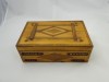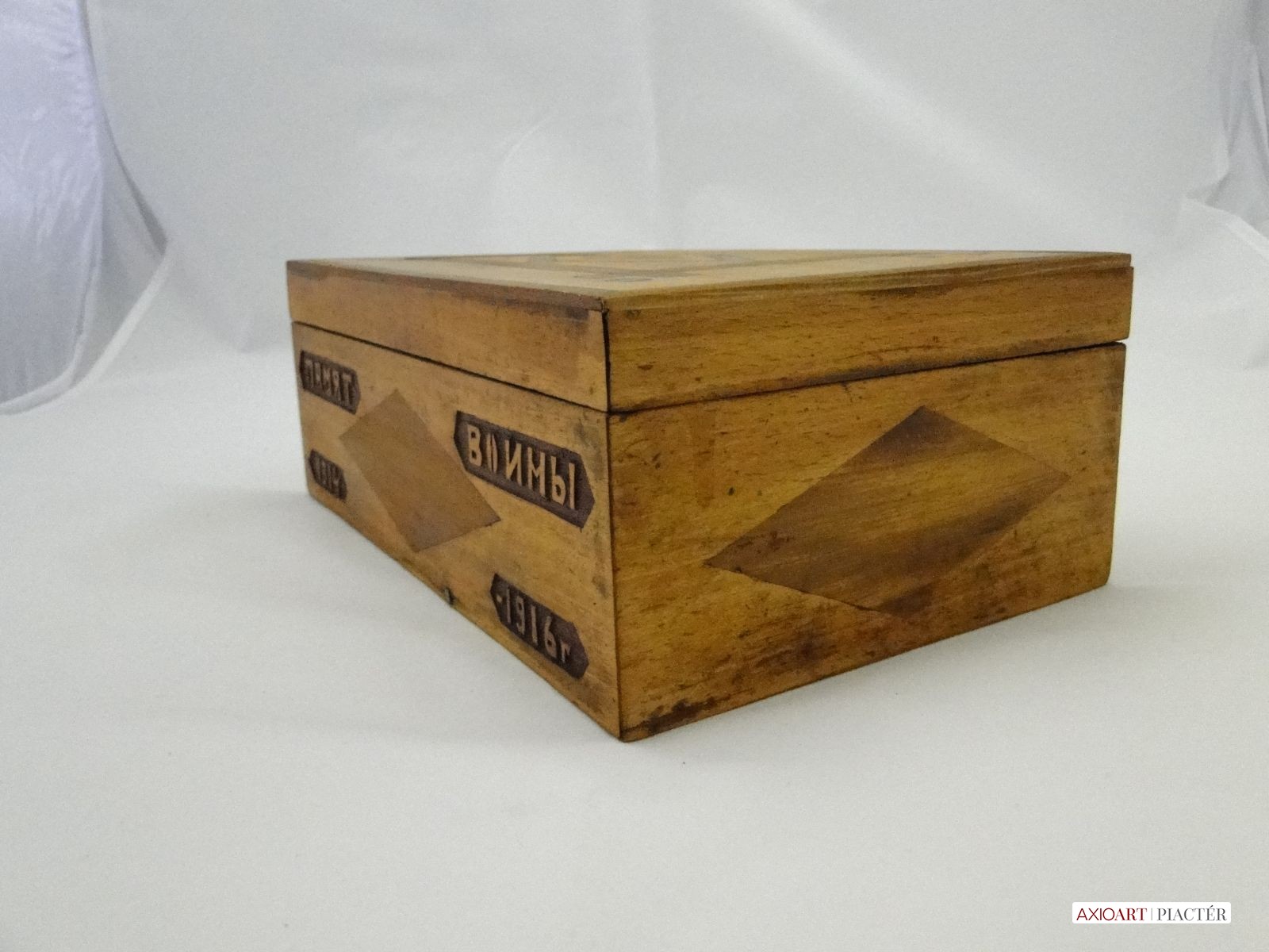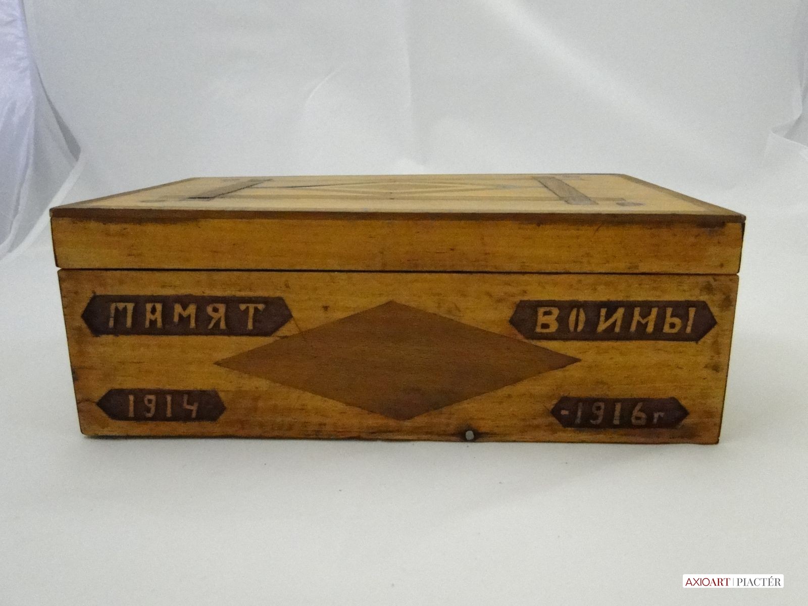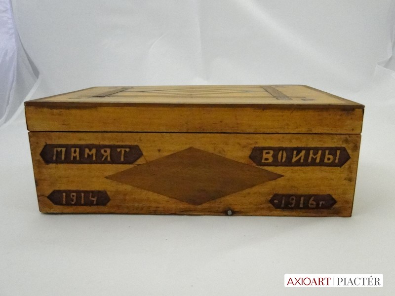 [6153/UZ-N] Orosz feliratos első világháborús fadoboz, emlék 1914-16-ból. Tetején egyszerű fa intarziával. A doboz oldalán orosz felirat, alatta datált 1914-16. памяти (EMLÉK) ВОЙНЫ (HÁBORÚ) 1914-1916 Gyűjteménybe való darab. Magasság: 10 cm Szélesség: 17 cm Hosszúság: 27 cm Súly: 0.967 kg