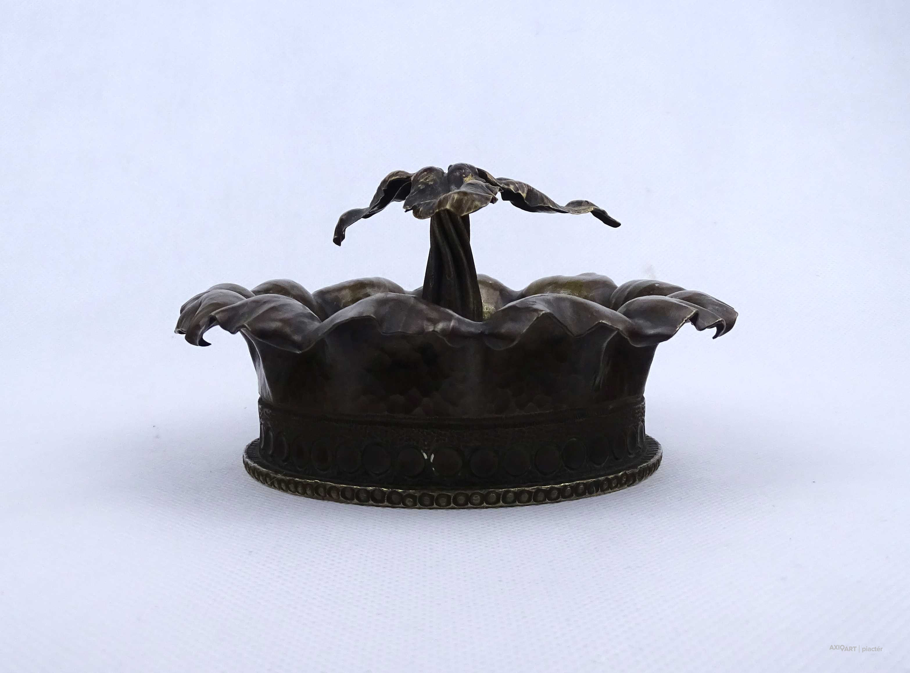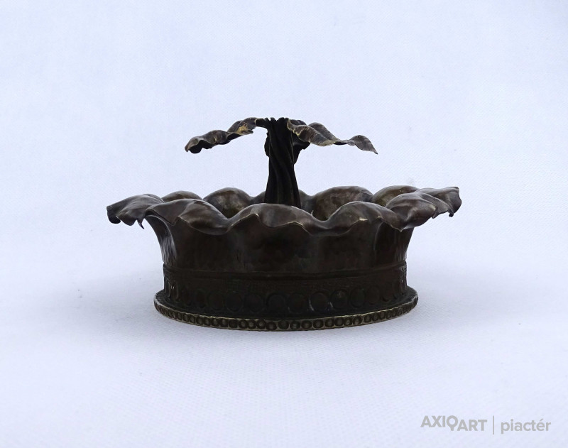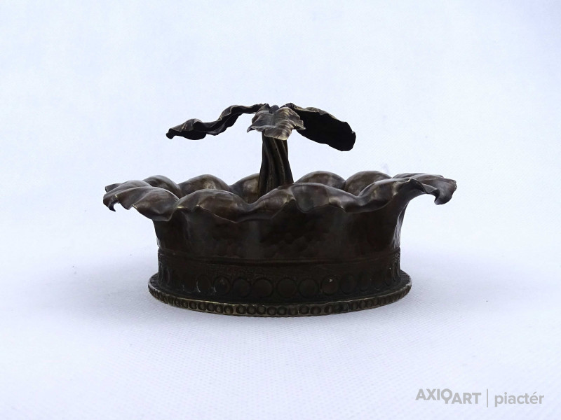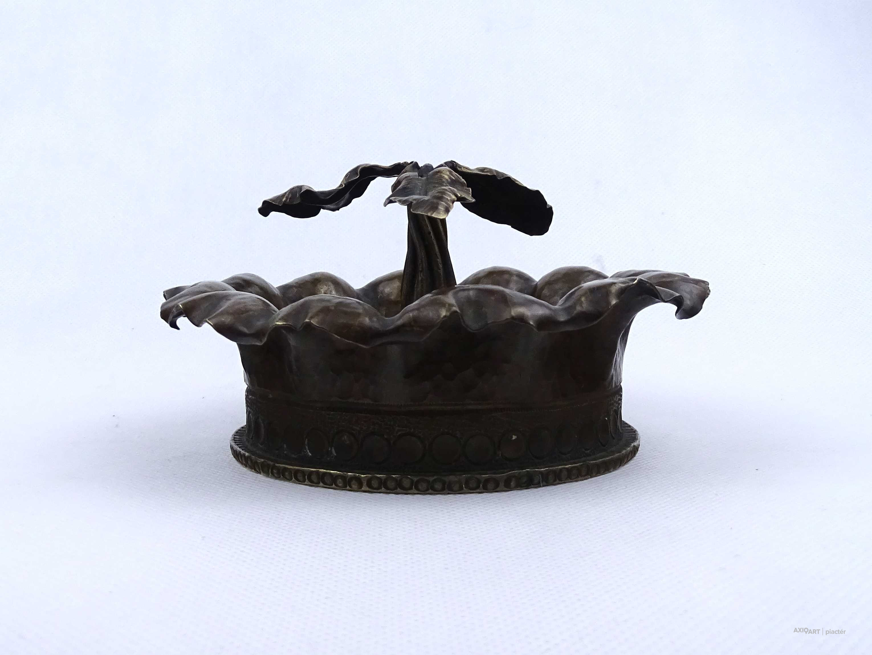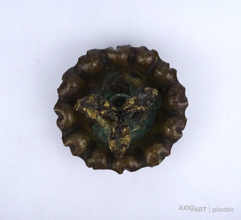 [2A043/X101] Antik, első világháborús hadi relikvia, hadi emlék. 1917-ben készült löveghüvelyből készített, szépen megmunkált, hadifogoly munka, hadi emlék, plasztikus dísztárgy. Oldalán kalapált és vésett díszítés, közepén plasztikus csavart törzsű növény, egy stilizált fa látható. Talpán beütött jelek: Wn 17 1917 211 10cmM14 Magasság: 8 cm Szélesség: 15 cm Súly: 0.975 kg   Átmérője 9 magassága 25,5 cm. Súlya: 1317 g.