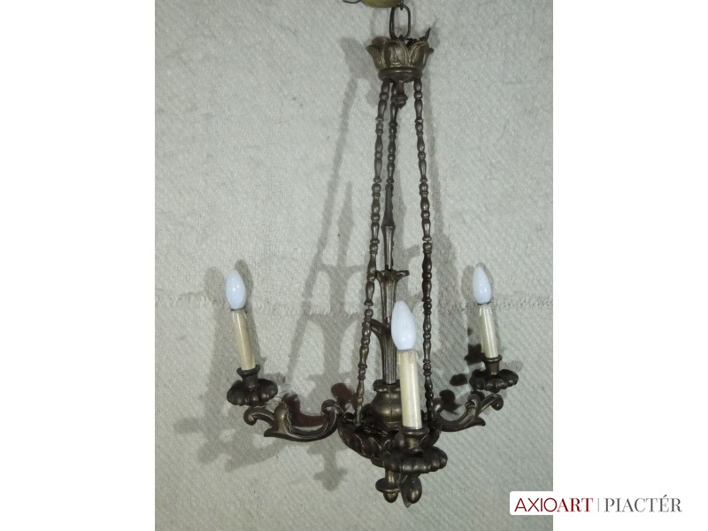[0152/UZ-K] Nagyon szép, igazán régi faragott fa díszekkel rendelkező 3 karos csillár, mennyezeti lámpa. Kora cca. 120-140 éves. A fa díszek aranyozva vannak, szép állapotú darab. A karok papírmasé gyertyákban végződnek, kis méretű izzó való bele. A mennyezettől való lelógása 113 cm. Lánc van rajta, így ez a hossz állítható, bővíthető. A középső rózsa átmérője 18 cm. A karok hossza 20 cm. A csillár közepén látható faragvány magassága 43 cm. A porvédő átmérője 13 cm.
