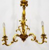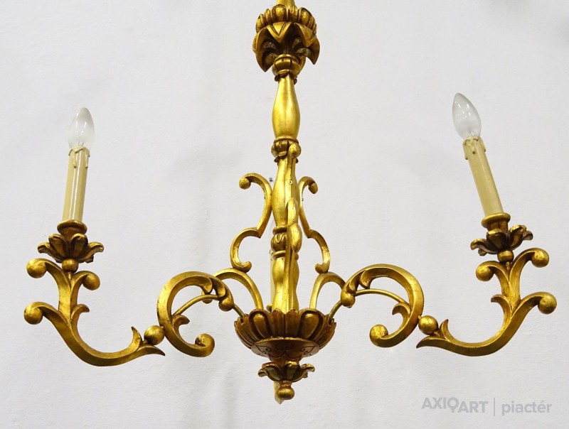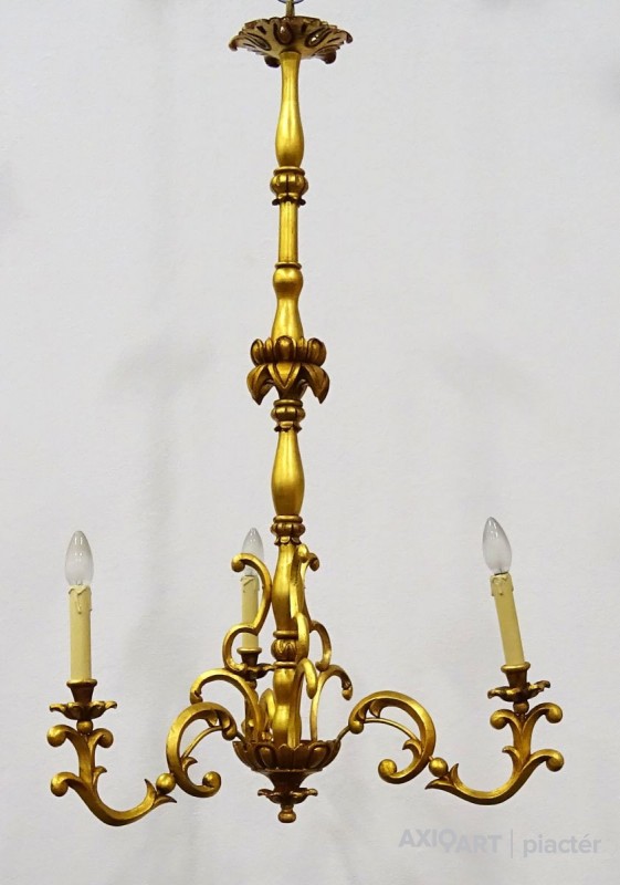 Antik, szép állapotú, szépen faragott, háromágú, mennyezeti lámpa, csillár. A karok papírmasé gyertyákban végződnek, kisméretű izzó való bele. A csillár fa faragásai, szerkezete és aranyozása is teljesen hibátlan. Azonnal enteriőrbe helyezhető állapotban van.