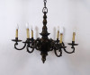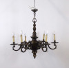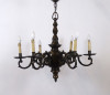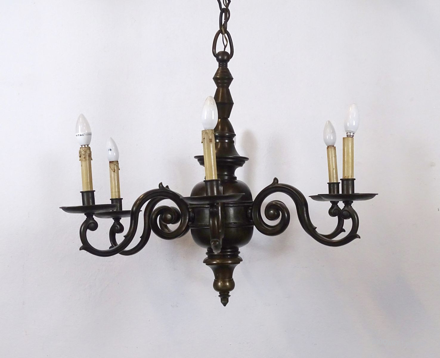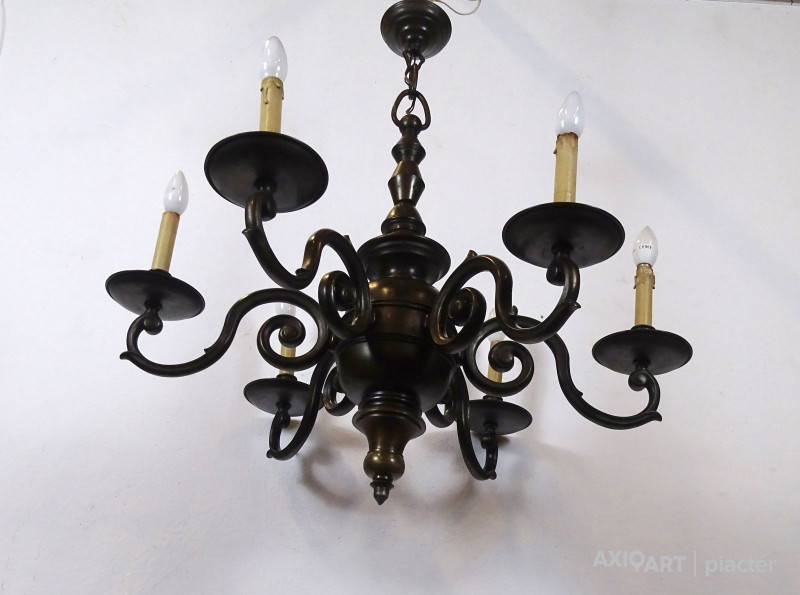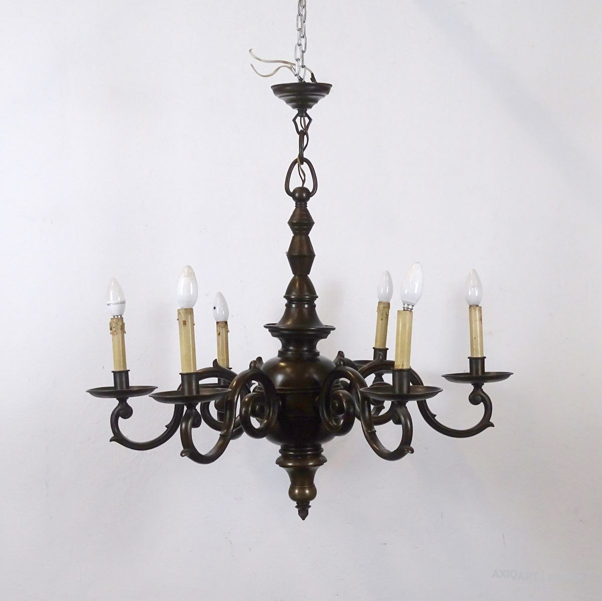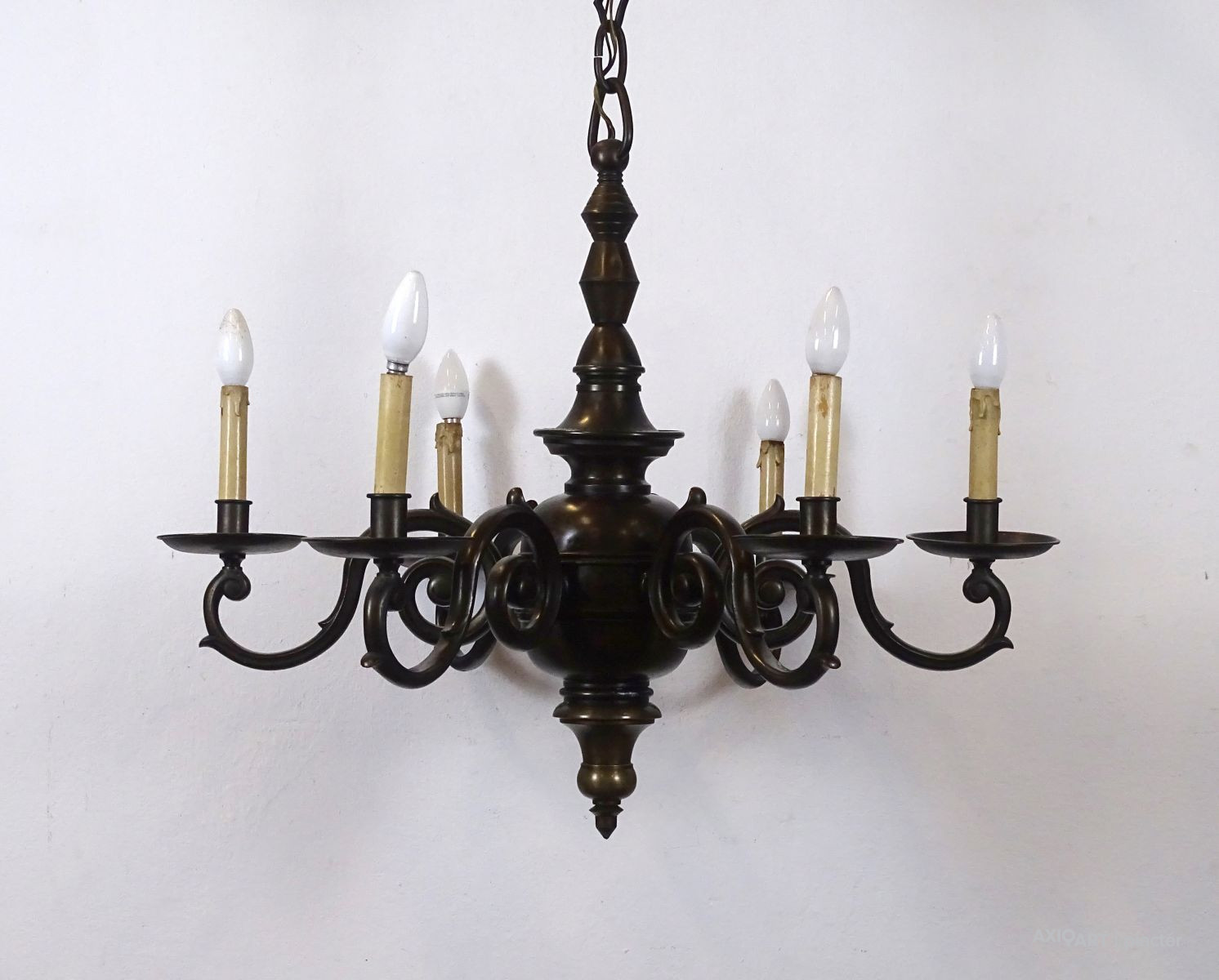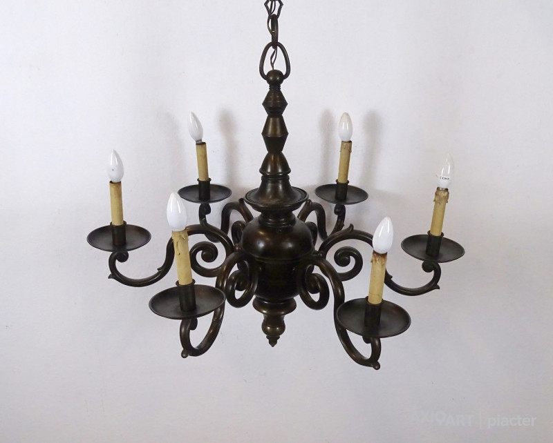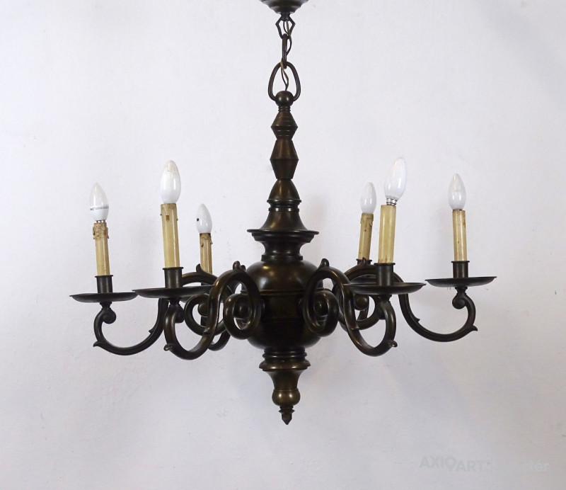 Antik, szép állapotú, hat karú bronz csillár. A karok papírmasé gyertyacsonkokban végződnek, kisméretű (E14) izzó való bele.