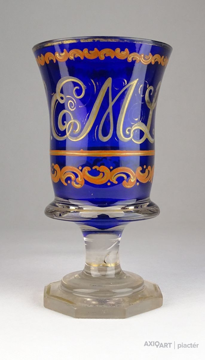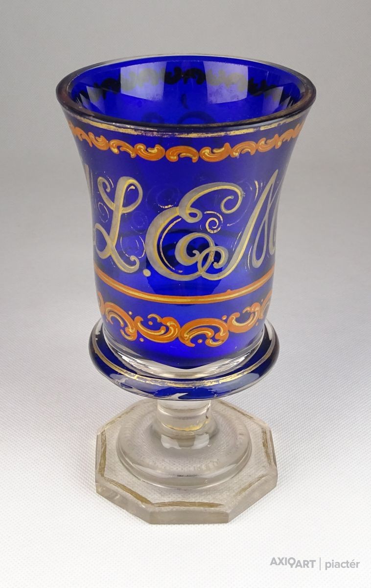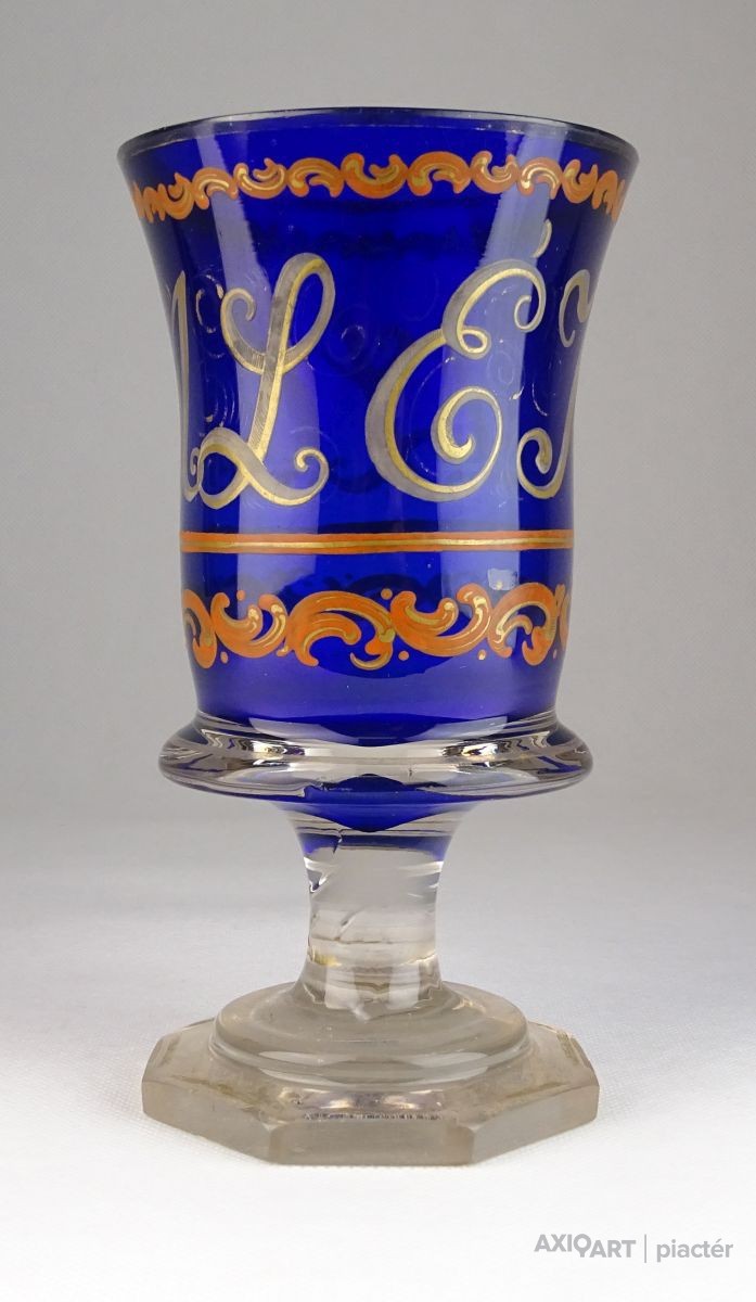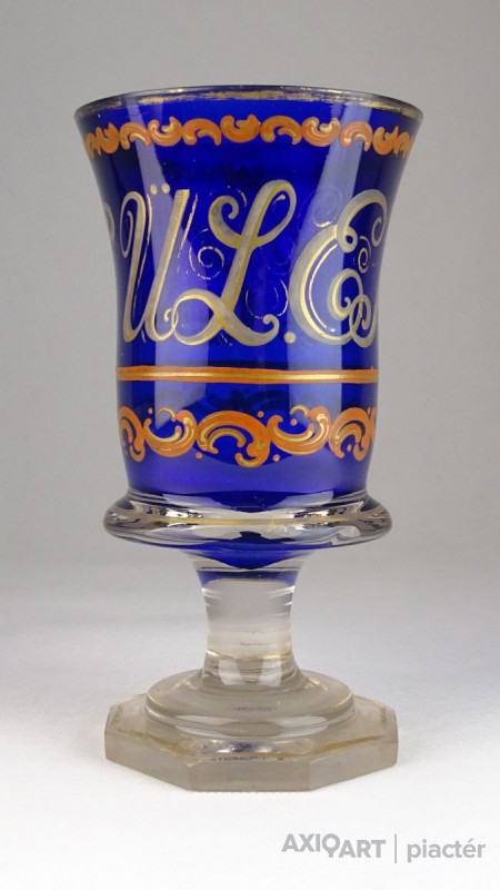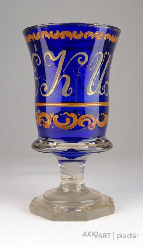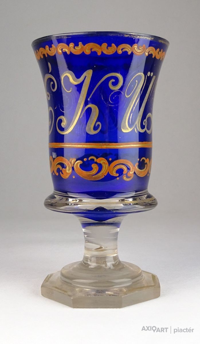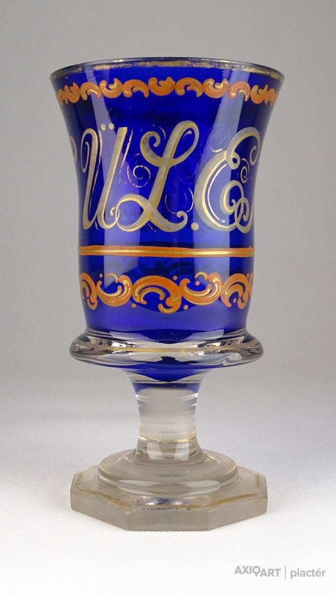 Hibátlan állapotú, antik, 1850 körüli, aranyozottkobaltkék színű vastag falú üveg biedermeier talpas pohár. Oldalán körben felirat:
