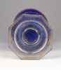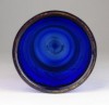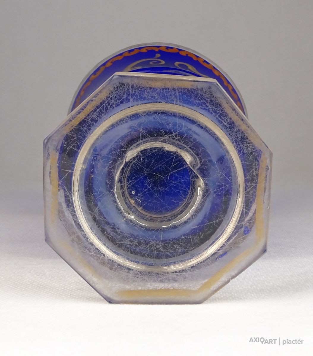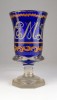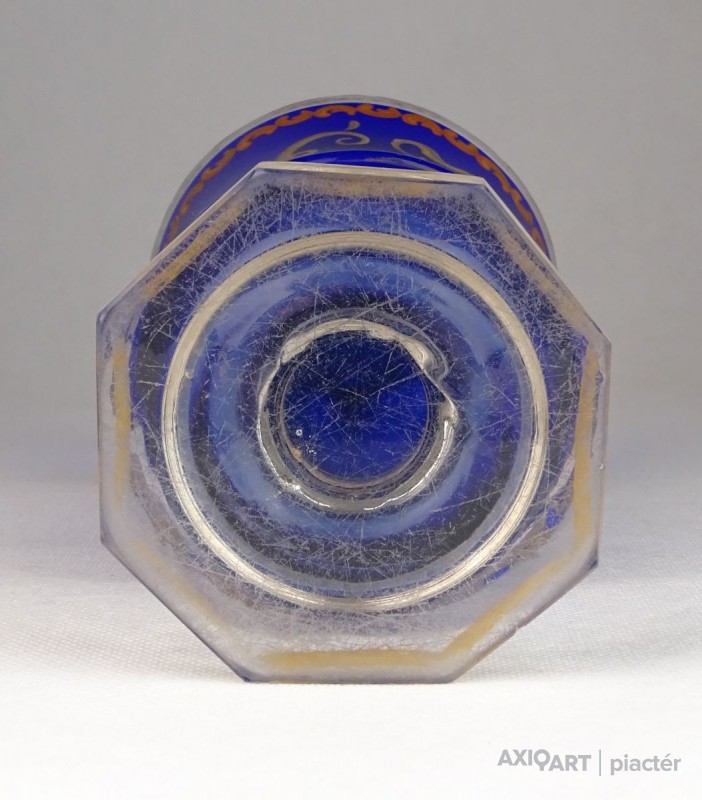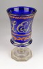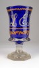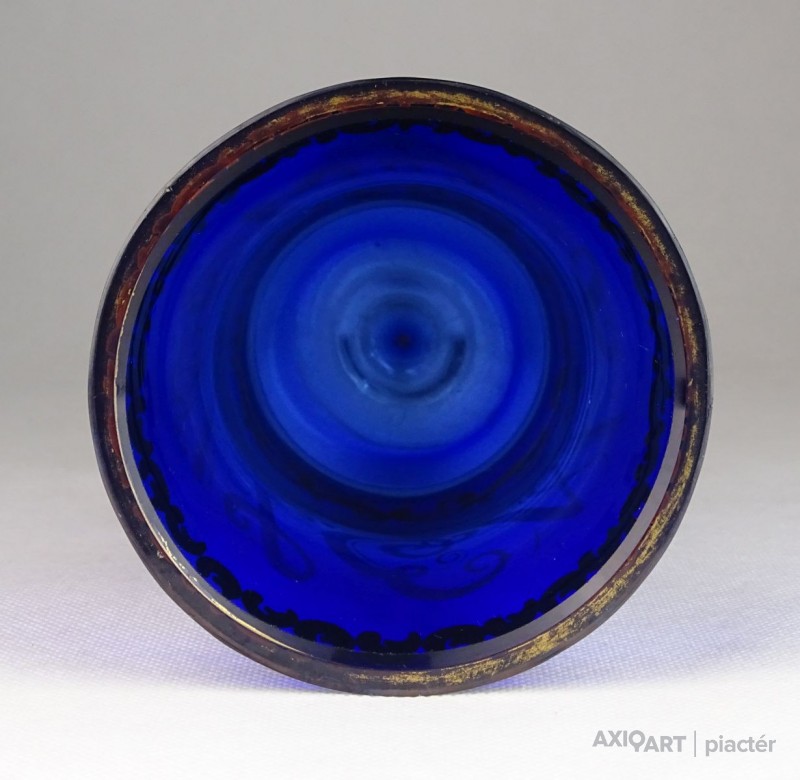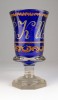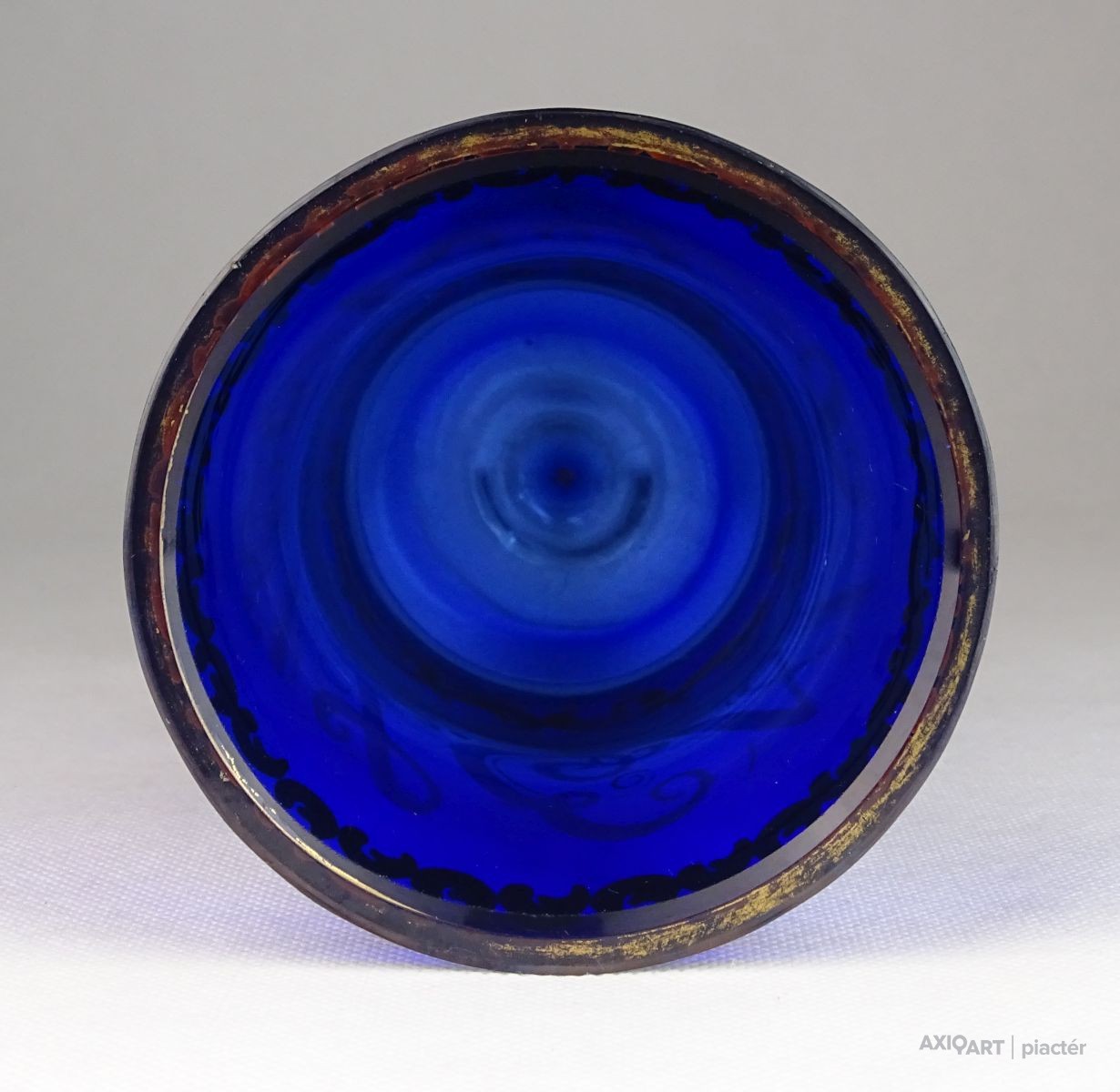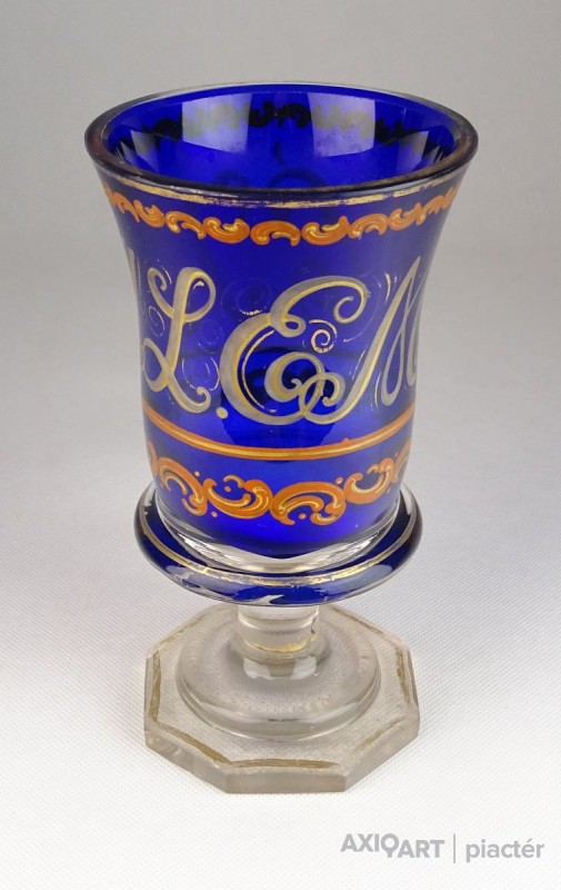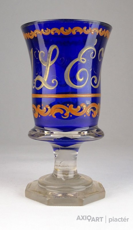 Hibátlan állapotú, antik, 1850 körüli, aranyozottkobaltkék színű vastag falú üveg biedermeier talpas pohár. Oldalán körben felirat: