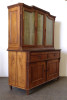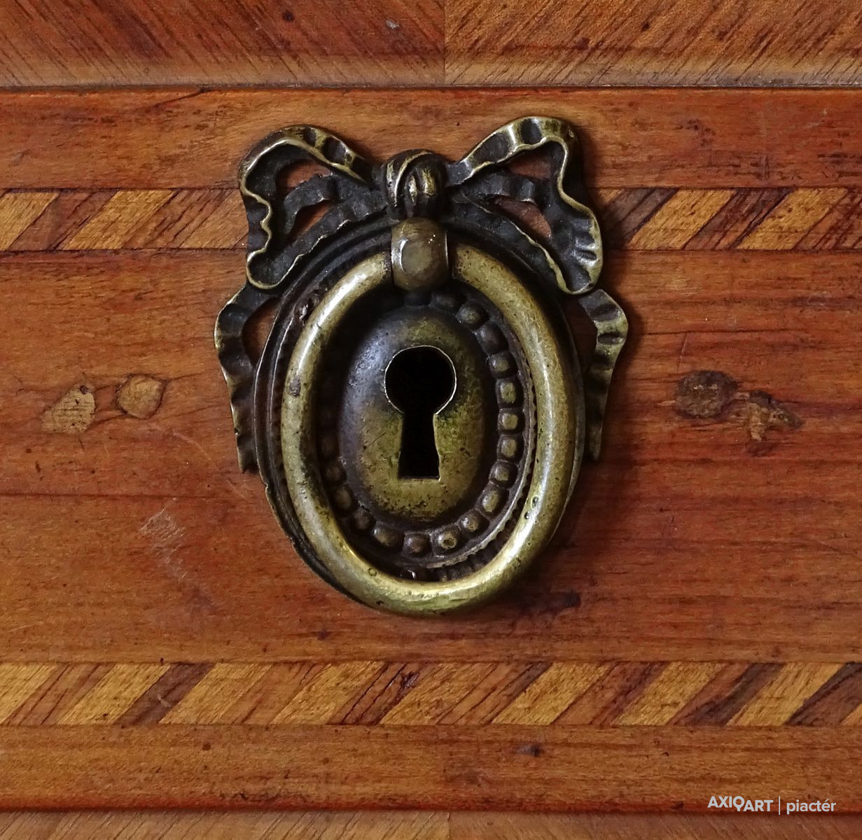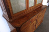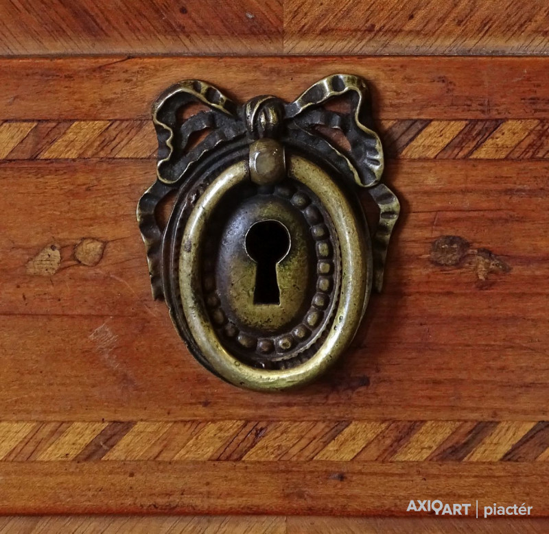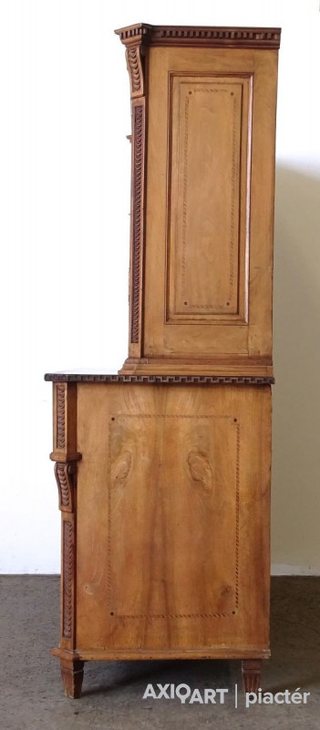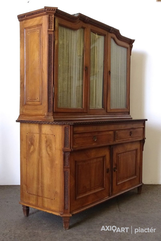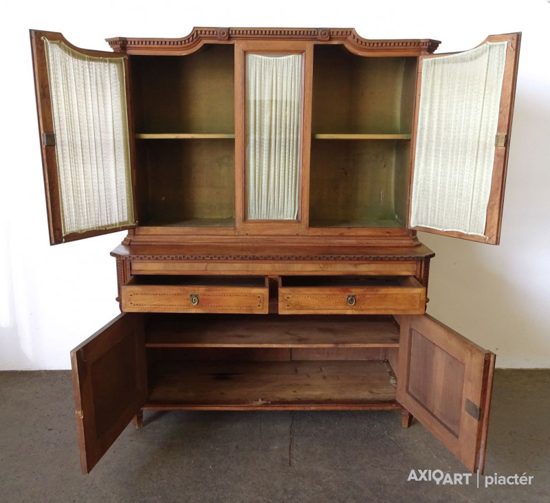 Antik, felújításmentes állapotban lévő, XIX. századi antik üveges könyvszekrény. Felső rész belseje kárpitozott, három üveges ajtaján függöny található. Ajtajaiban működő zárak találhatók, három darab kulcs tartozik hozzá. Faragott részekkel és intarziával díszített nagy méretű könyvszekrény. Háta is eredeti, osztott, faragott deszkás hátlap.